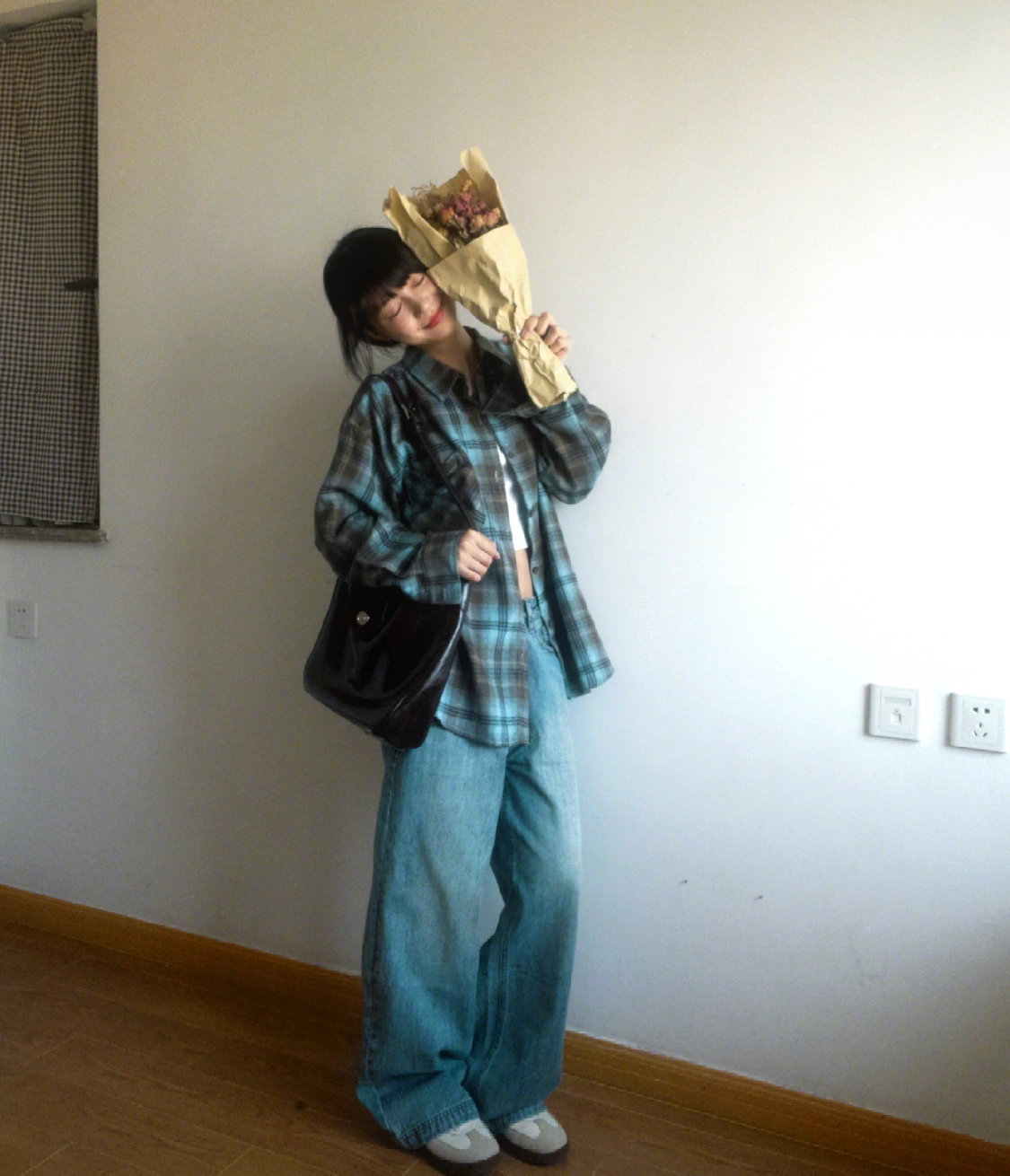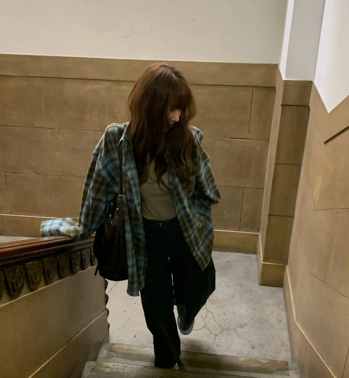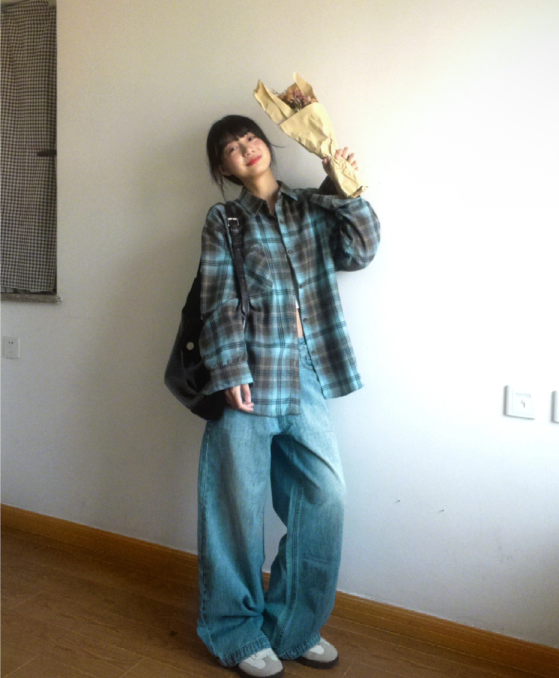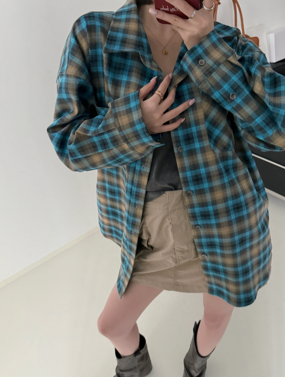 老米优品🎈3-5天。清新又复古!《蓝色调格纹oversize长袖衬衫》宽松落肩剪裁,不挑肩宽身形,显瘦效果一绝。CY260105A