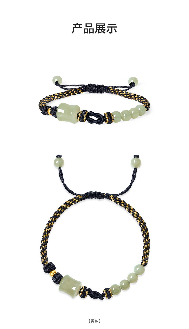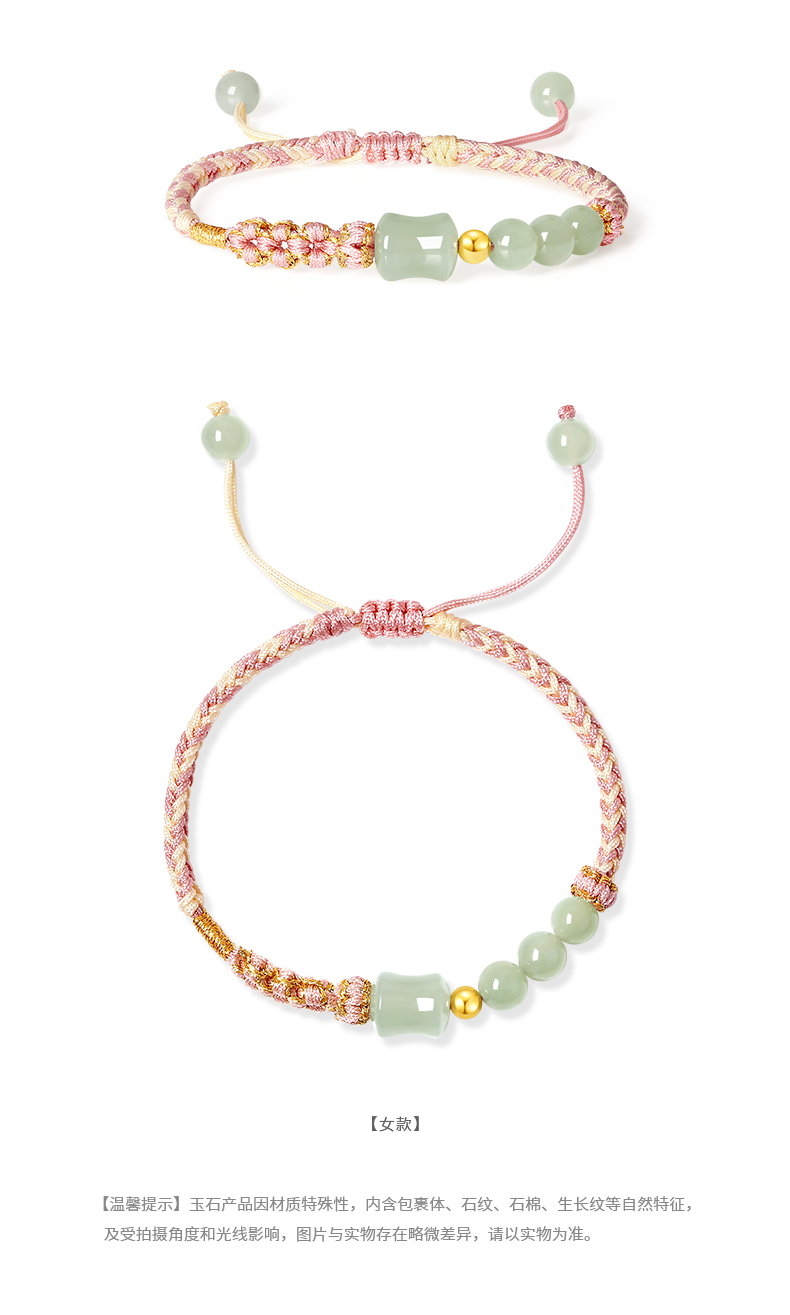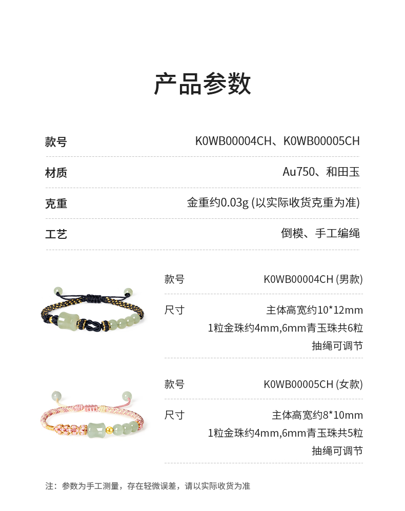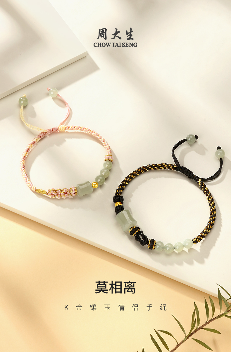 周大生18K黄金镶玉石和田青玉手链编织绳金珠情侣款手串生日礼物