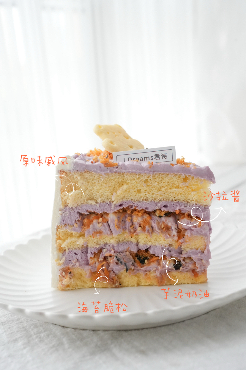 荔浦芋头做的芋泥奶油细腻香甜,芋泥脑袋要馋晕了吧,咸香口带着颗粒感的海苔脆松即丰富了口感也能解腻,可可爱爱的小熊饼干也是我们自己做的噢,咸甜适口诚意满满,是生日蛋糕最受欢迎的口味之一!