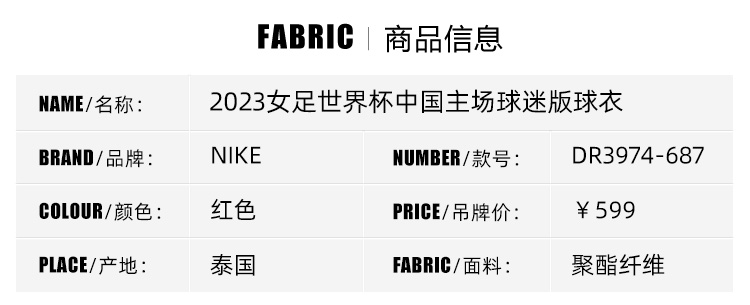 SFS 耐克正品2023中国女足主场球迷球衣足球服DR3974-687