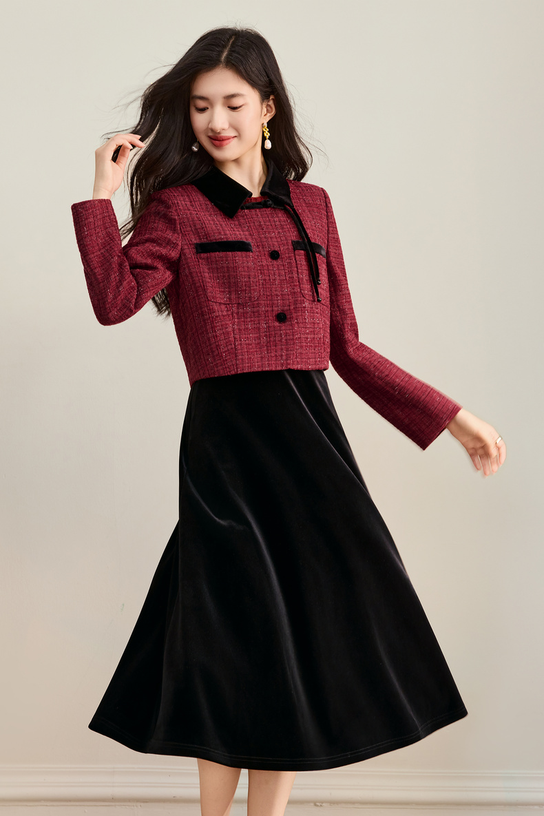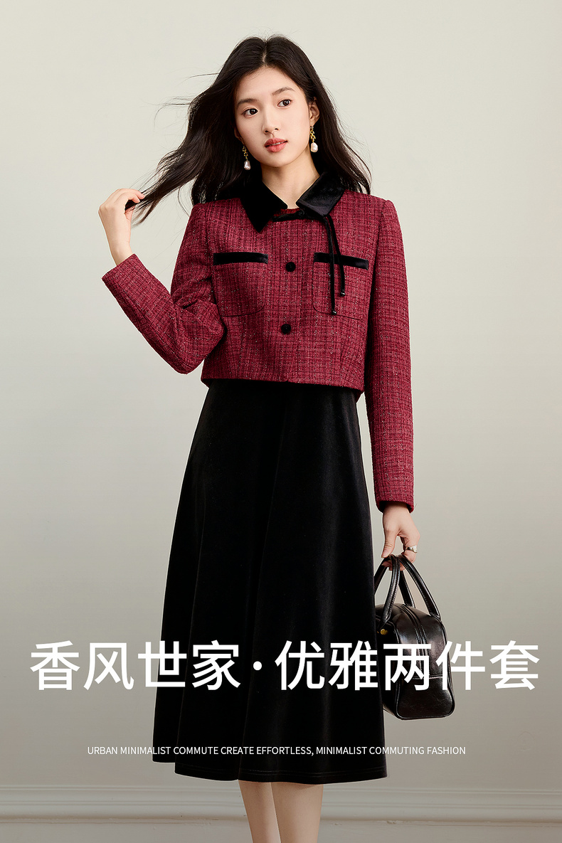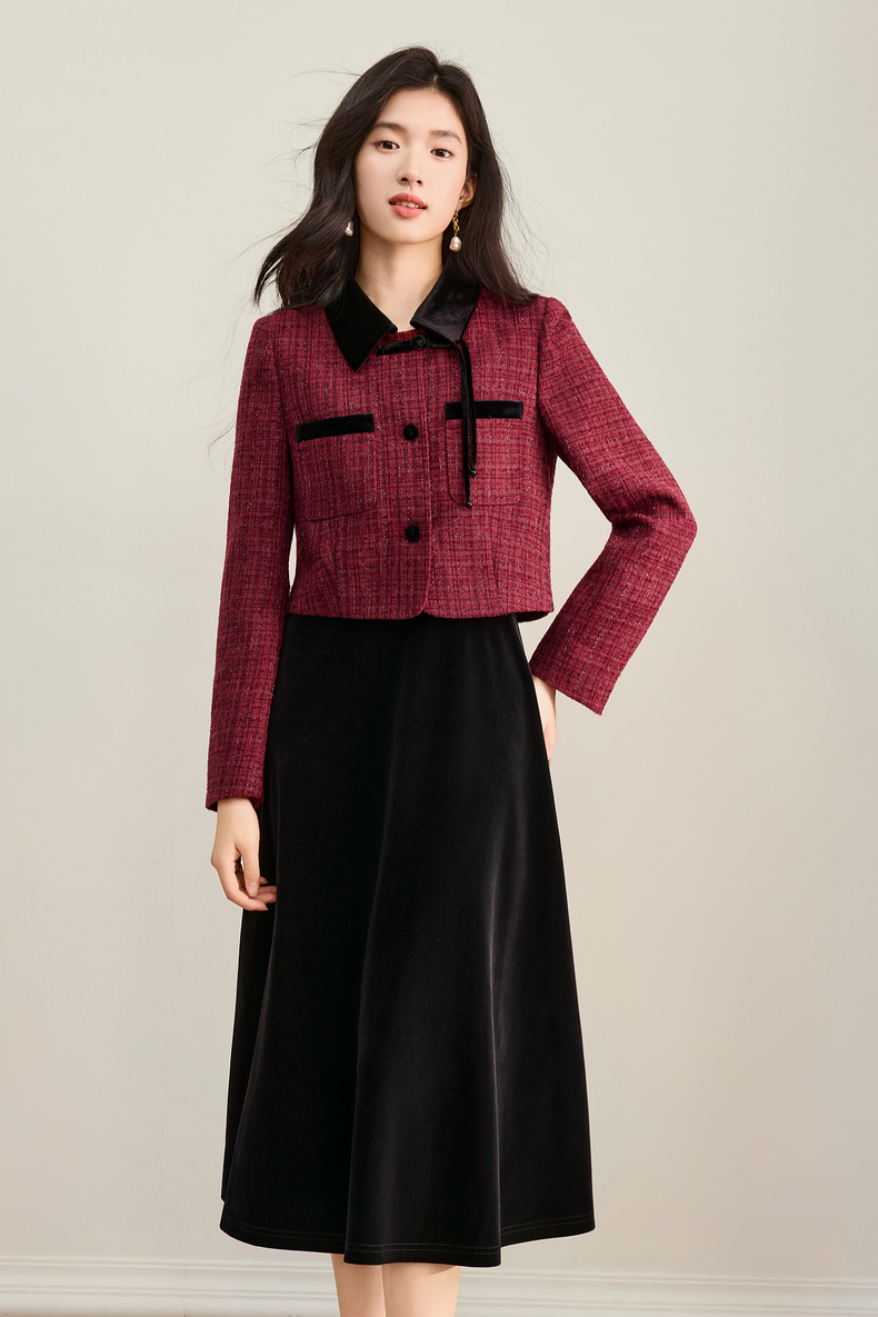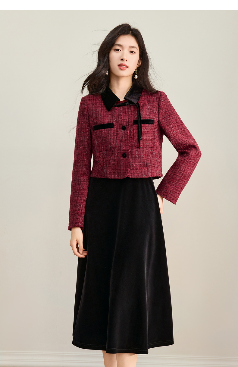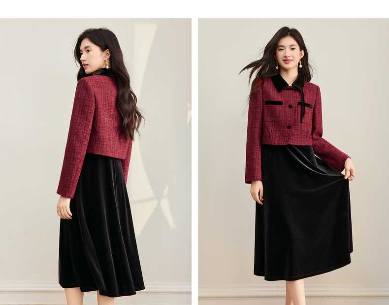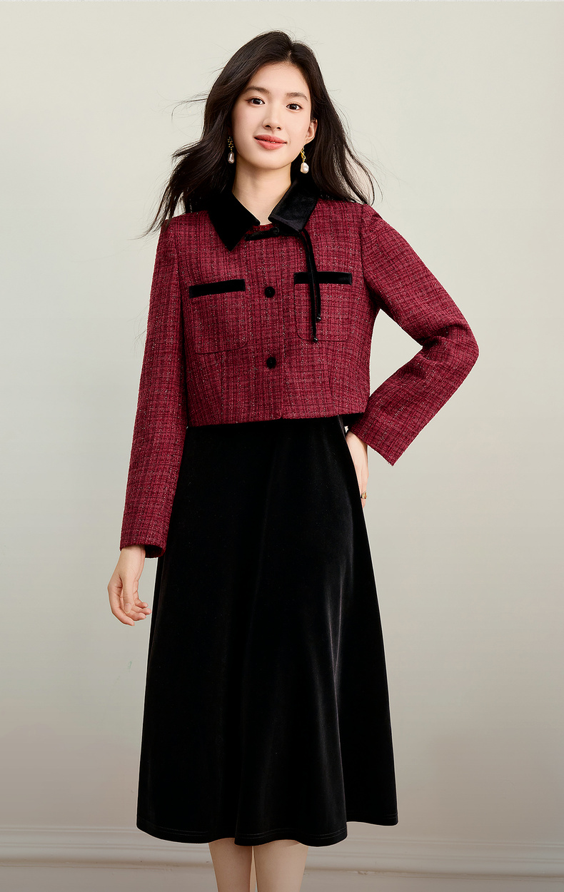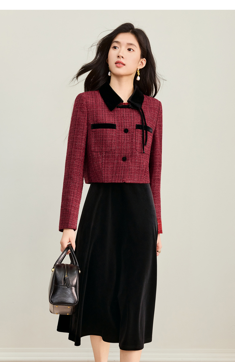 【内购】【免搭配套装】通勤小香风撞色翻领夹棉保暖短外套&丝绒吊带裙-154ZB3683