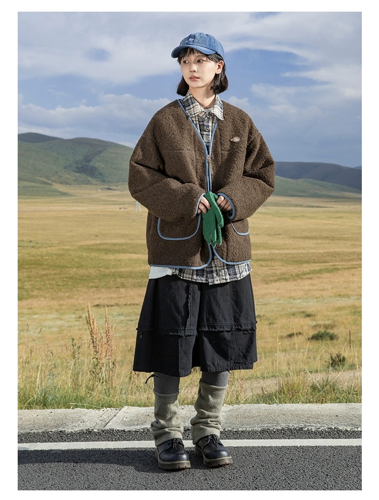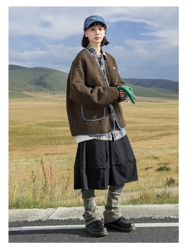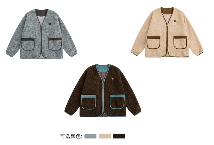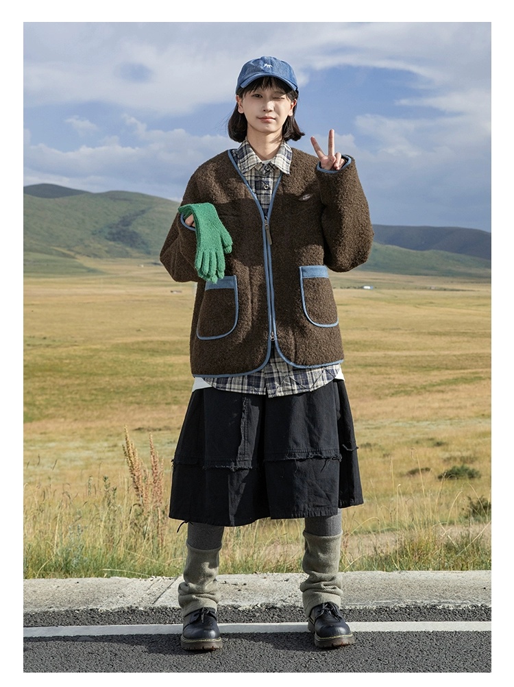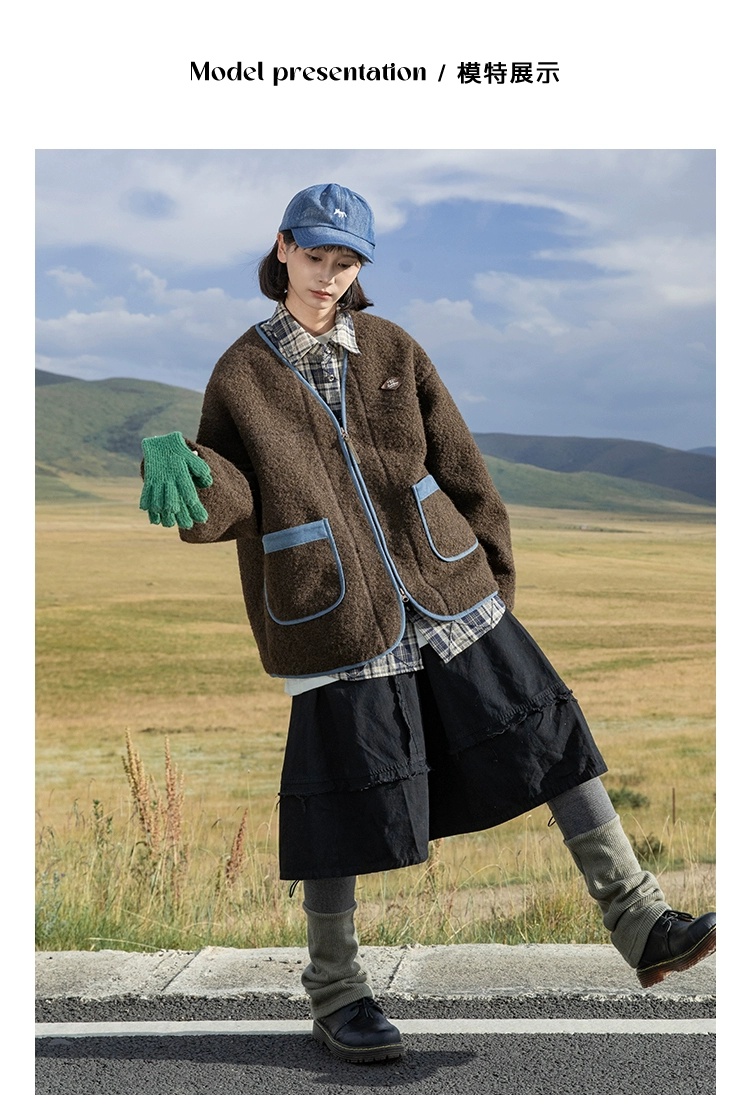 早乙女惠子saotome/STMWT244426/撞色V领工装羊羔毛开衫夹克