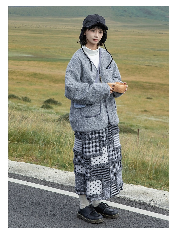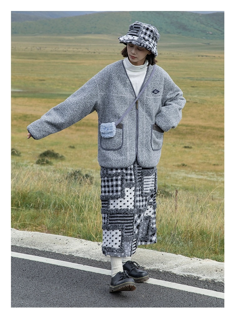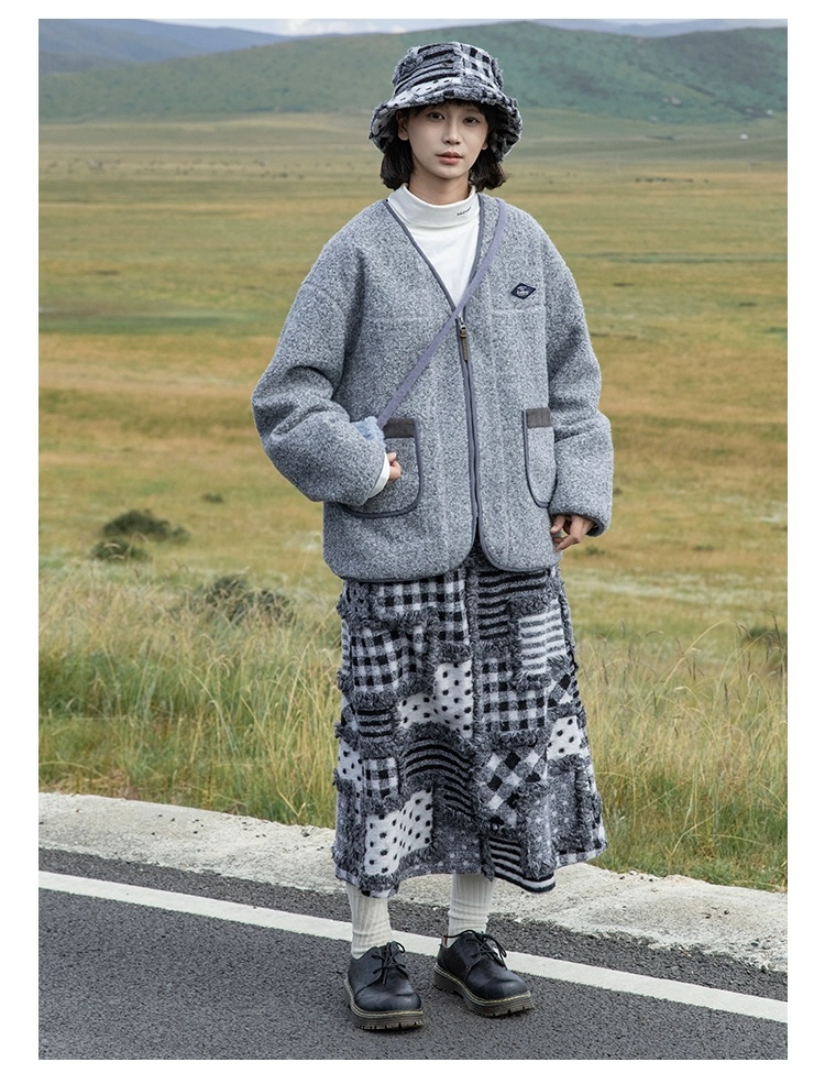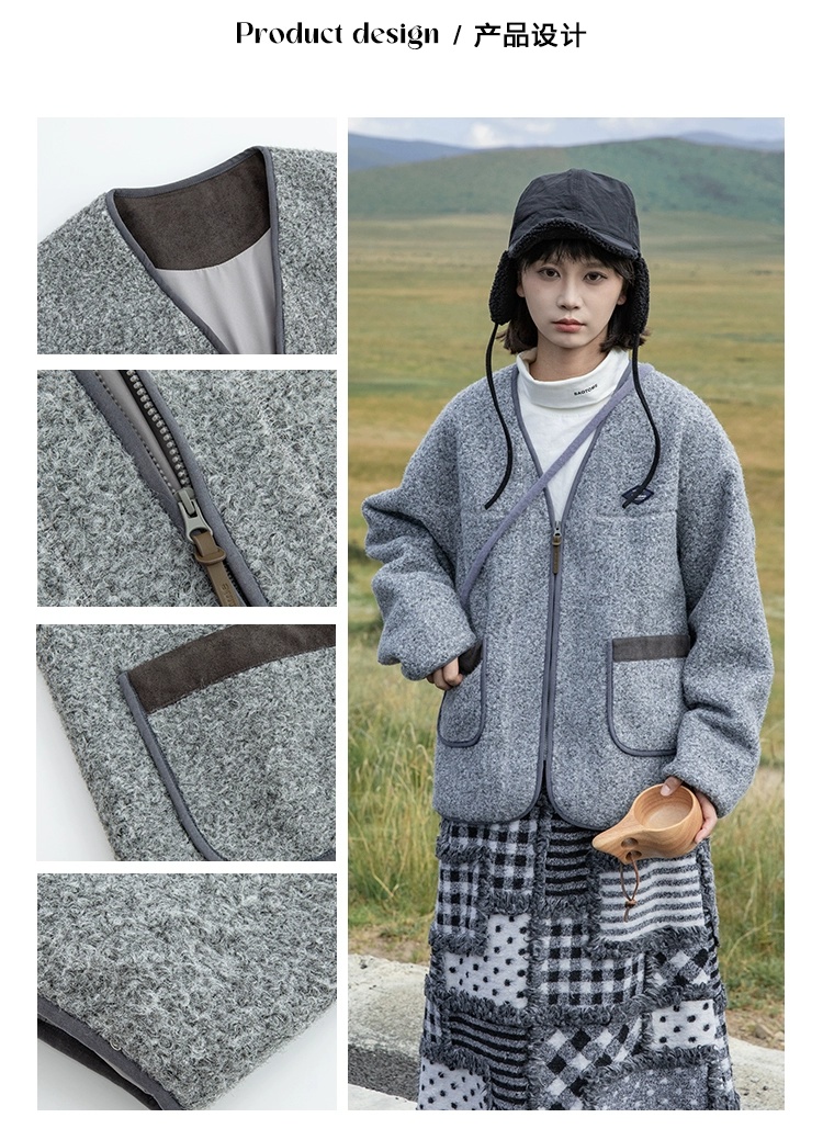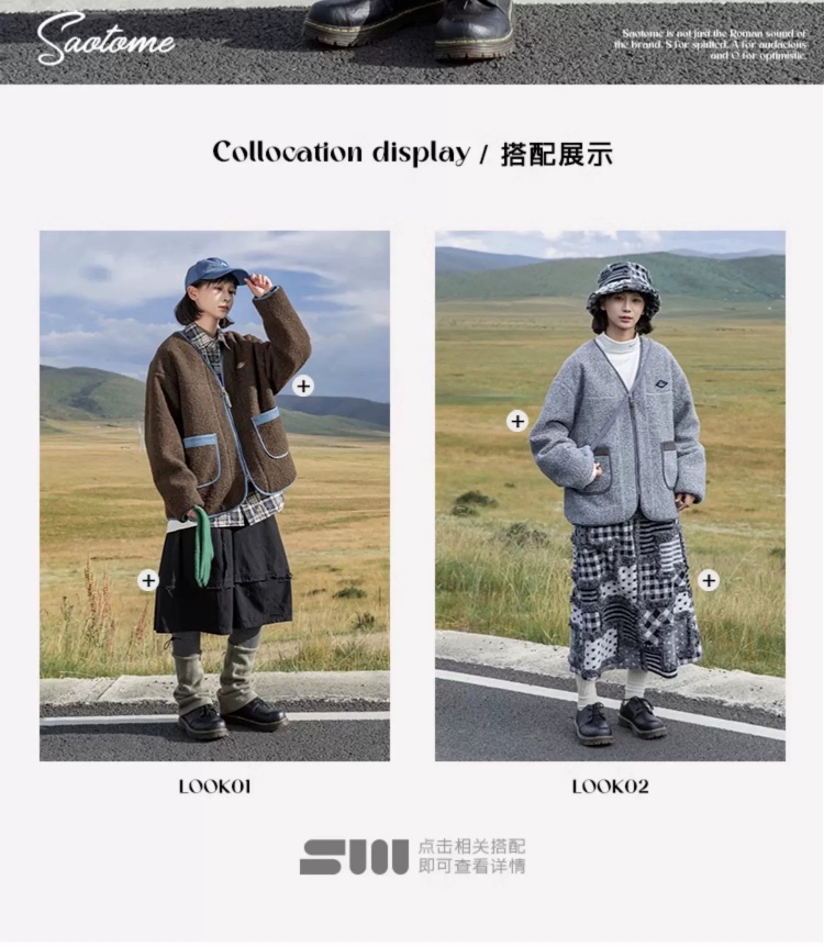 早乙女惠子saotome/STMWT244426/撞色V领工装羊羔毛开衫夹克
