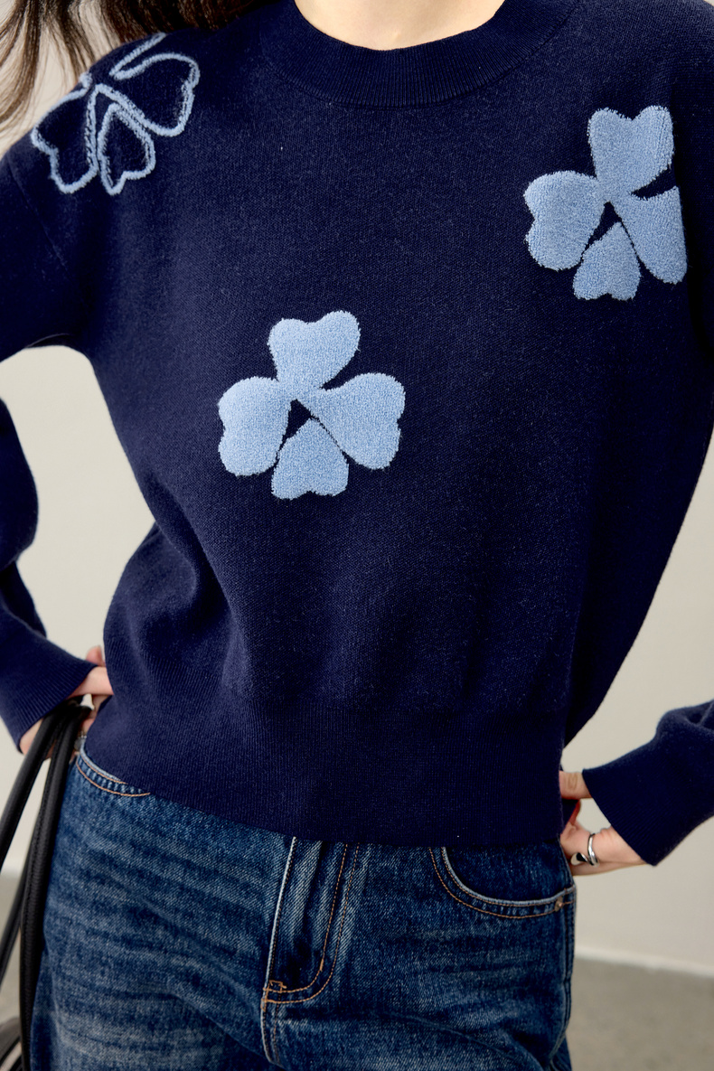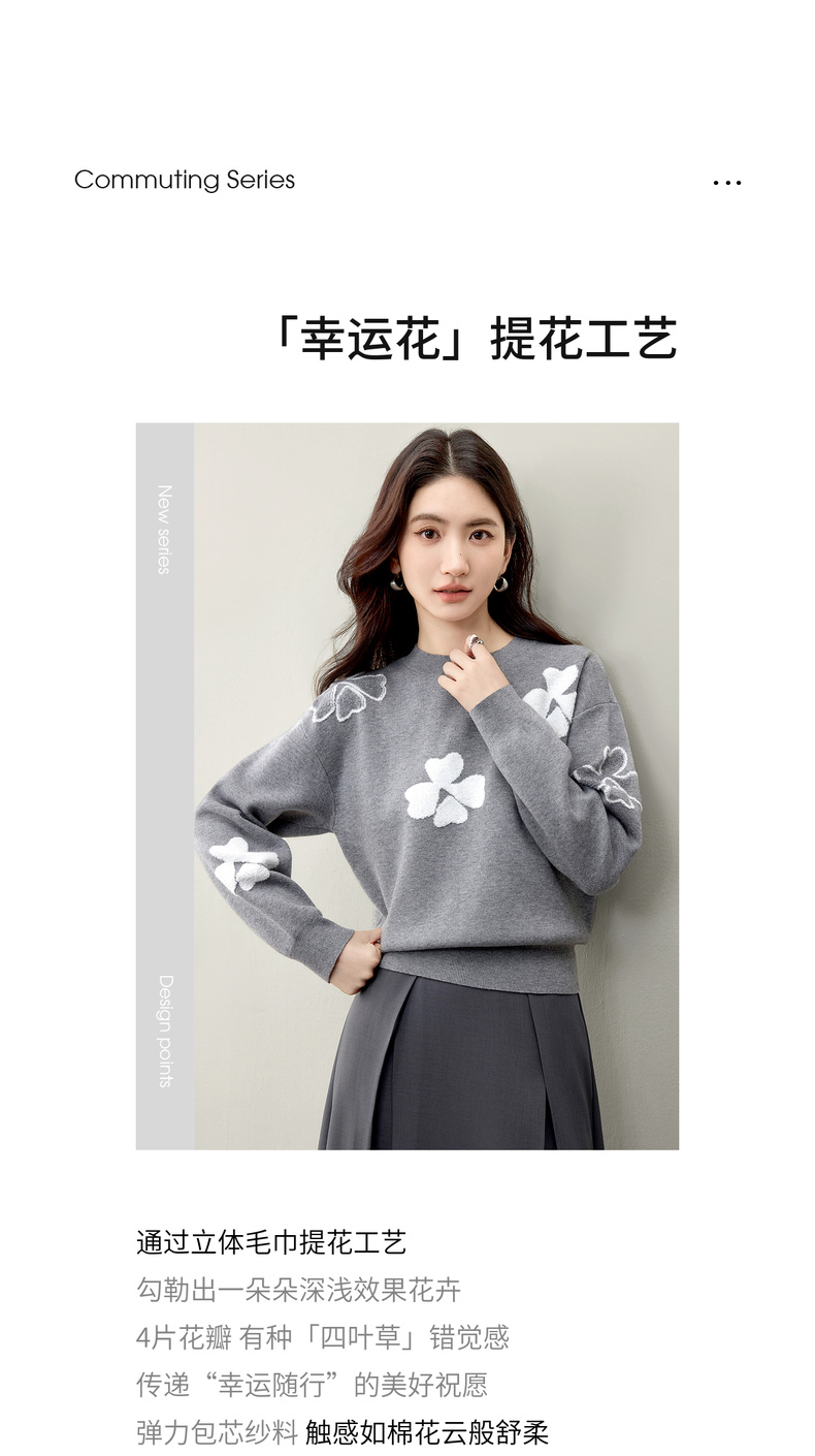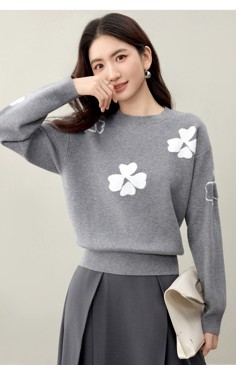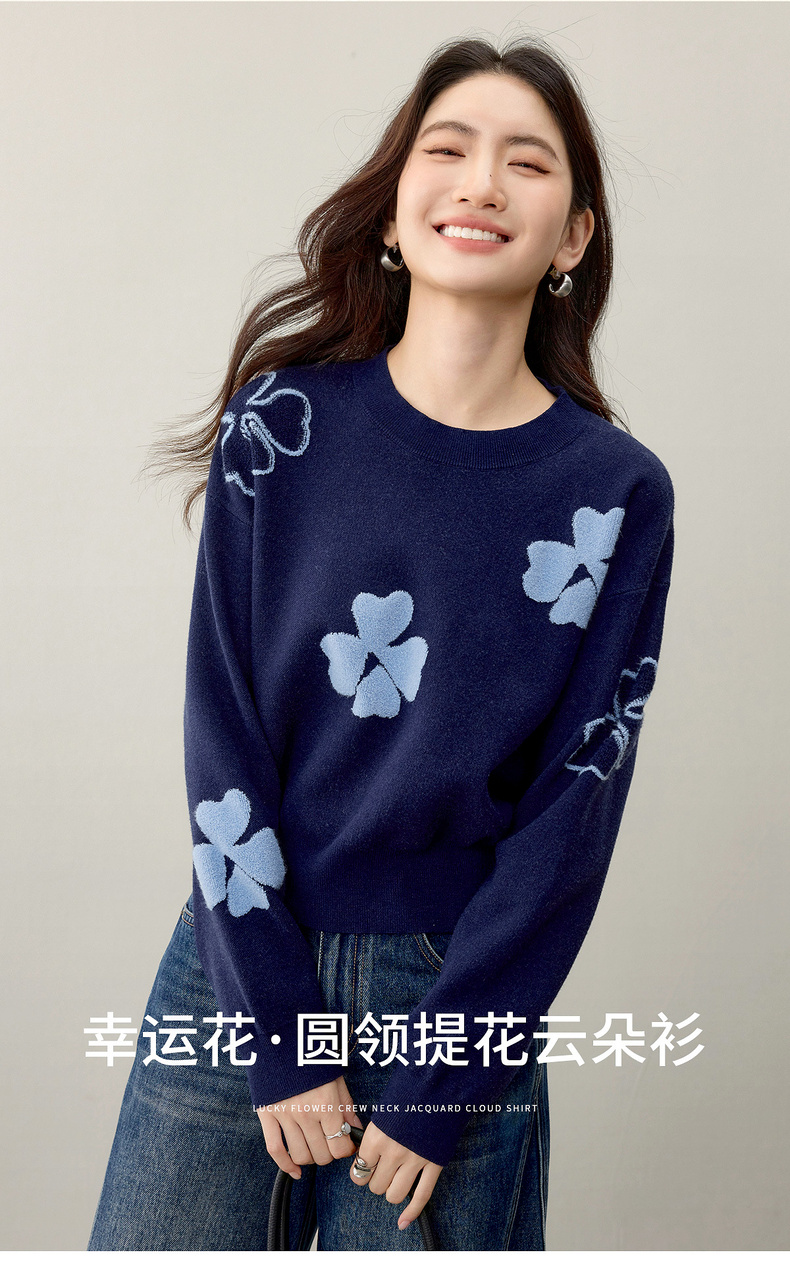 【内购】【幸运花】简约通勤圆领撞色花卉提花落肩袖弹力芝麻底包芯纱毛衣-W53EE2844