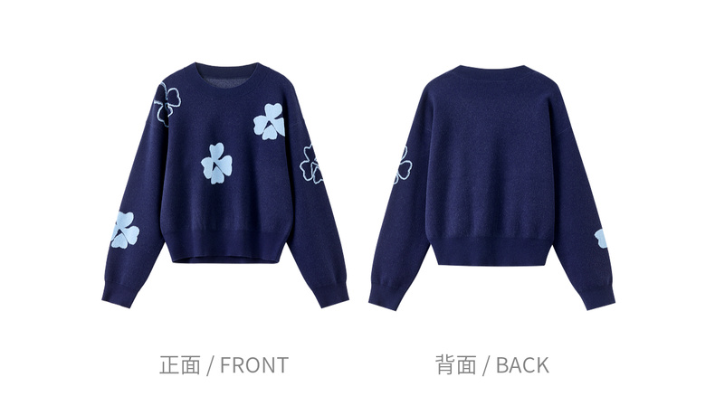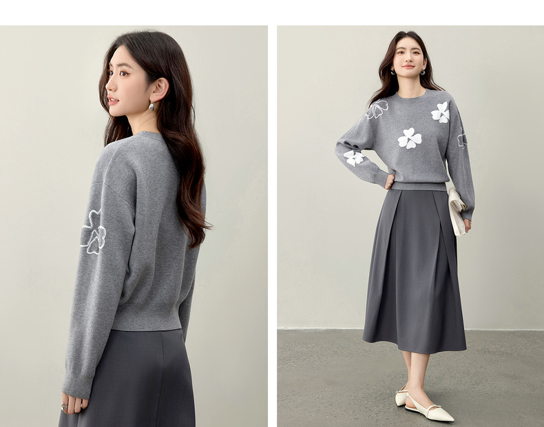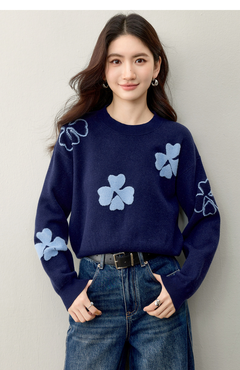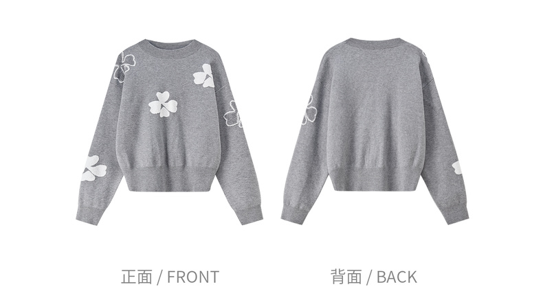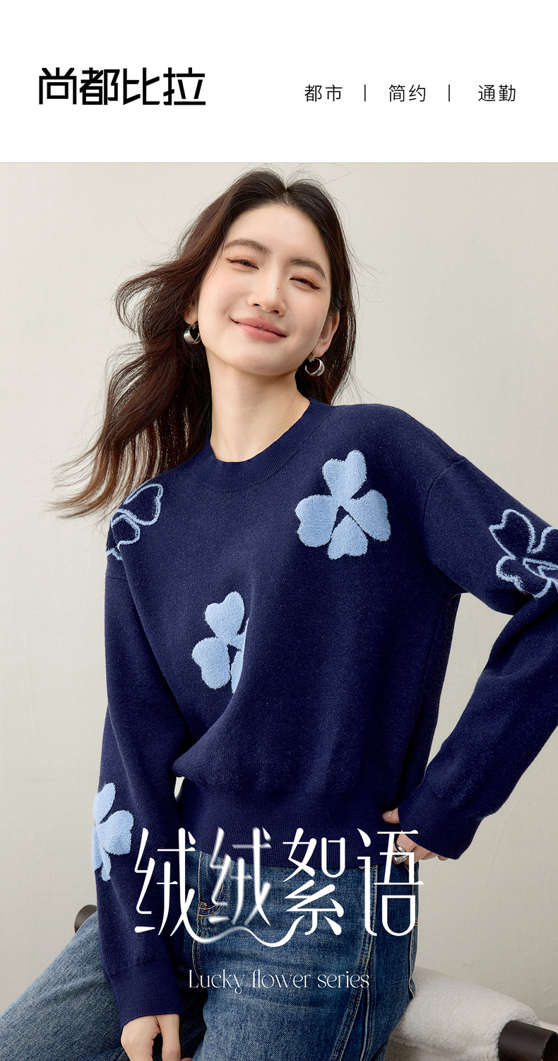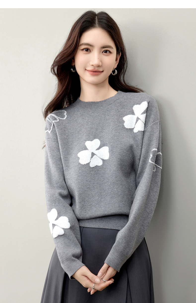 【内购】【幸运花】简约通勤圆领撞色花卉提花落肩袖弹力芝麻底包芯纱毛衣-W53EE2844