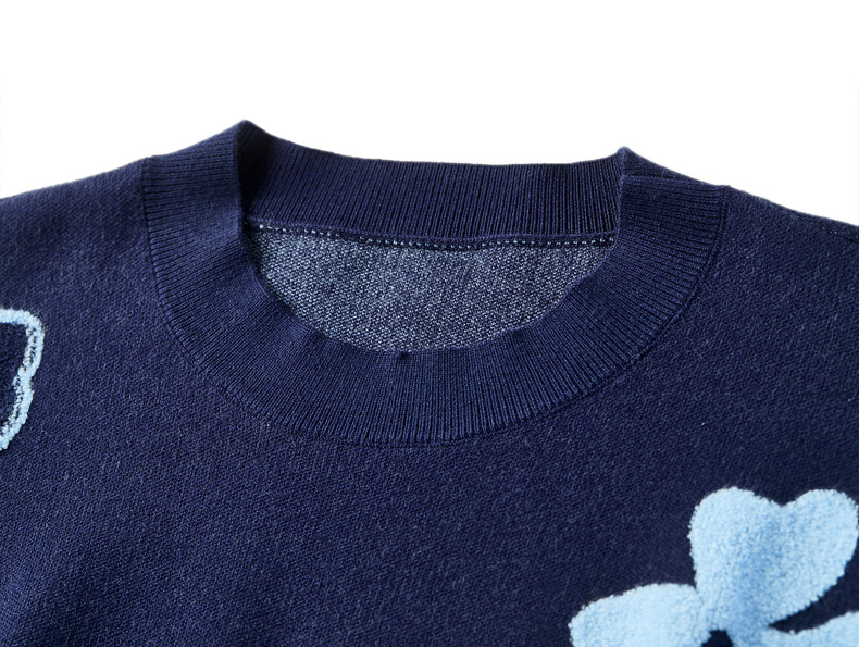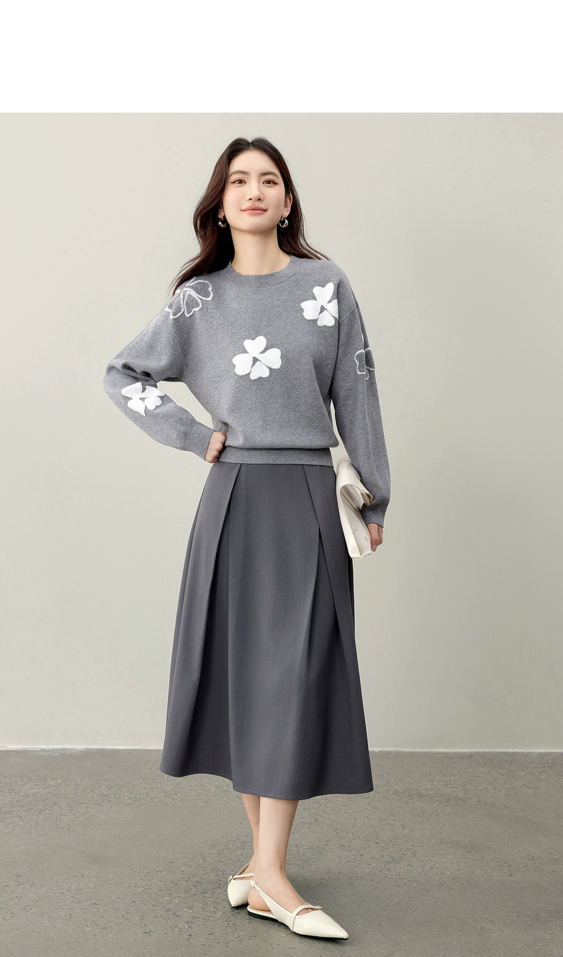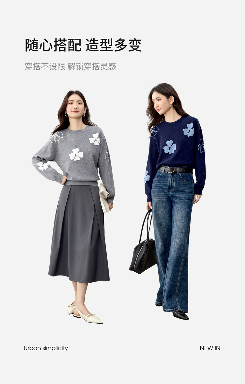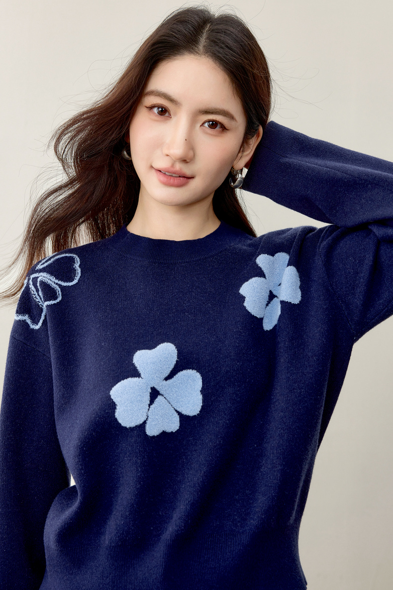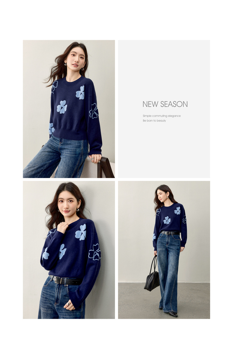 【内购】【幸运花】简约通勤圆领撞色花卉提花落肩袖弹力芝麻底包芯纱毛衣-W53EE2844