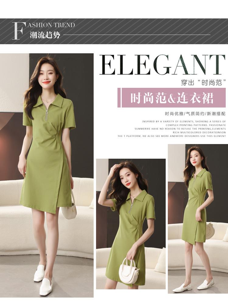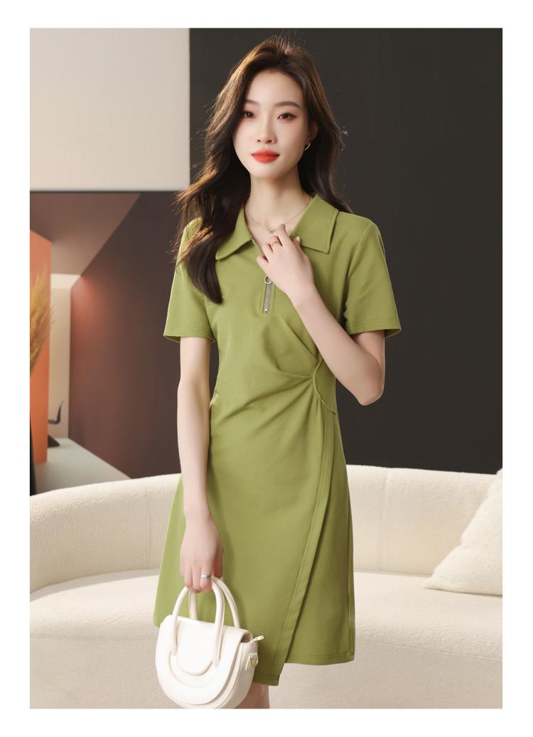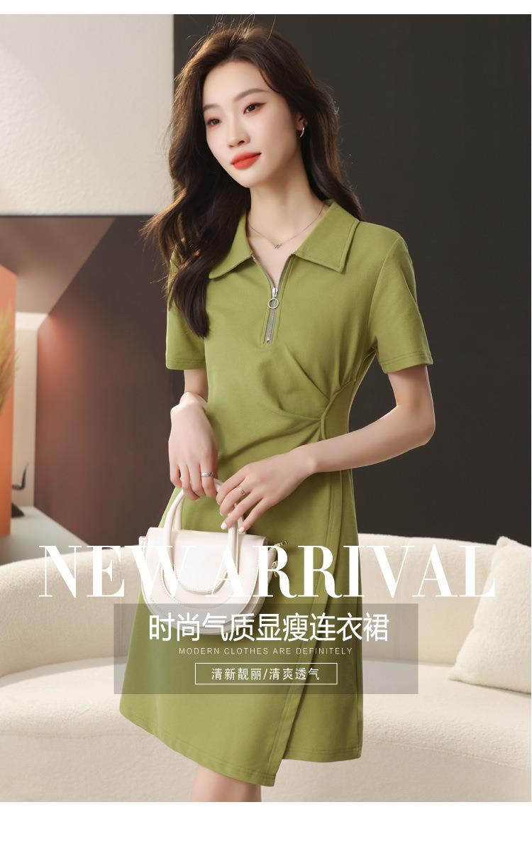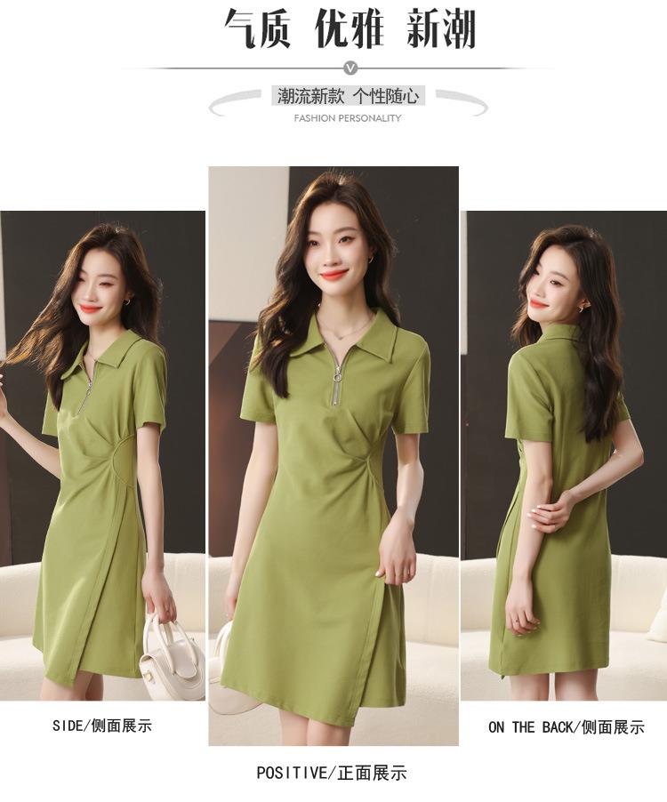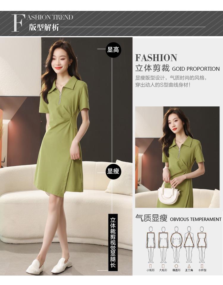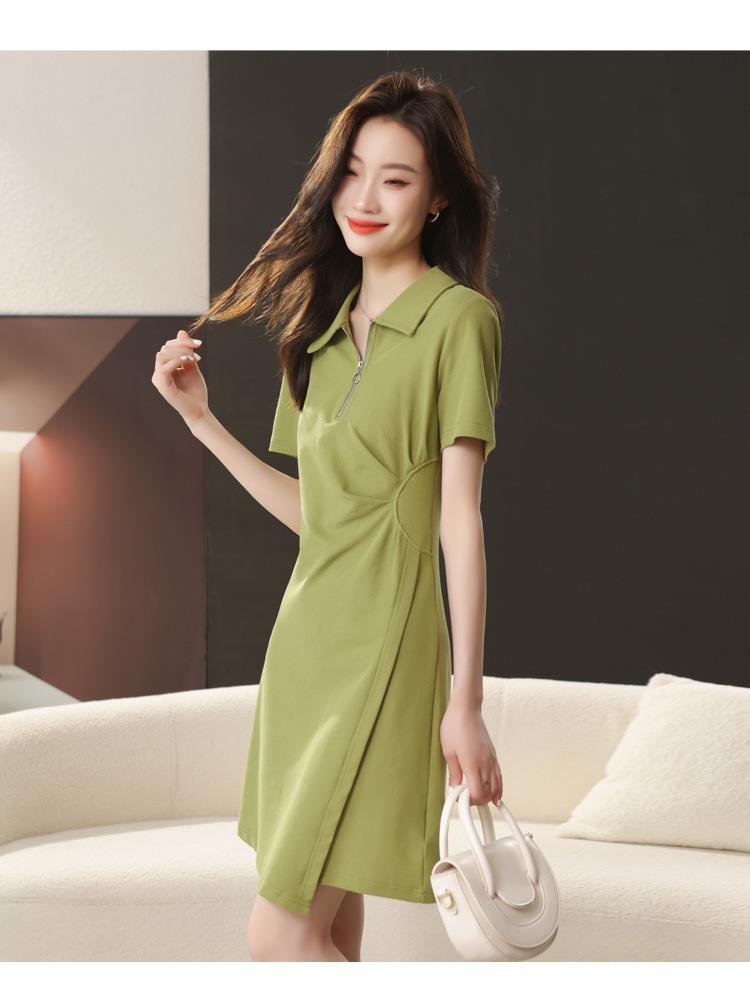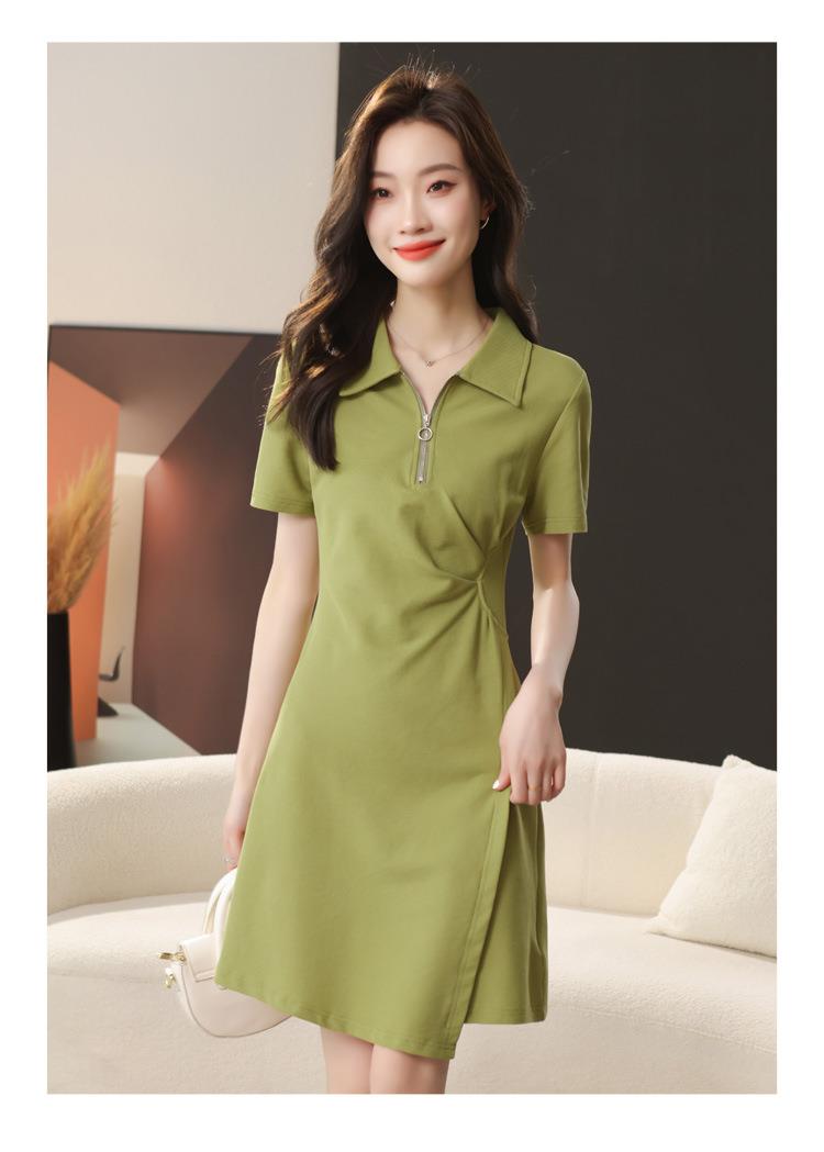 Polo领连衣裙夏季短袖2024新款女装绿色短袖高腰显瘦褶皱A字裙子