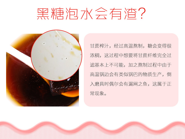 【温馨提示】如有少量沉淀,漂浮物,系甘蔗成分,可放心食用。因甘蔗品种不同,熬制火候,自然氧化程度均有不同,导致糖块的颜色,甜度会有差异。