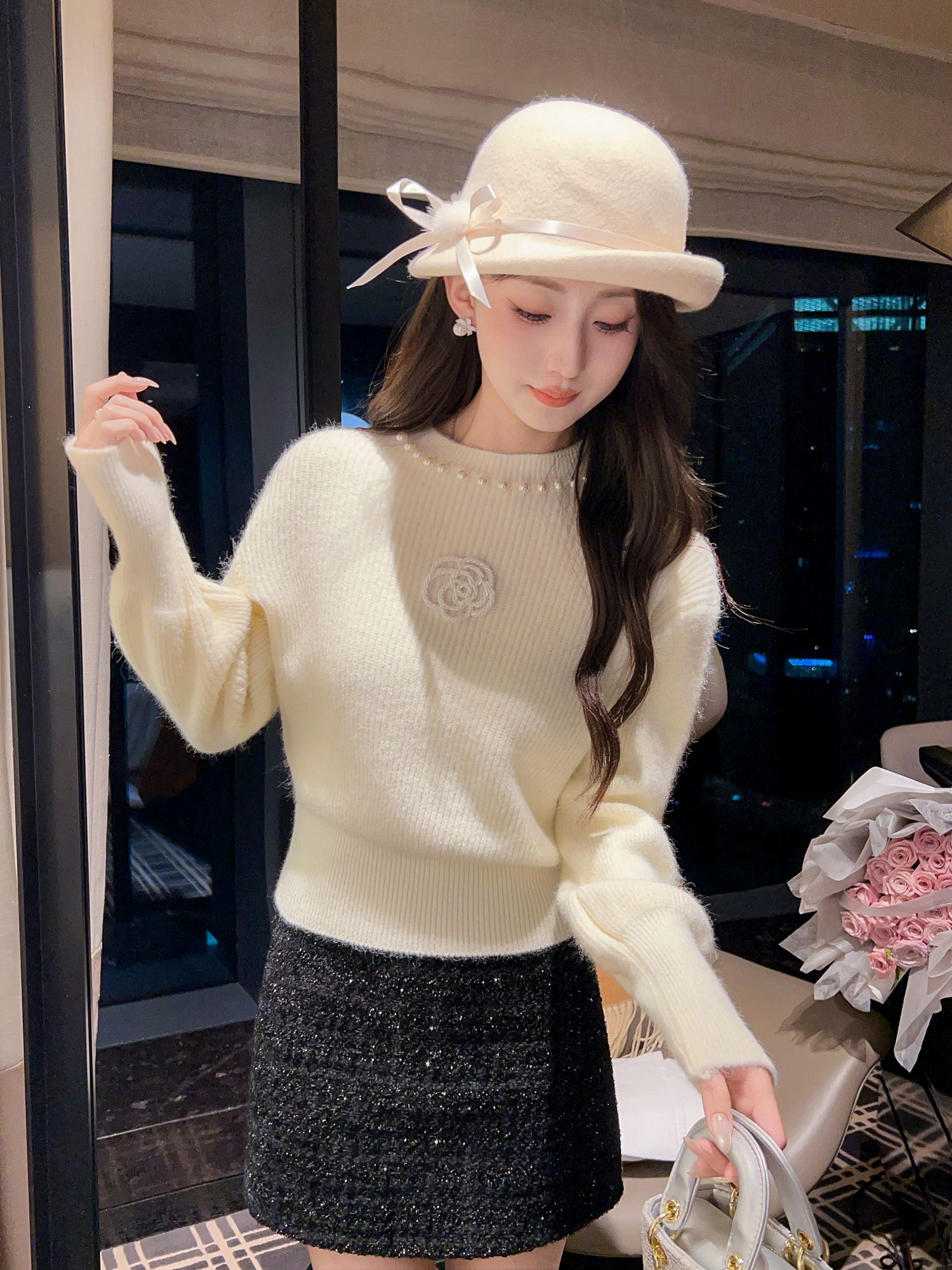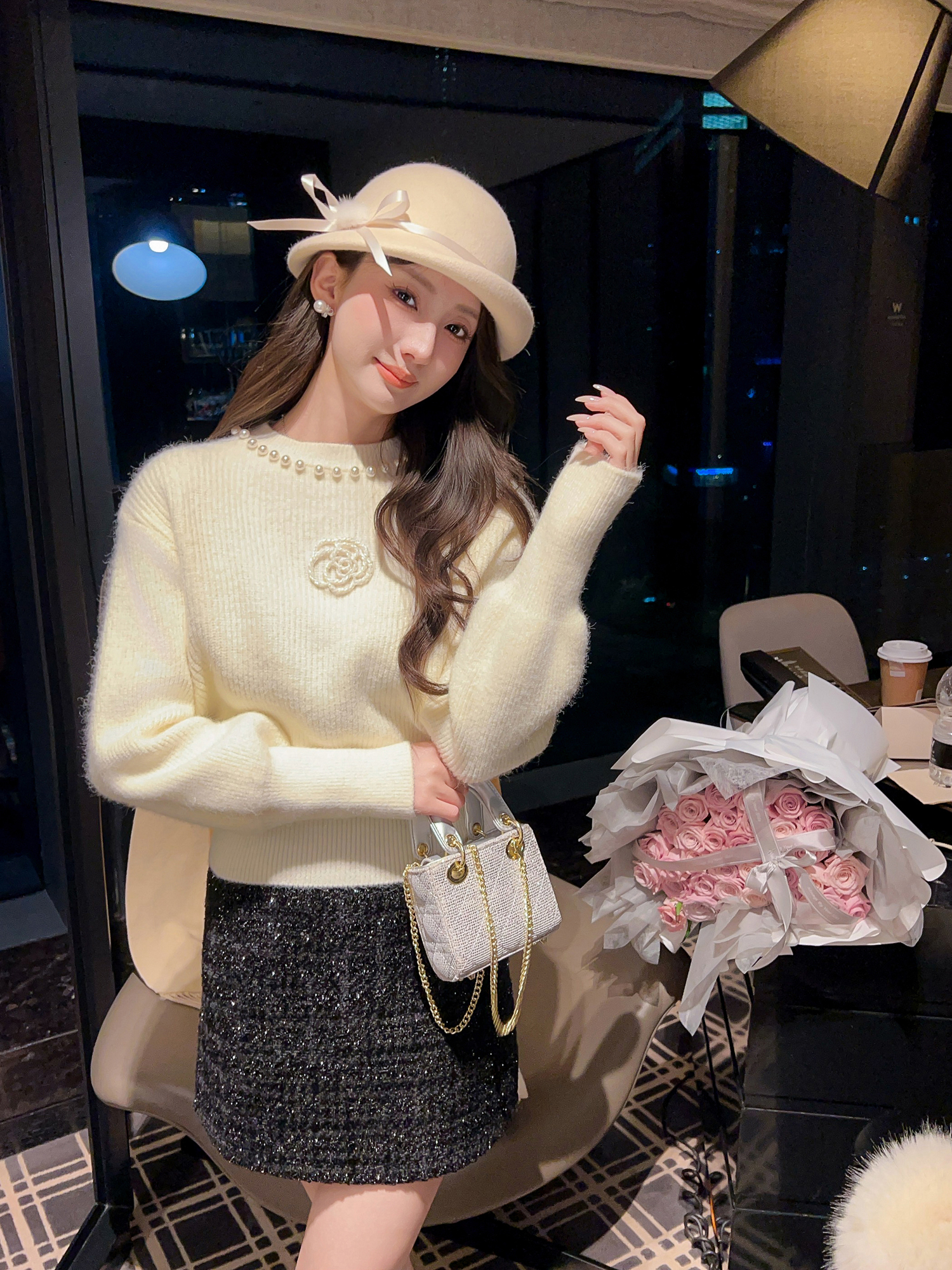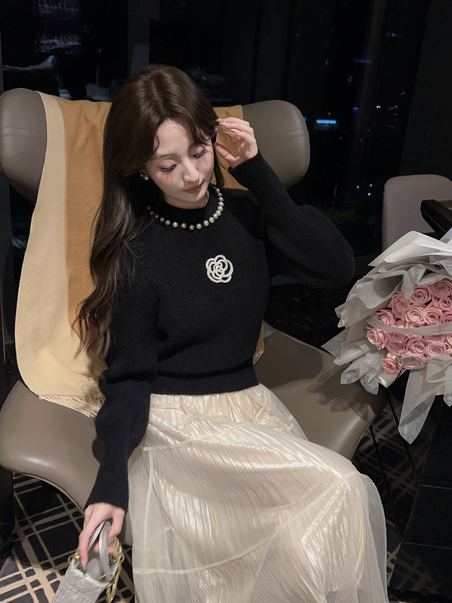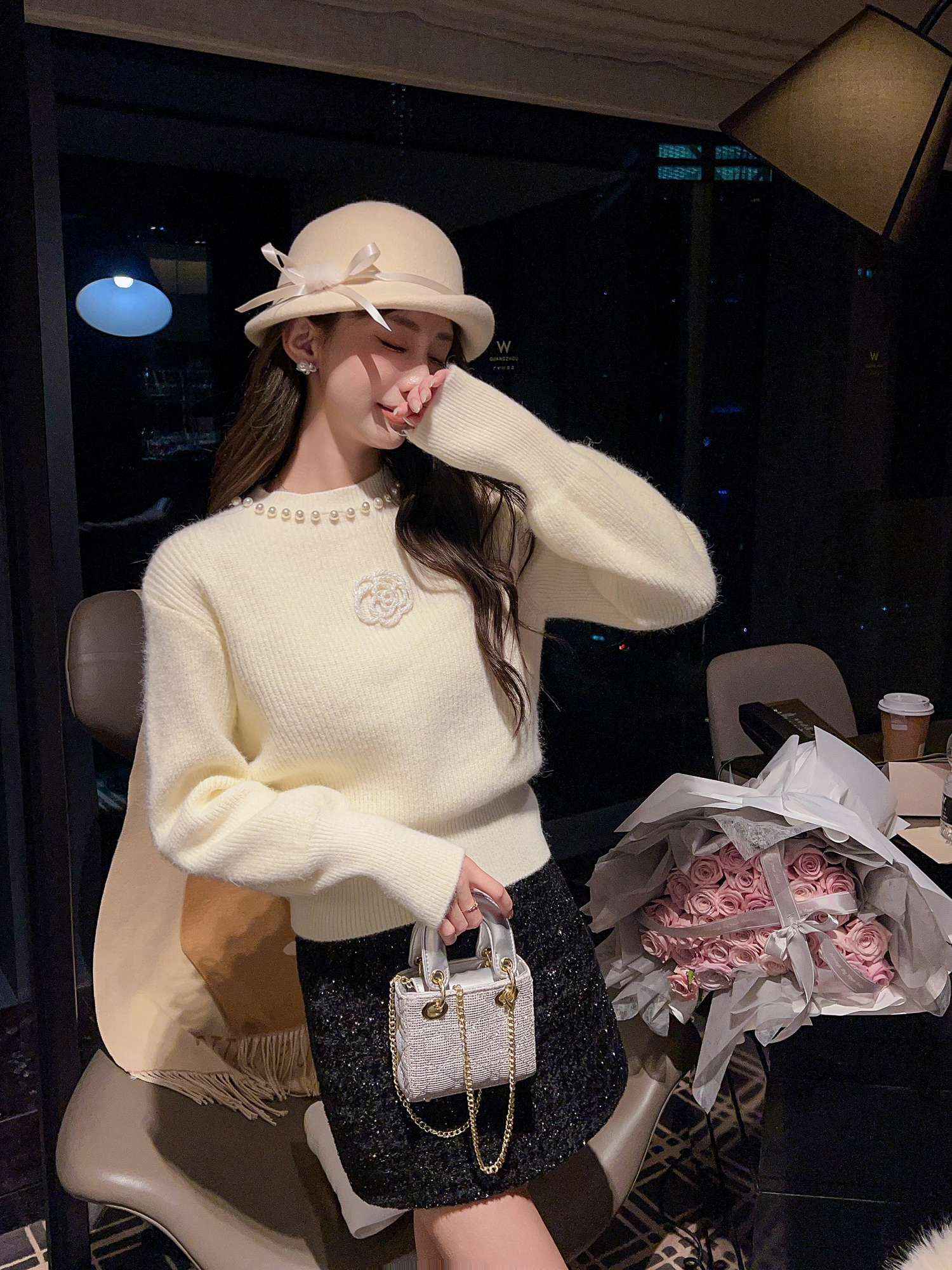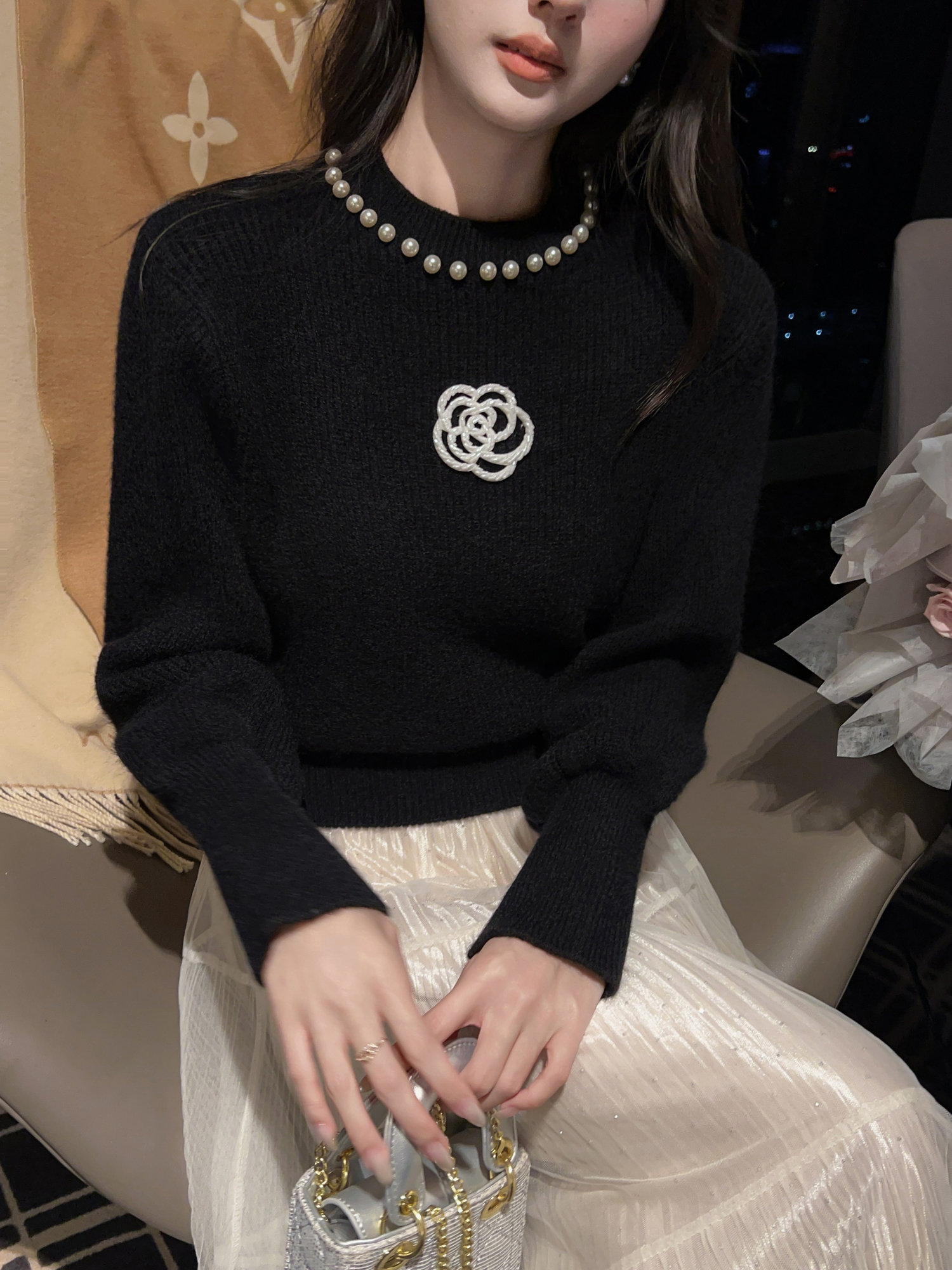 张心子【黑白柏林】赫本风气质高级山茶花珍珠领毛衣 U2512004