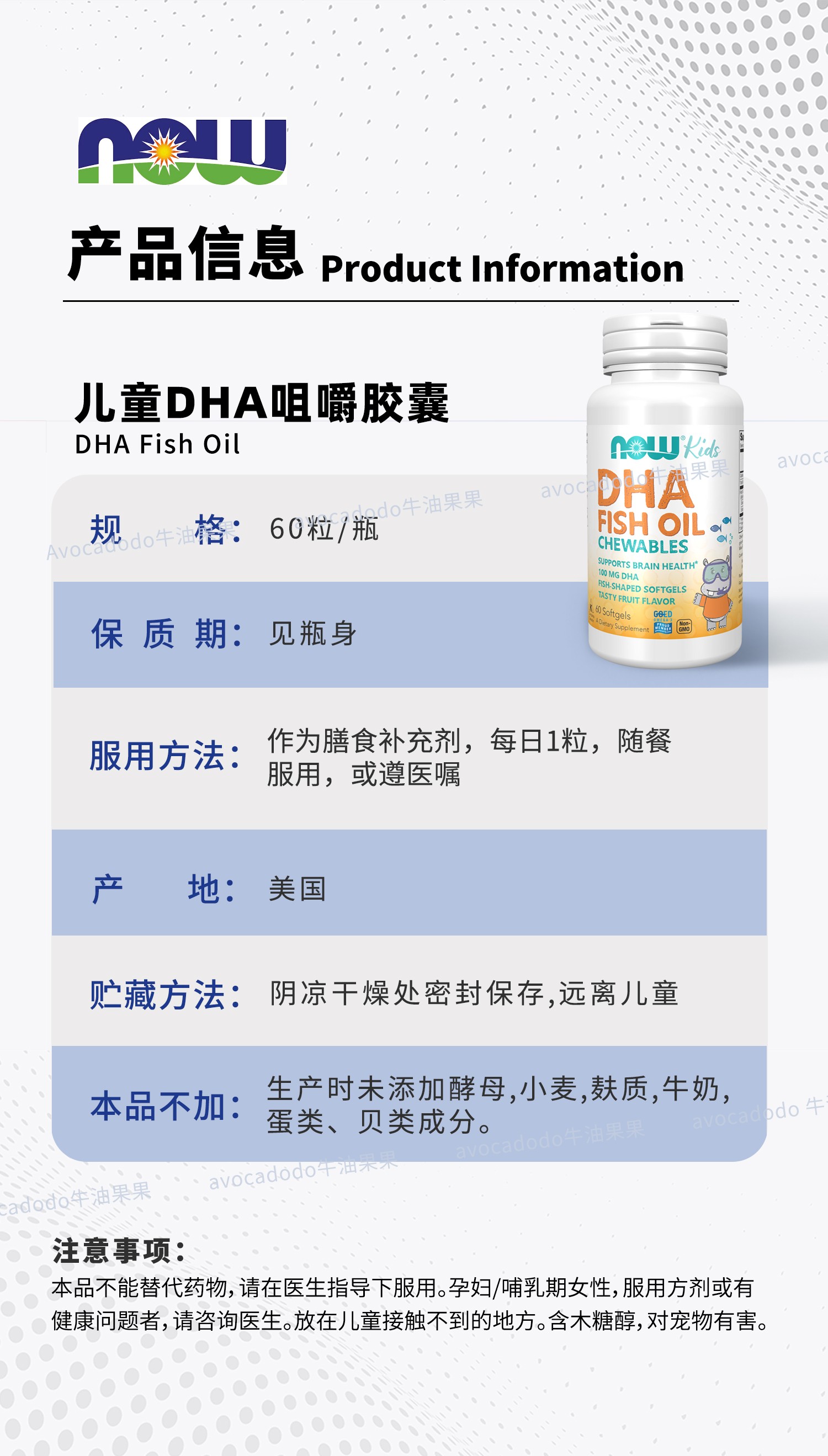 保税仓发货诺奥Now foods儿童DHA Omega3牛油果果桥本100mg60粒