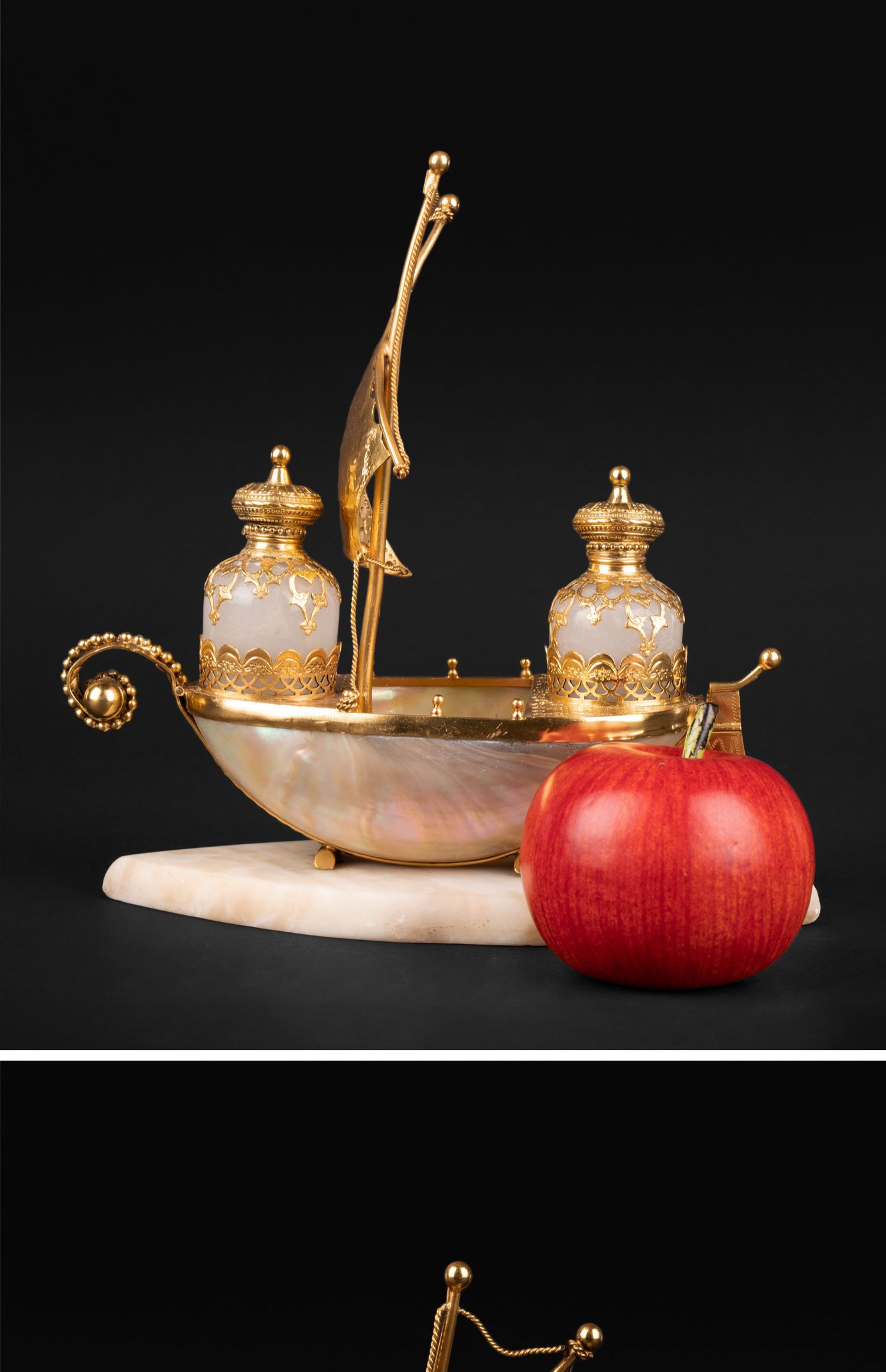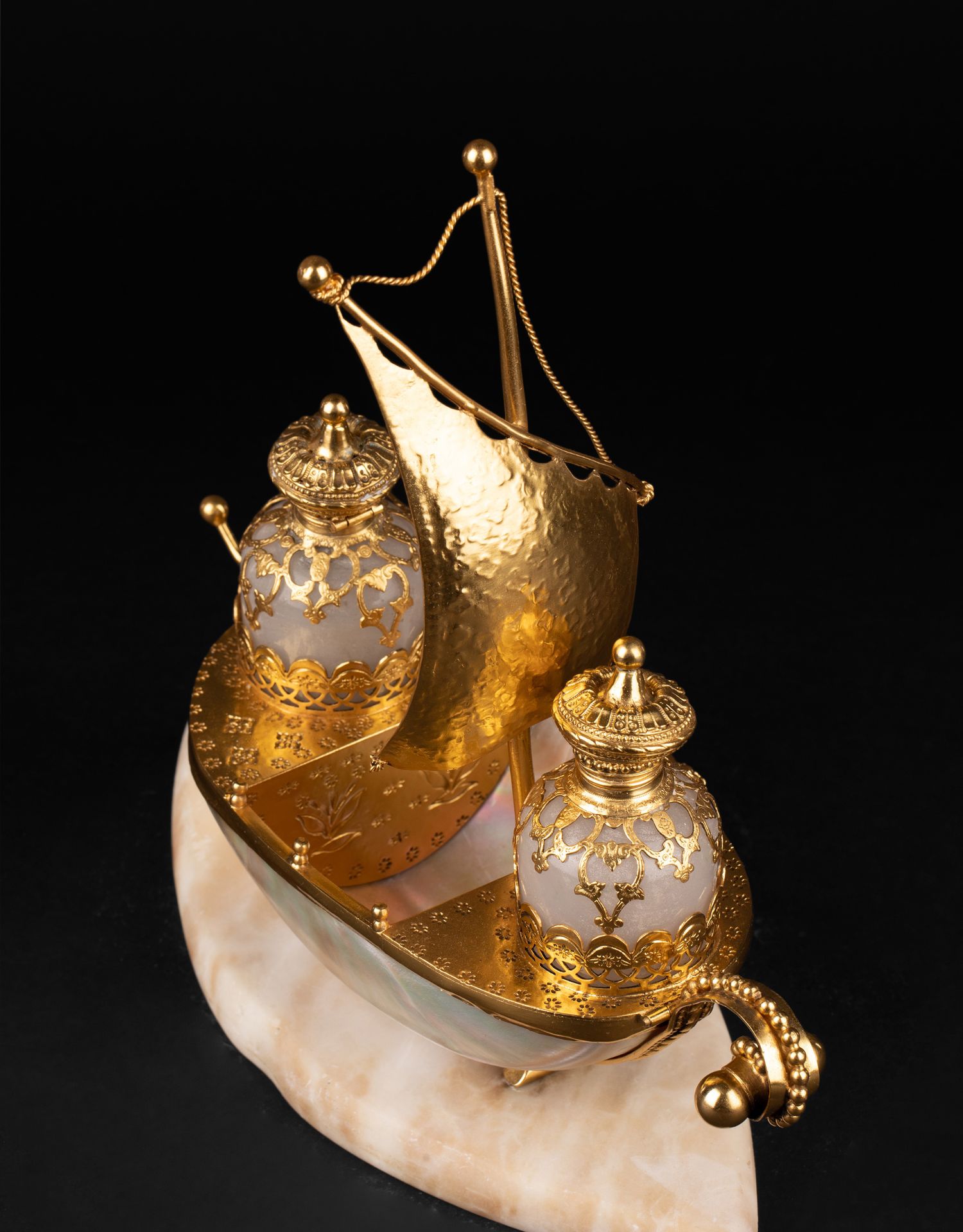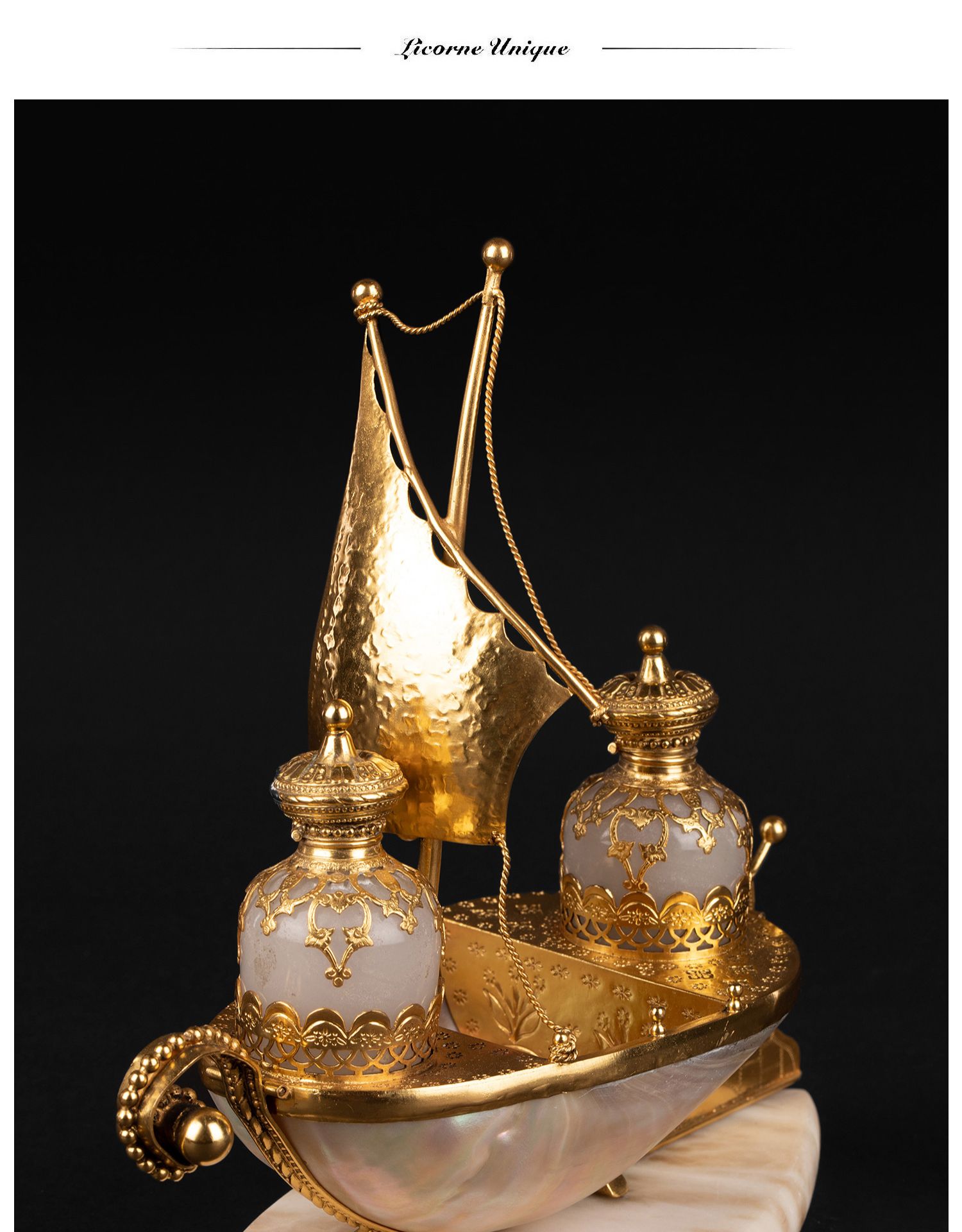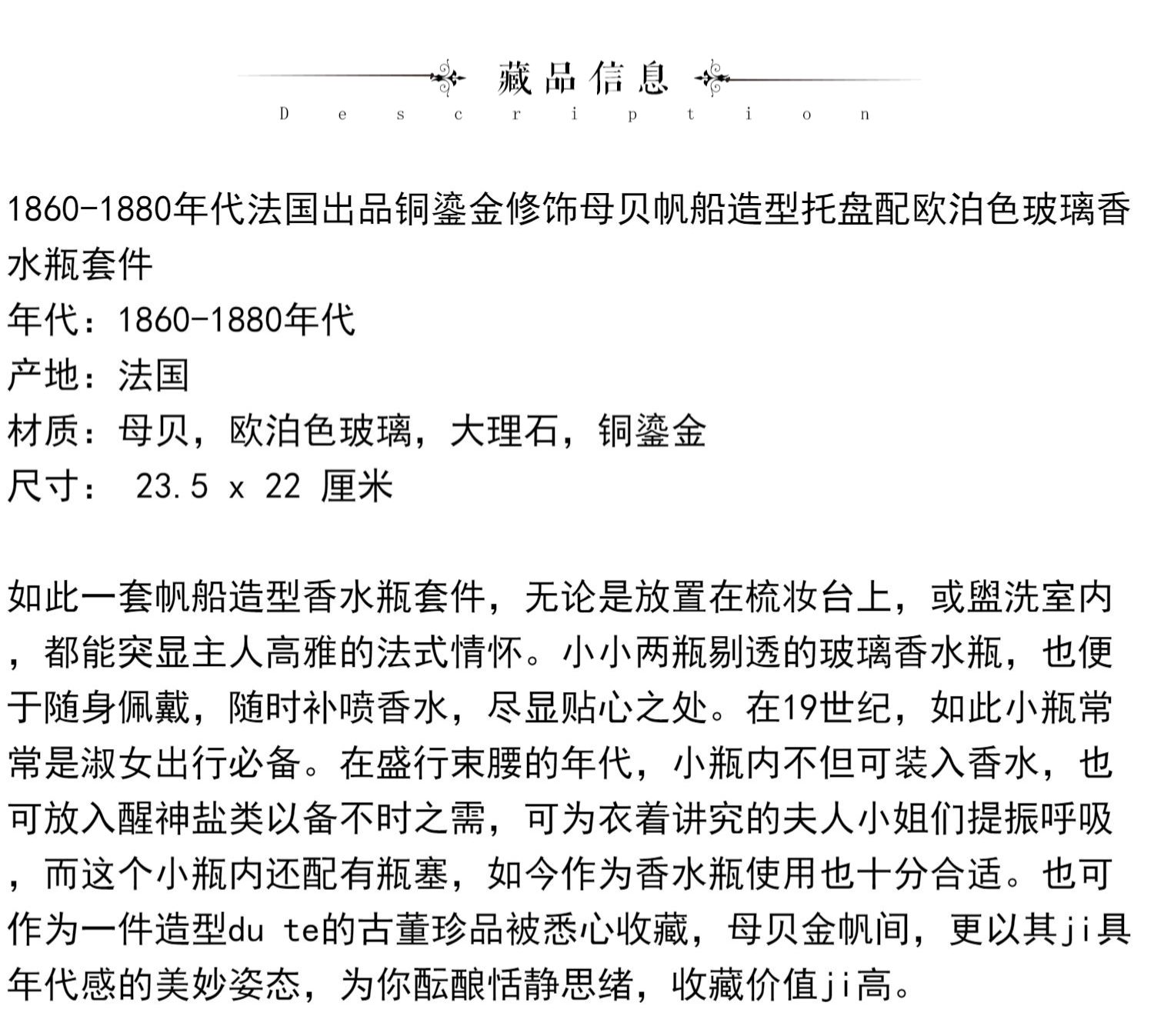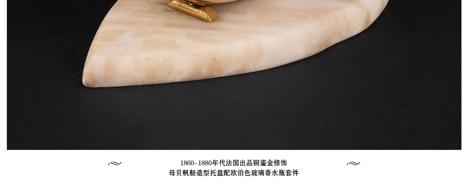 独角鹿西洋古董法国铜鎏金母贝帆船造型托盘欧泊色玻璃香水瓶套装