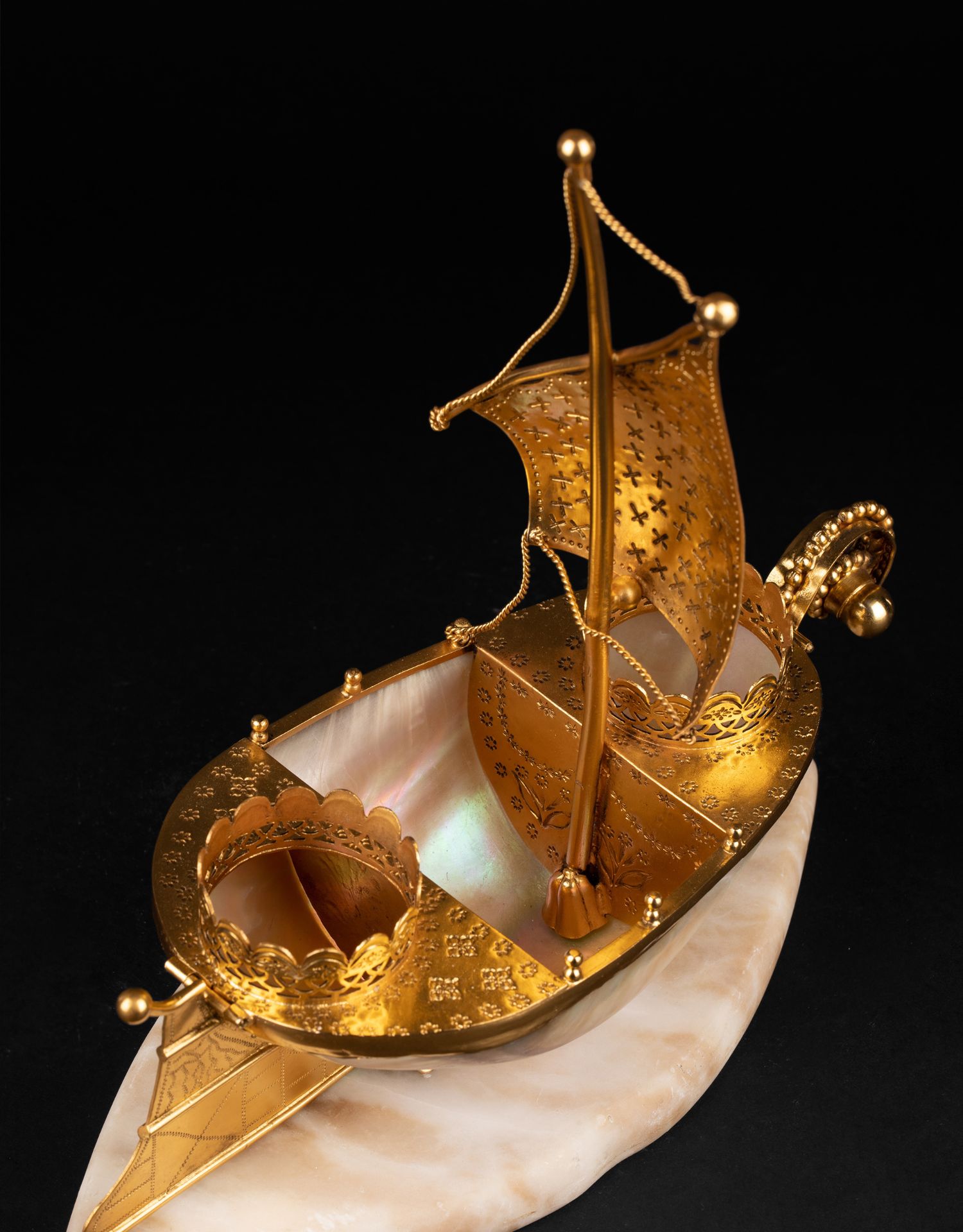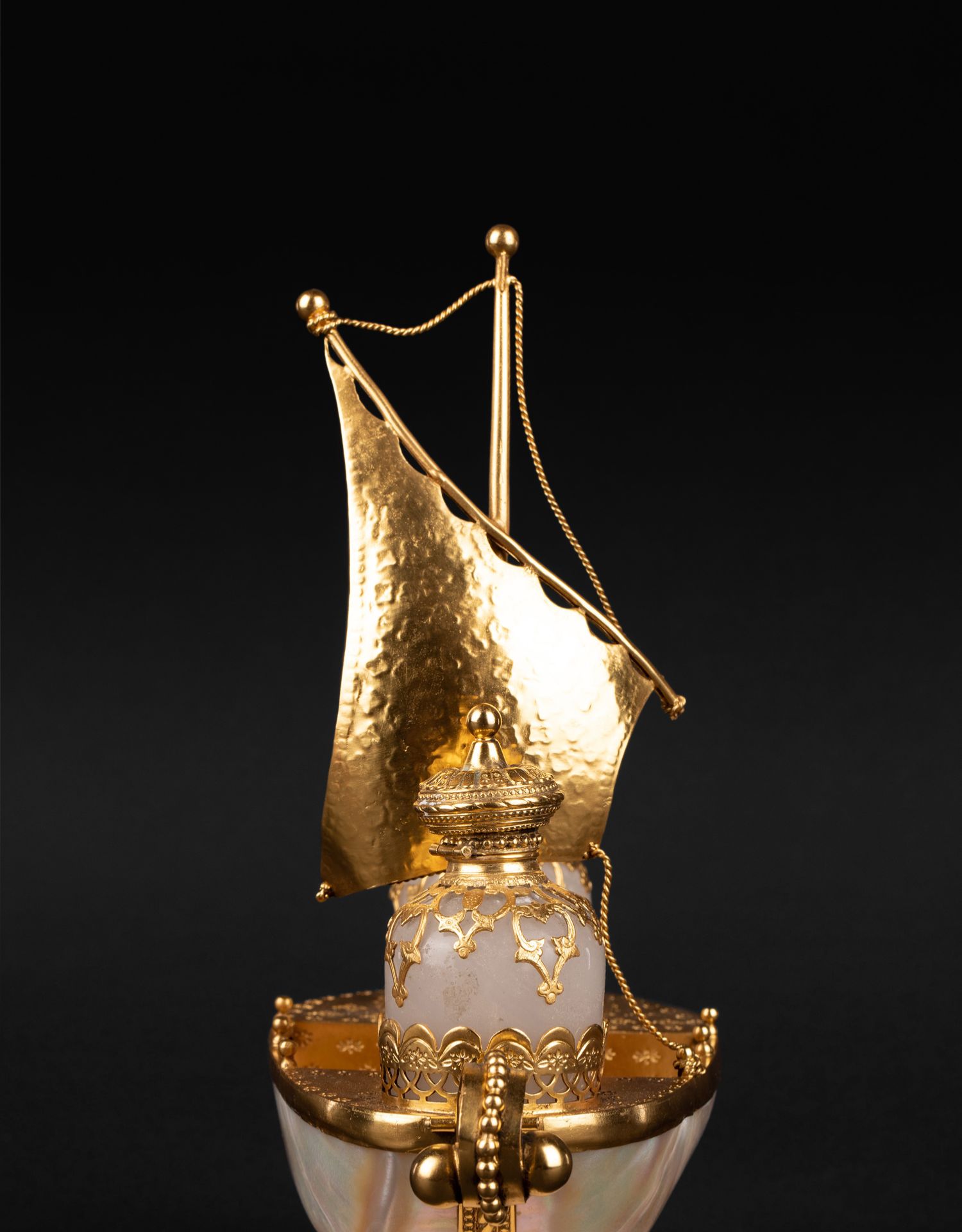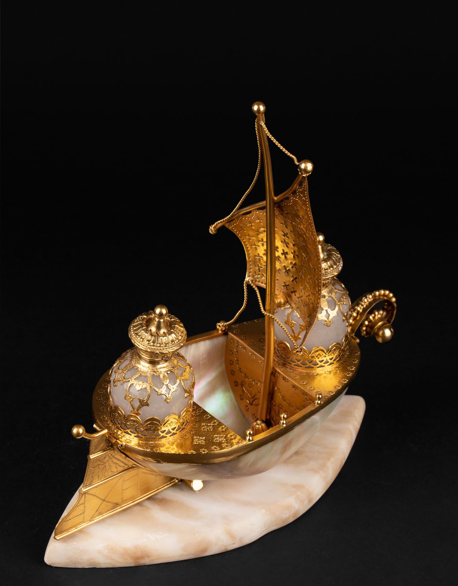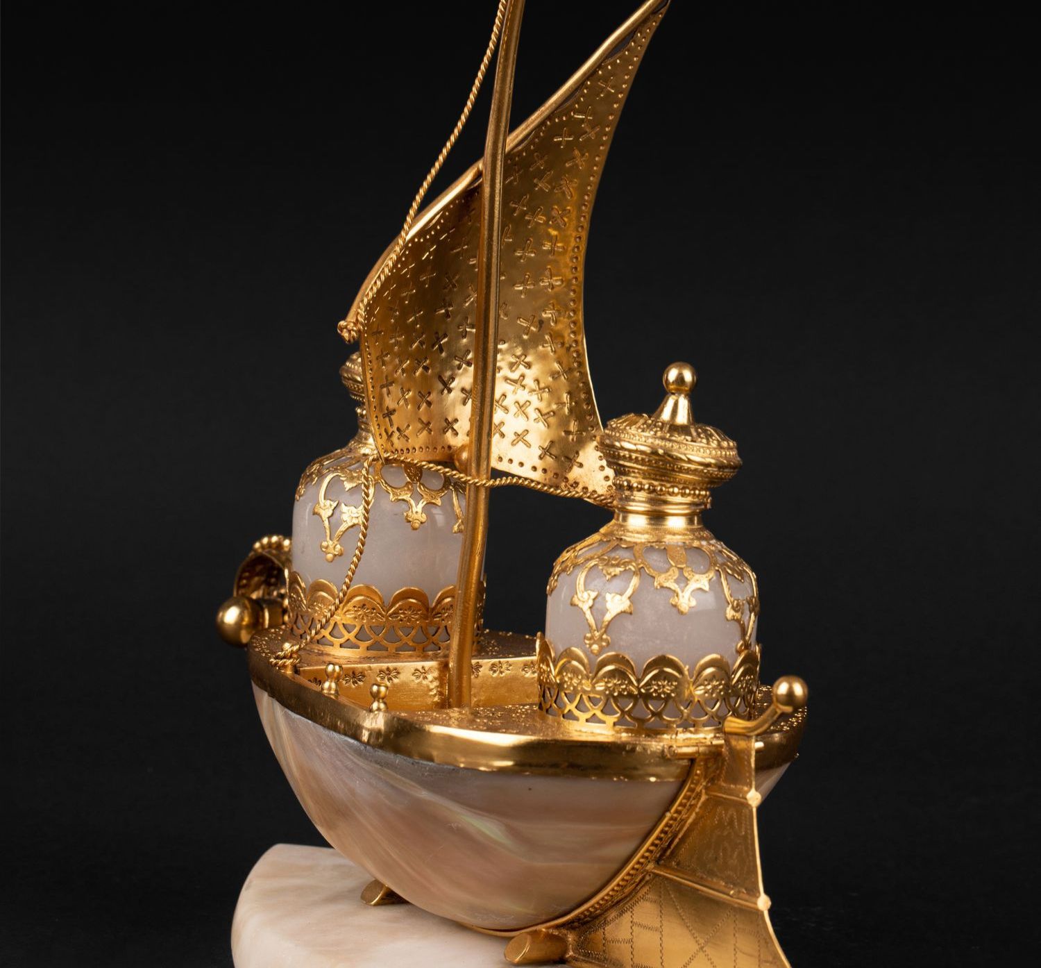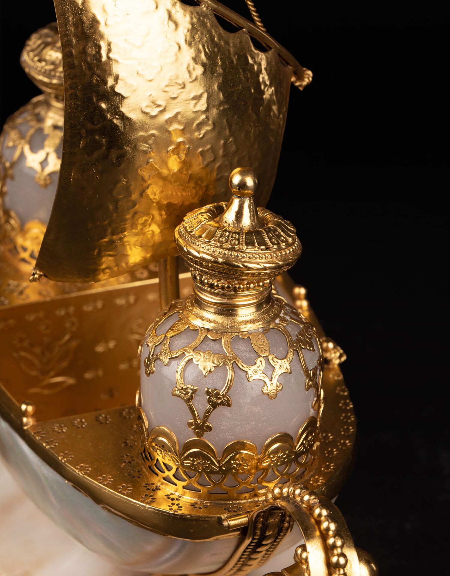 独角鹿西洋古董法国铜鎏金母贝帆船造型托盘欧泊色玻璃香水瓶套装