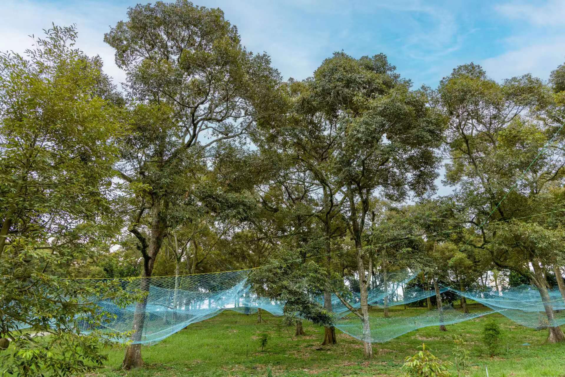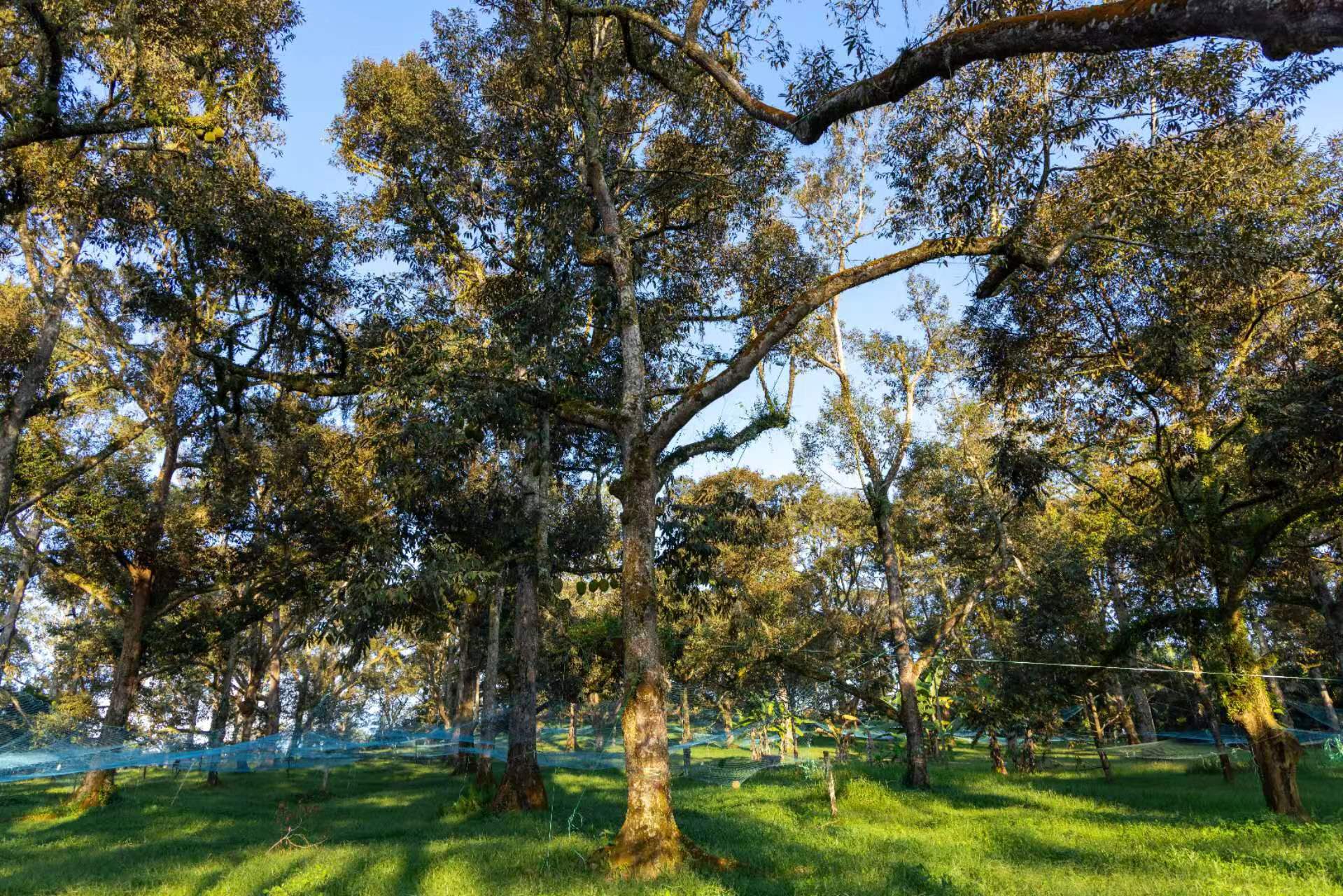 一颗颗魁拔的老树错落有序发种植在山坡上,它们相互错开,为通风和良好的光照提供了有利的条件,这样子种植出来的金凤榴莲才不会因为果树之间抢夺阳光与养分而导致口感参差不齐的问题出现。