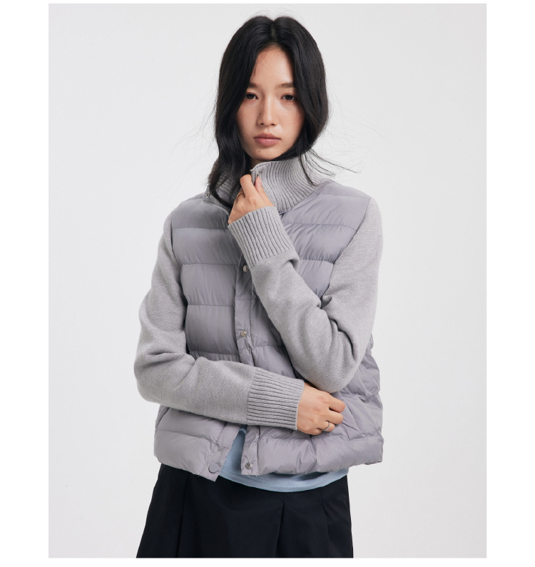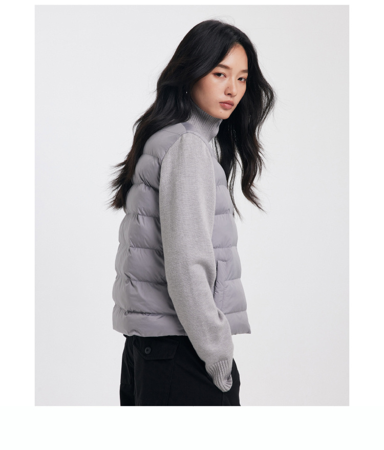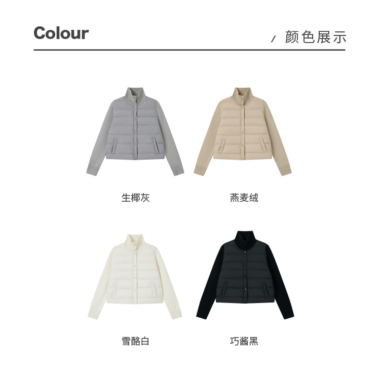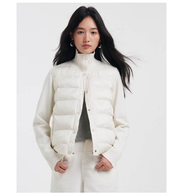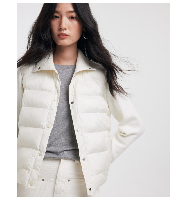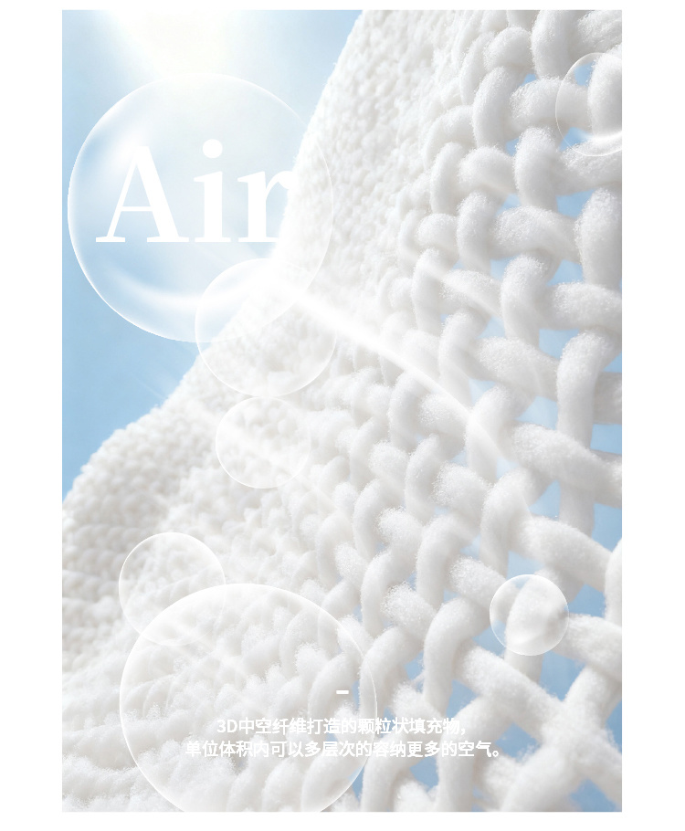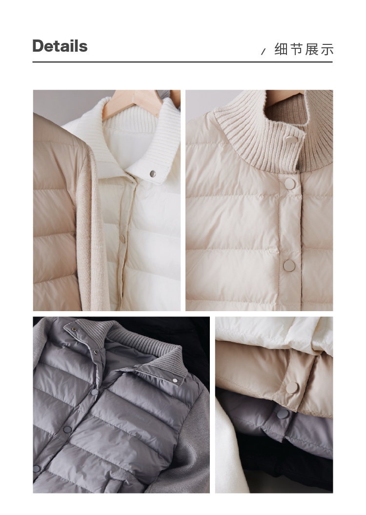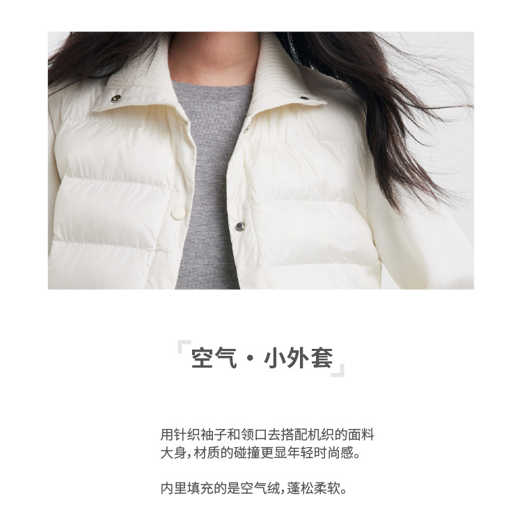 用针织袖子和领口去搭配机织的面料大身,材质的碰撞更显年轻时尚感。内里填充的是优某库同款空气绒,3D中空纤维打造的颗粒状填充物,单位体积内可以多层次的容纳更多的空气。又利用这chao细的纤维制成的特殊3D颗粒状,提高了蓬松度。使得这款暖若羽绒,空气感轻盈