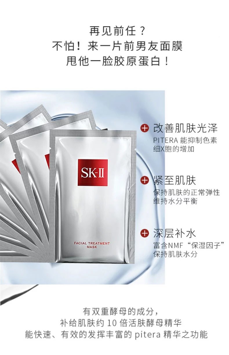 1、内含PITERA™这个SK-II核心成分,如果你用过SKII神仙水,那么你一定会觉得前男友面膜的气味很熟悉,那是因为,他们都是一个“亲妈”成分——Pitera精华,而且一片前男友面膜中含高于神仙水10倍的Pitera精华,一夜回春