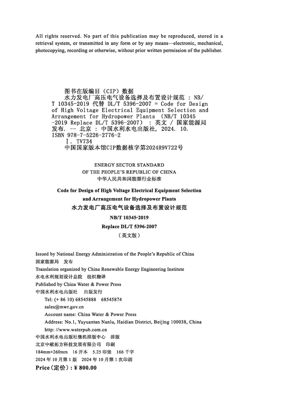 (NB/T 10345-2019)水力发电厂高压电气设备选择及布置设计规范 (英文版)