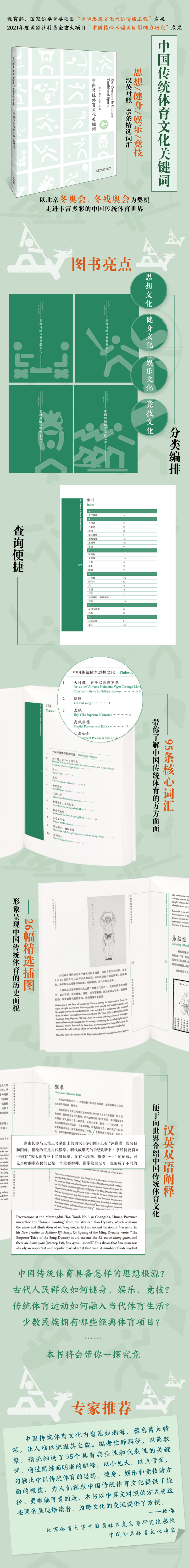 《中国传统体育文化关键词》选取了95个中国传统体育方面的关键词汇,用现代汉语进行解释,并翻译成英文。全书分为中国传统体育思想文化、中国传统体育健身文化、中国传统体育娱乐文化、中国传统体育竞技文化等四大板块,书后附有北京2022年冬奥会和冬残奥会竞赛项目简表、中国历史年代简表及索引等。读者通过阅读这些词条,不仅能够了解术语的历史源流和发展变化,还能够认识中国传统体育的深层和表层结构、社会和个体价值等。本书采用中英文对照体例,也为读者从事文化传播与国际交流提供了宝贵的素材。