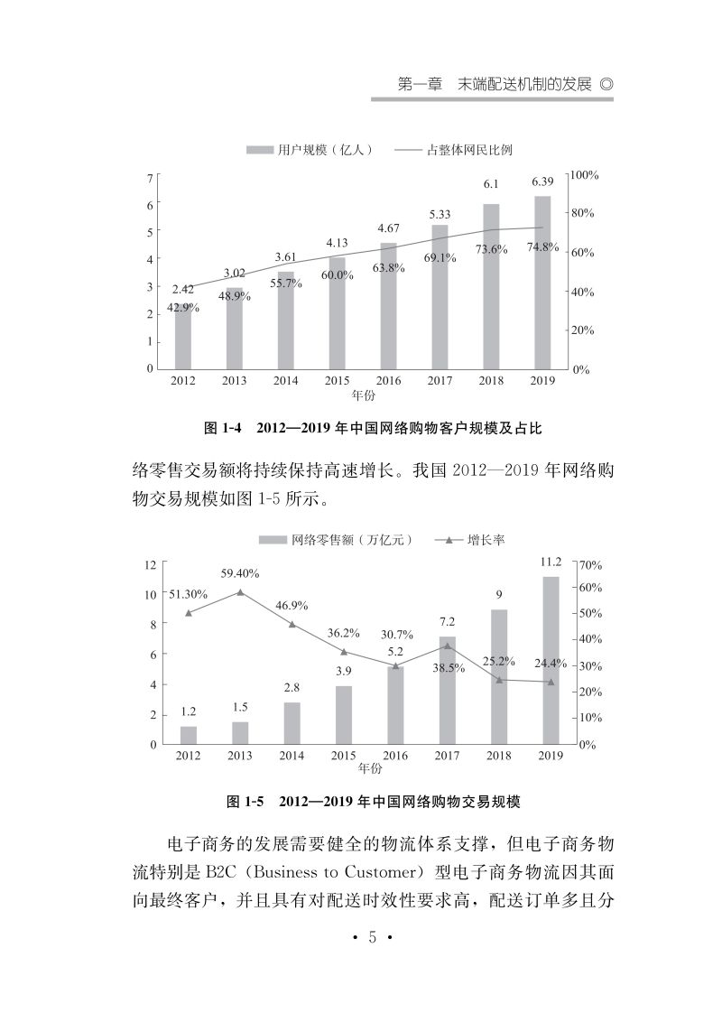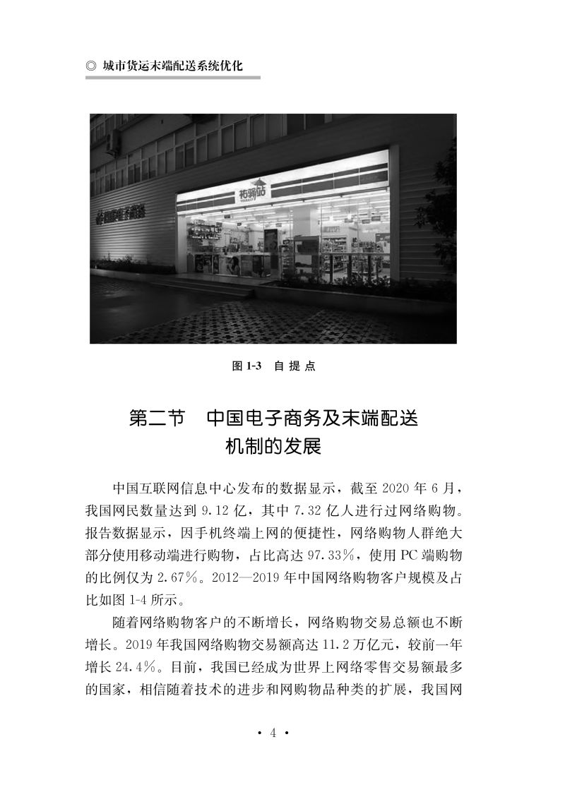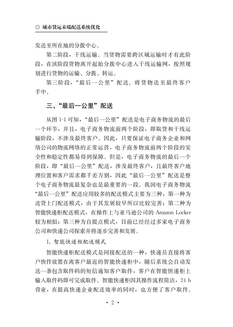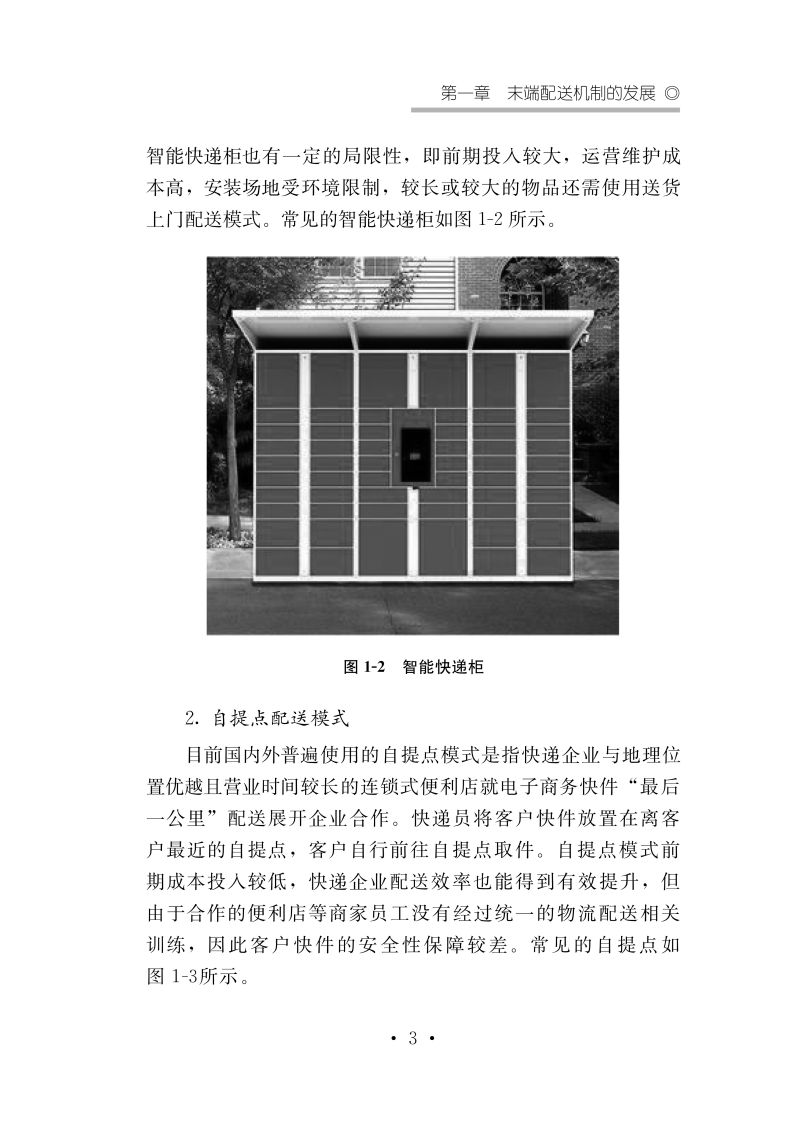 为适应电商行业的飞速发展,快递企业近几年虽然也在不断加强末端网点建设,但“末端配送”问题仍然是制约我国快递行业和电商行业发展的重要因素。研究表明,配送成本居高不下的最主要原因是配送失败率较高以及配送效率低下。因此,面向终端消费者的末端配送问题,已经越来越受到电子商务企业、快递企业及物流企业的重视,城市中也逐渐出现了不同的配送方式。为了满足人们日益增长的快速配送需求,针对小件包裹设置了多种上门配送方式,包括有人值守和无人值守两种接收模式。本书对末端配送方式进行建模分析和成本优化,分析结果揭示了多种末端配送模式在不同客户选择意愿下的变化规律,为末端配送企业和社会进行末端配送模式选择提供了参考。