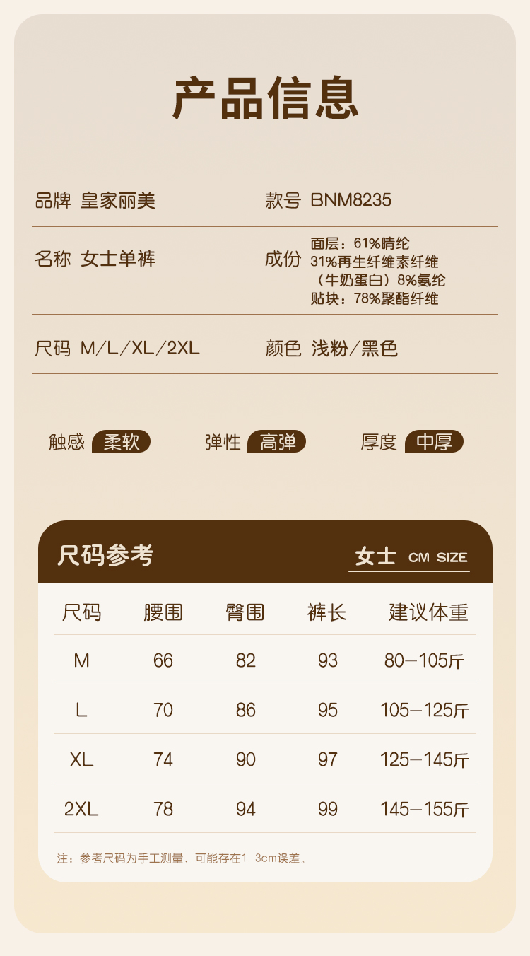 皇家丽美轻保暖牛奶衣润肤养肤女士秋裤修身打底单裤BNM8235