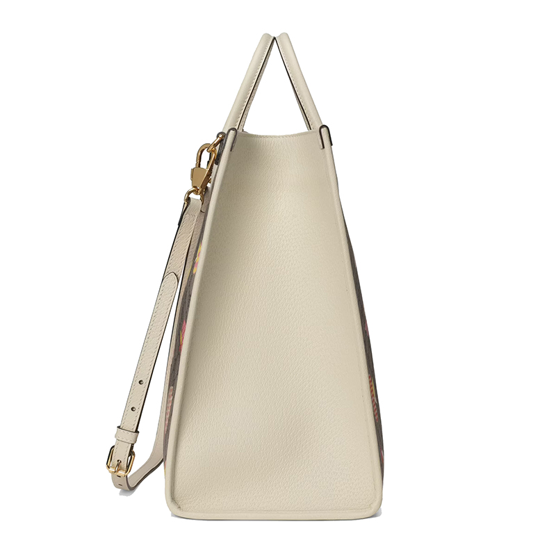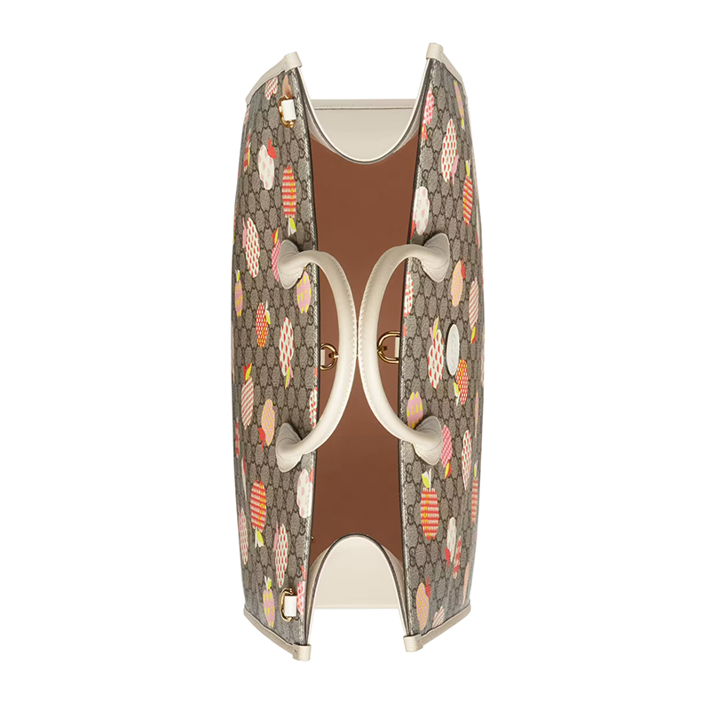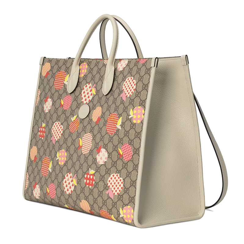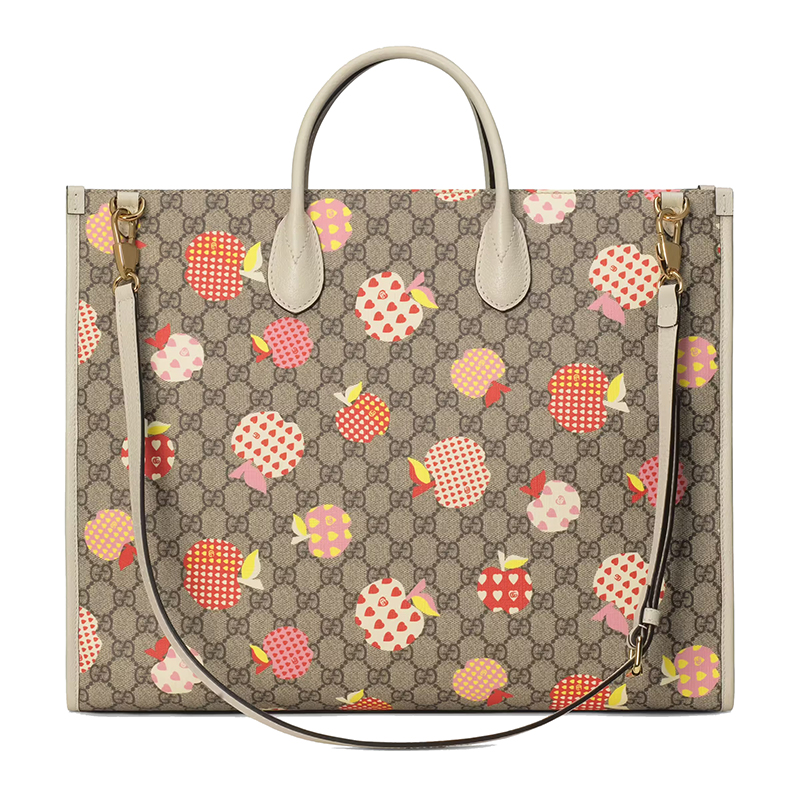 水果和蔬菜化身为品牌当下的时尚设计元素,为全新系列注入满满活力,生动诠释品牌天真烂漫的趣致意境。这款大号托特包便采用了趣味盎然的古驰心苹果图案呼应该主题。