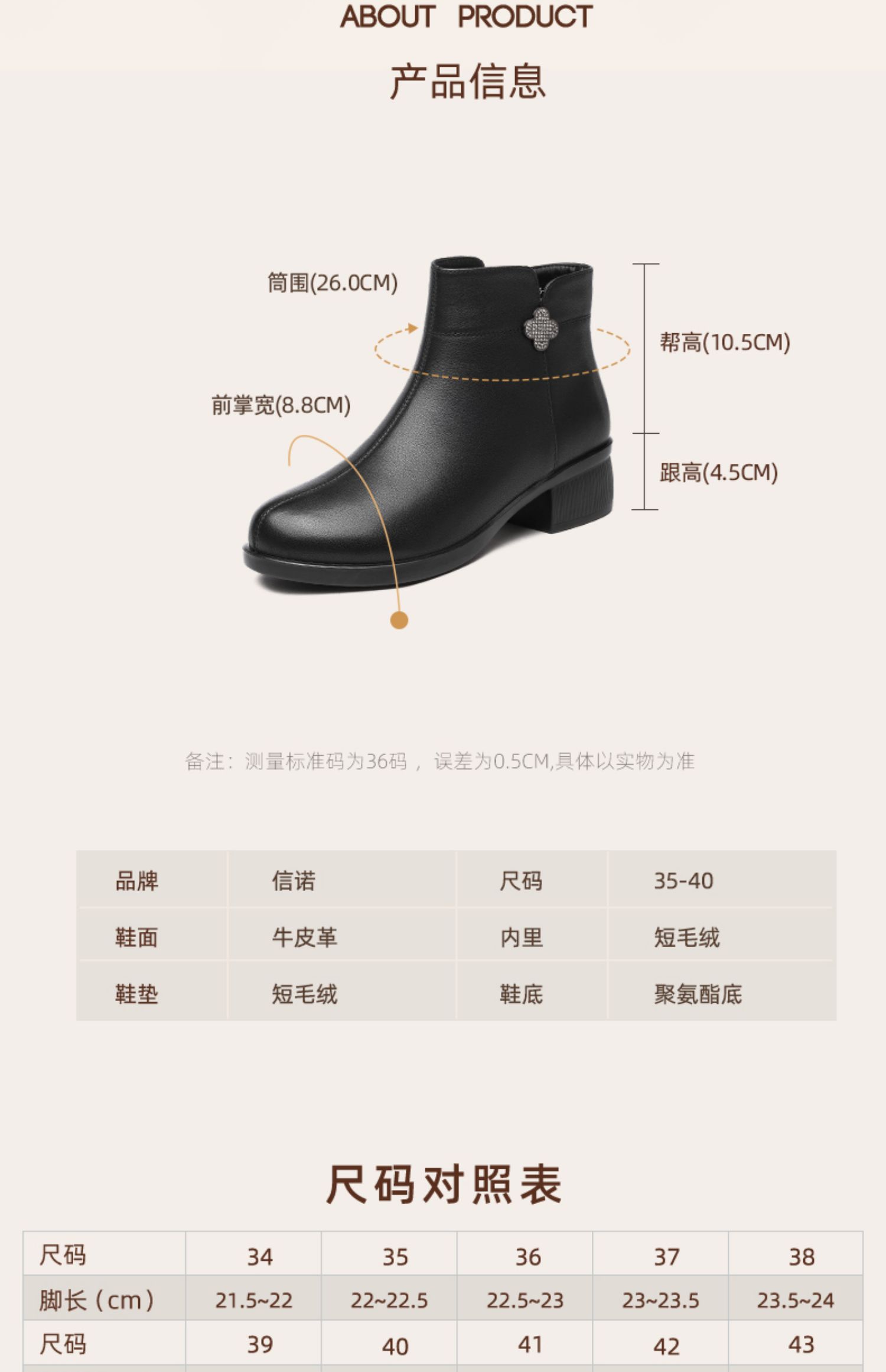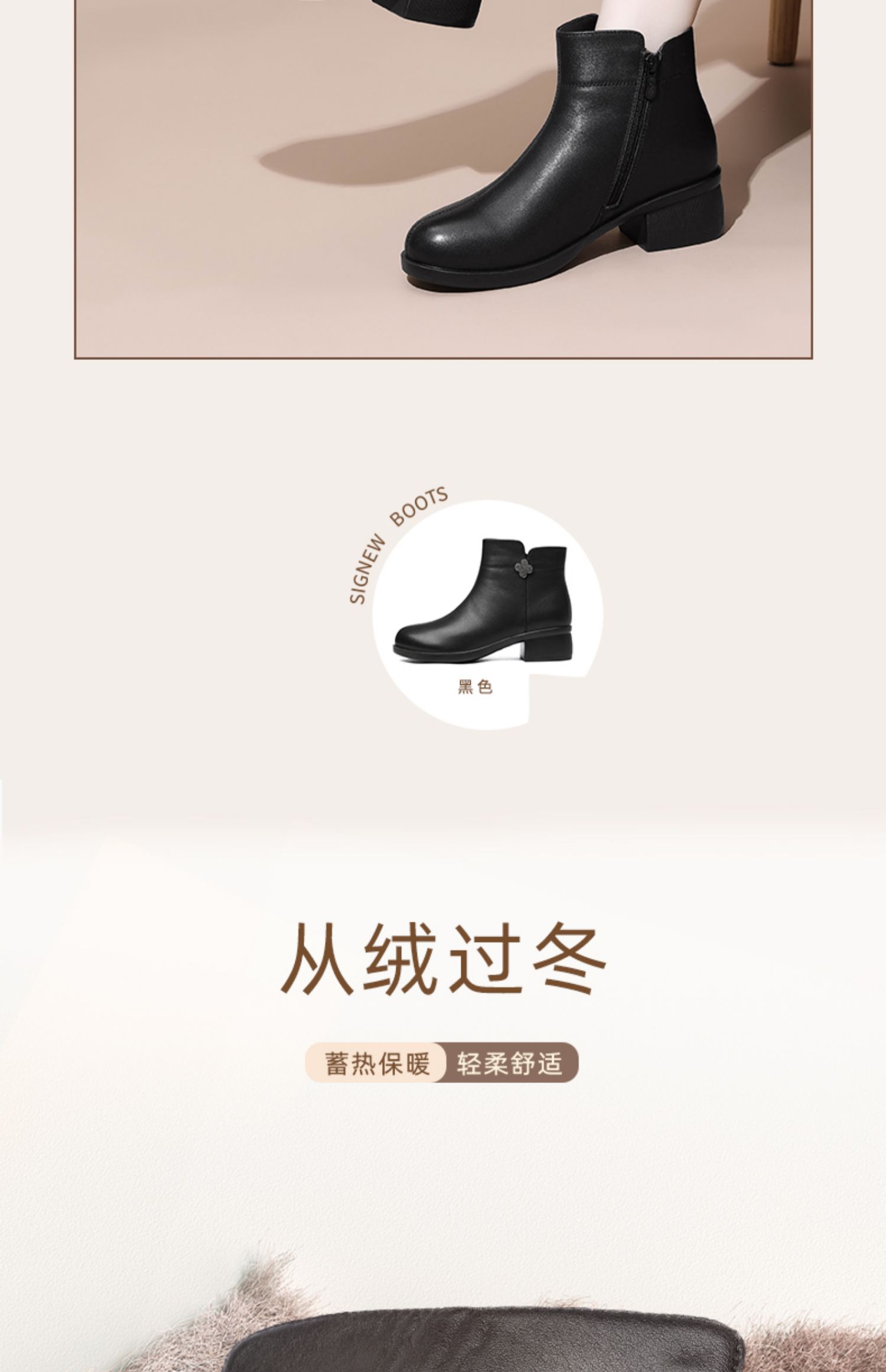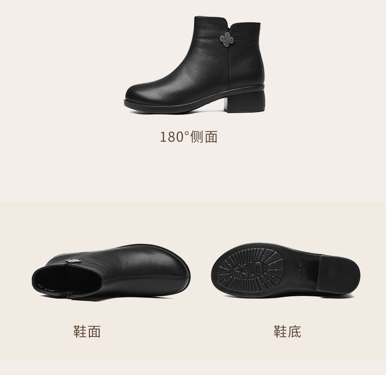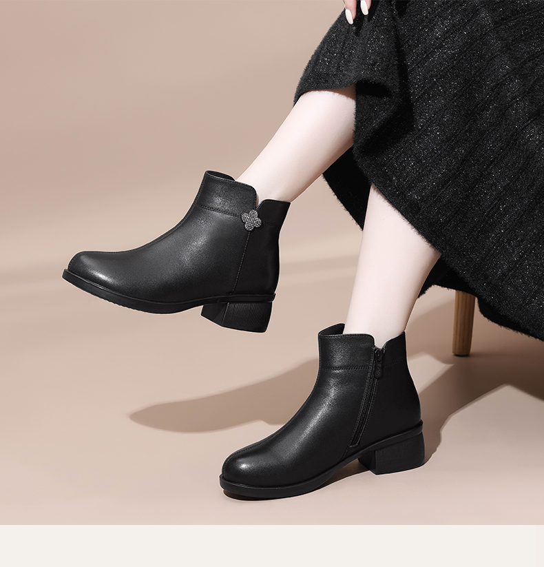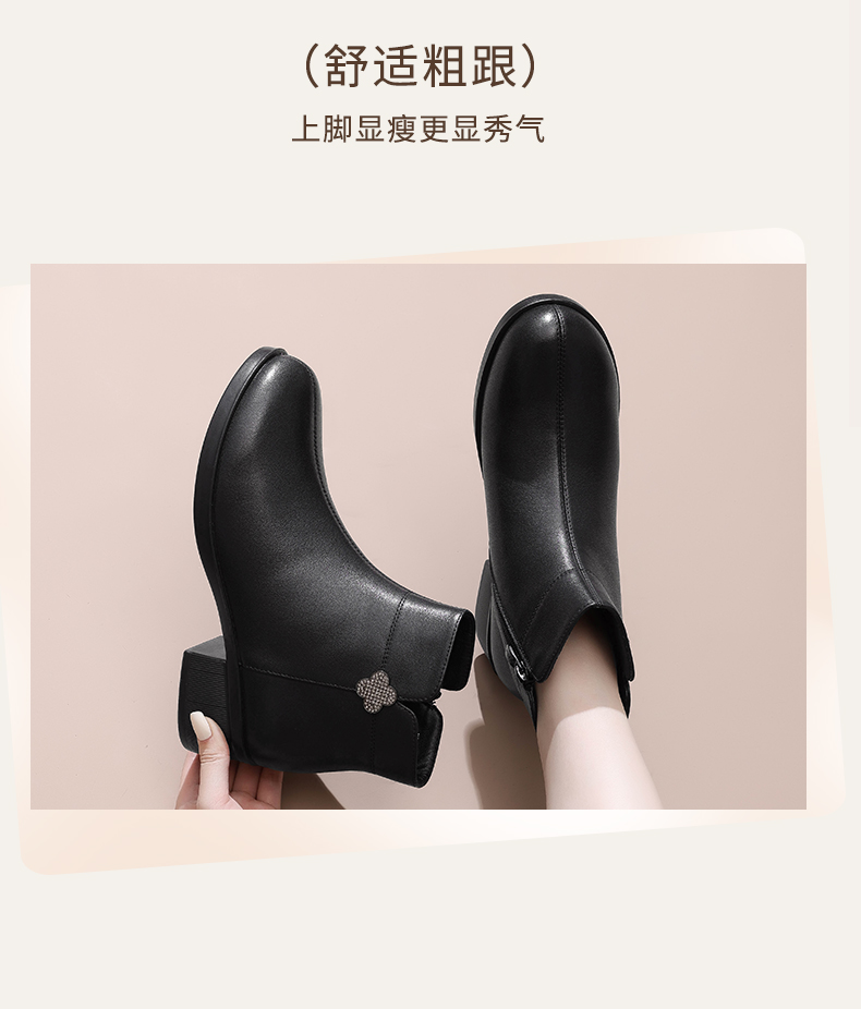 信诺真皮时装女靴2024冬季新款粗跟短靴加绒舒适妈妈棉鞋短筒皮鞋M615-8D