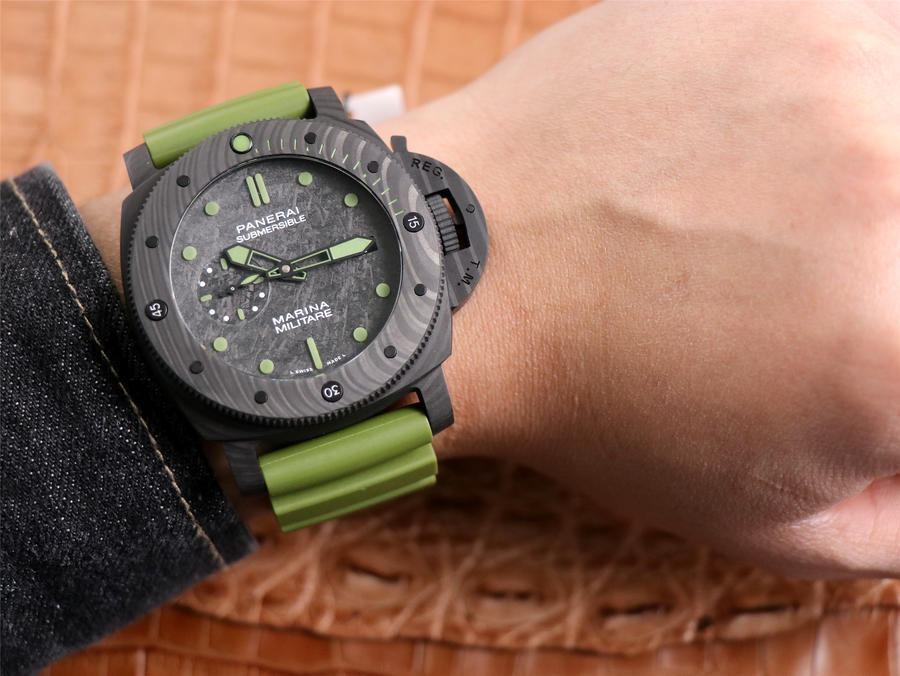 PANERAI沛na海SUBMERSIBLE系列自动机械潜水腕表 PAM00961 PAM961 VS961 961 CARBOTECH碳纤维表壳 潜水倒计时表圈 蓝宝石镜面 保险护桥表冠 描绘有意大利皇家海军徽章钛合金PVD黑底盖 碳纤维表盘 军绿色超强双色夜光 分针和表圈夜光点蓝色夜光用于潜水氧气倒计时 P.9010机芯 时针快调 可逆调日历 潜水伸缩军绿色橡胶表带 钛合金PVD黑针扣 直径47mm VS厂出品!
