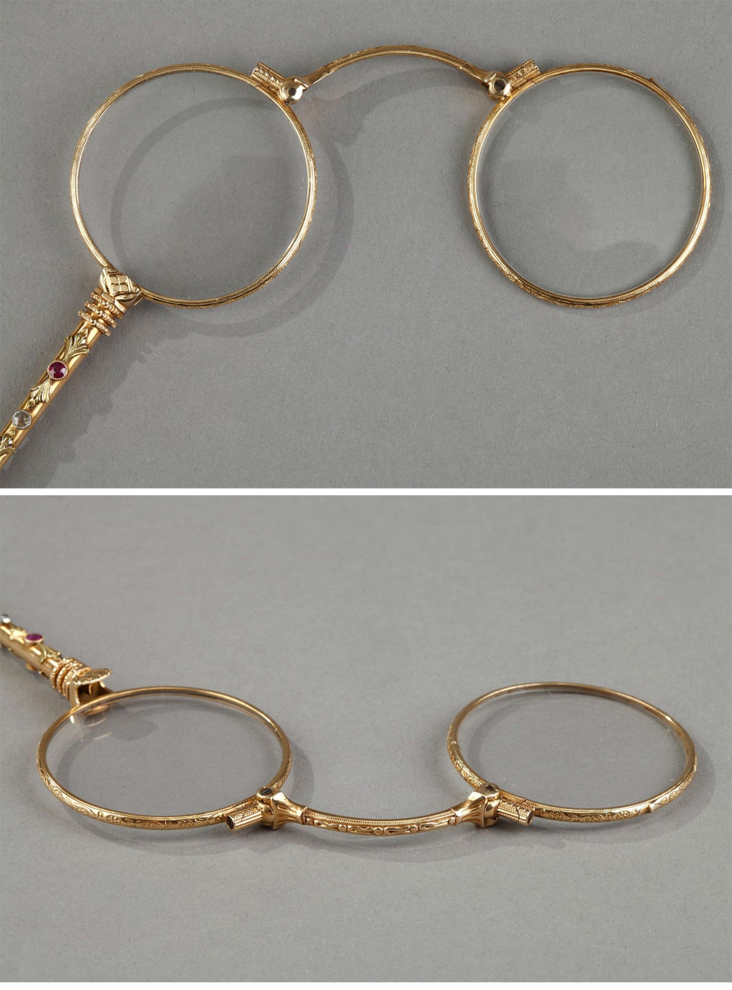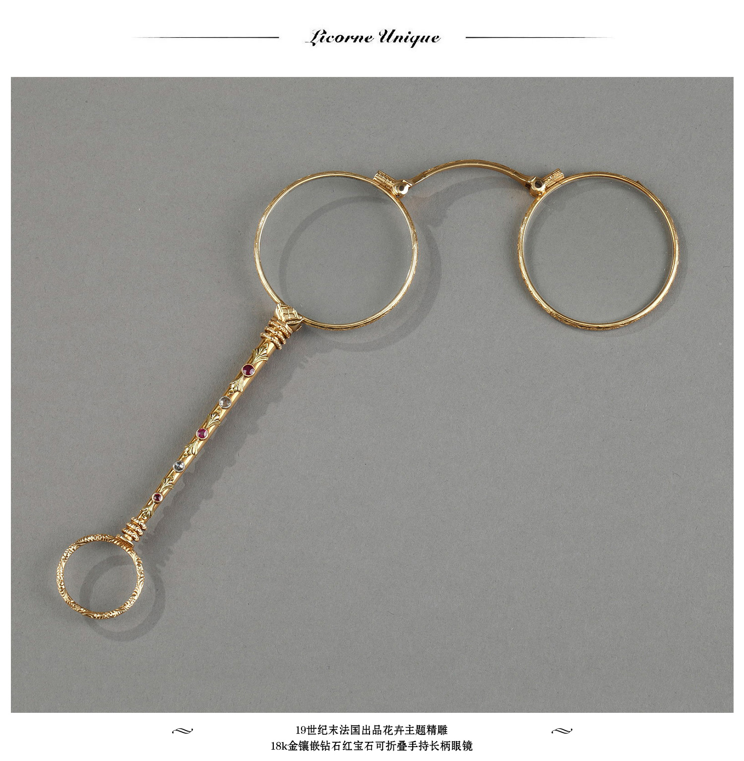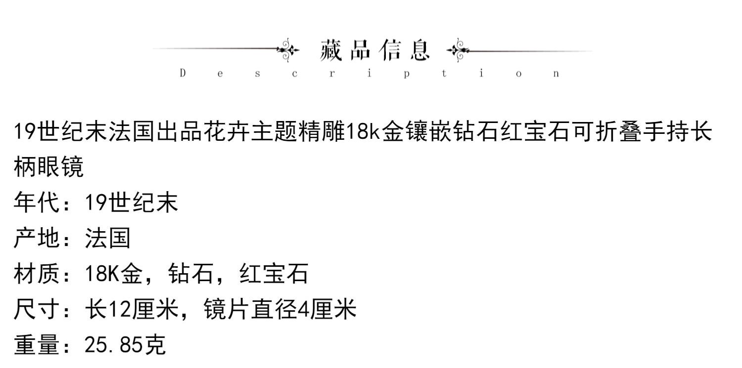 独角鹿西洋古董花卉精雕18k金镶嵌钻石红宝石可折叠手持长柄眼镜
