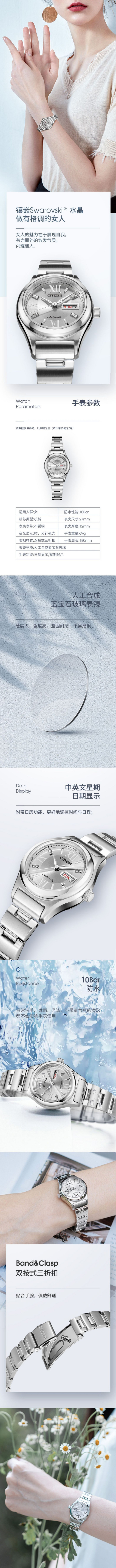 西铁城自动机械防水镶Swarovski水晶休闲女表PD7160-51A