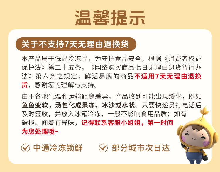 售后条件:冷冻产品不支持7天无理由退换货,如因产品、运输等情况产生的售后问题,请签收后拍照并24小苏内联系客服处理~