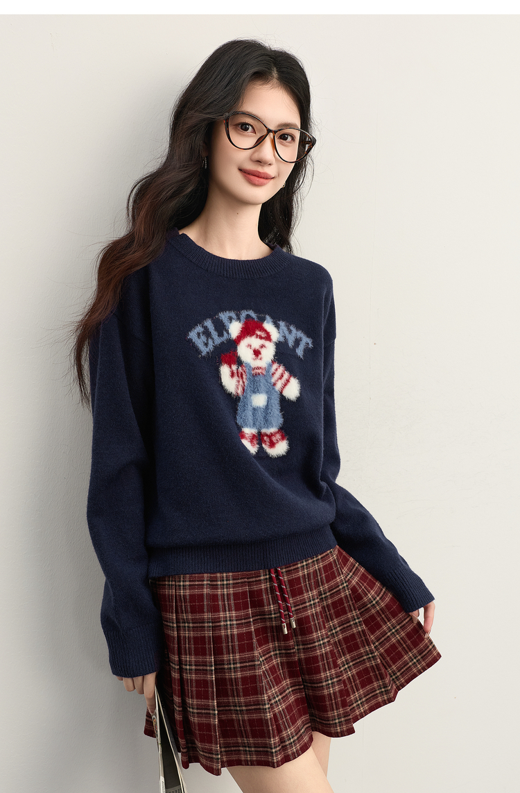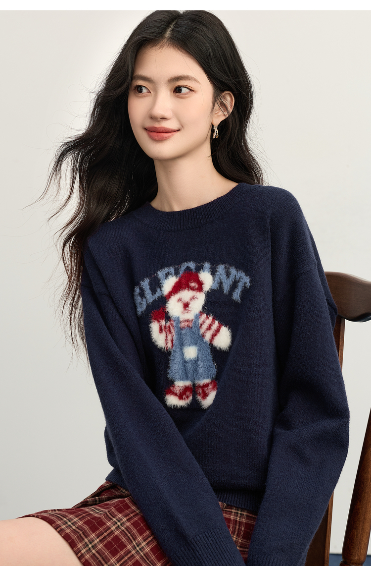 【年货节】熙世界学院风小熊提花圆领毛衣女2025秋冬新款套头宽松落肩针织衫