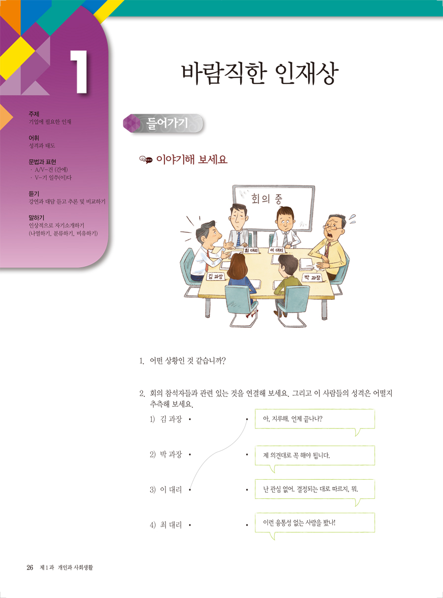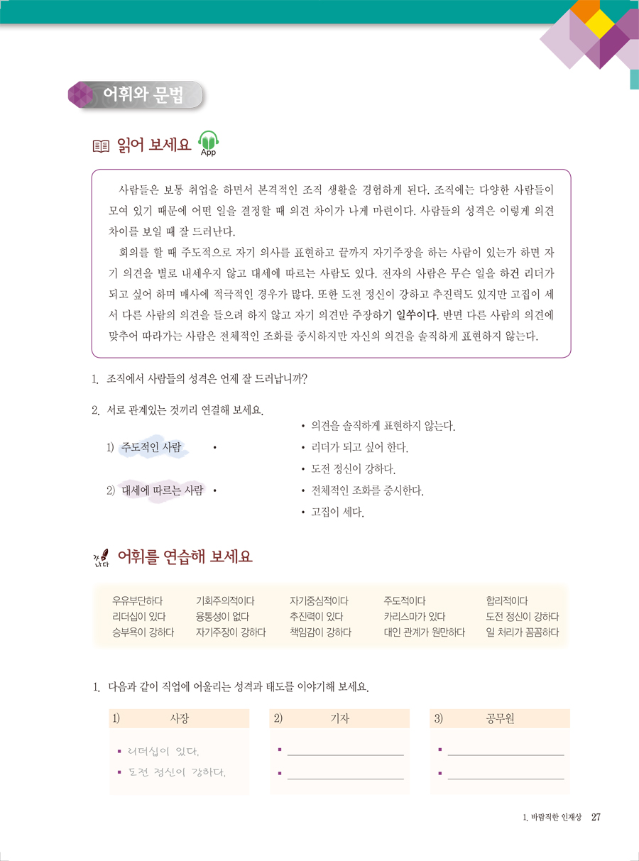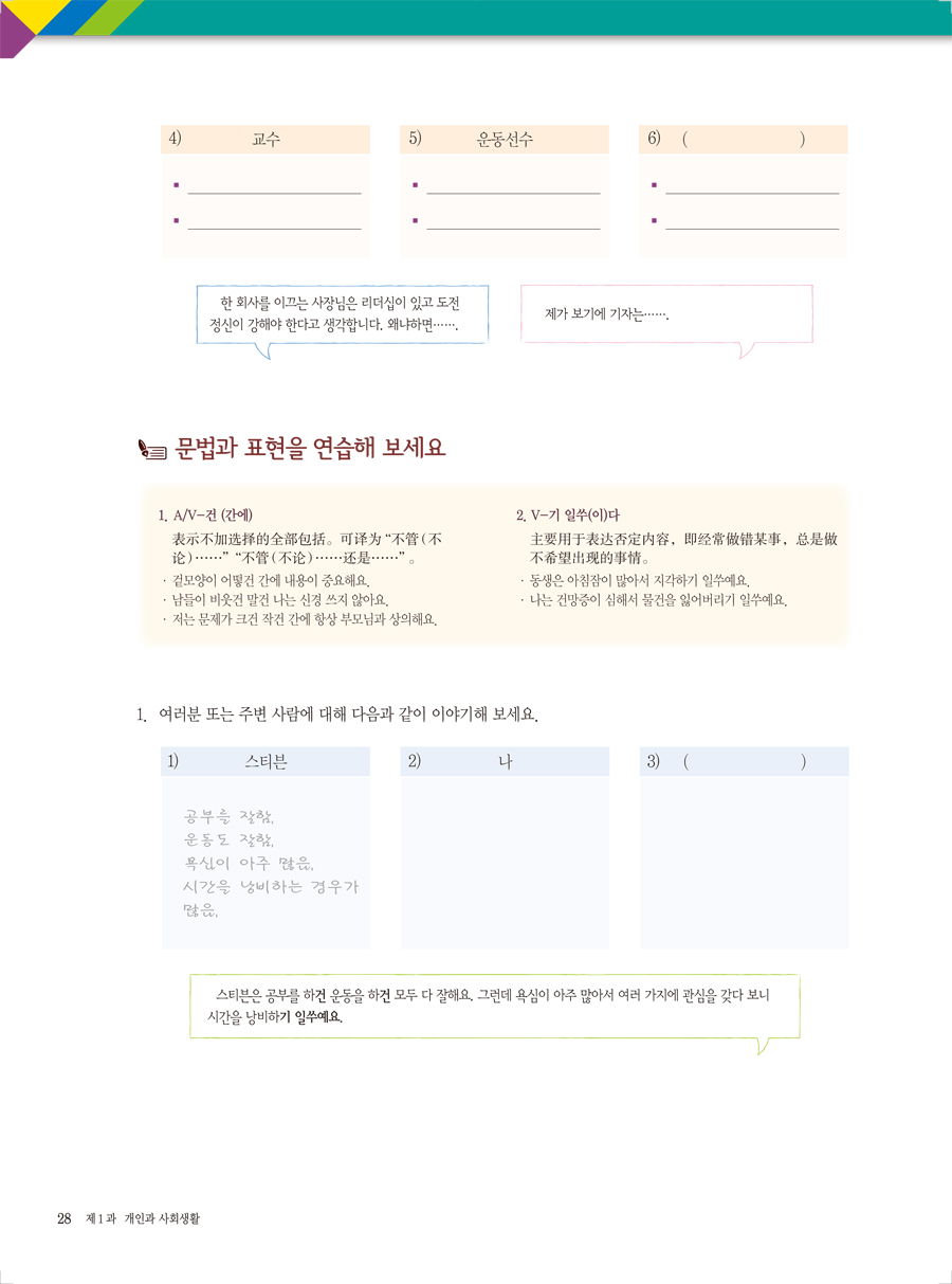 在学生用书上学到的内容,提高语言的实际应用能力。在多样化的语境中使用学到的词汇和语法,对学习内容进行整理和总结。词汇练习中,通过句子和对话的形式来练习词汇,学习者可以在做题时思考词汇的使用范围,在语境中掌握词汇的意义,做到举一反三。语法和表达方式练习中,选择贴近实际生活的、适合高级学习者的对话,通过这些对话练习,将教室内的练习和教室外的语言应用能力有机地结合起来,使练习更有效。此外,为了提高高级学习者的阅读能力,本书还设置了与每课主题相关的阅读练习,方便学习者进行扩展学习。写作部分主要以学生用书中的学习内容为基础帮助学习者进行写作训练,通过写作练习整理所学内容。