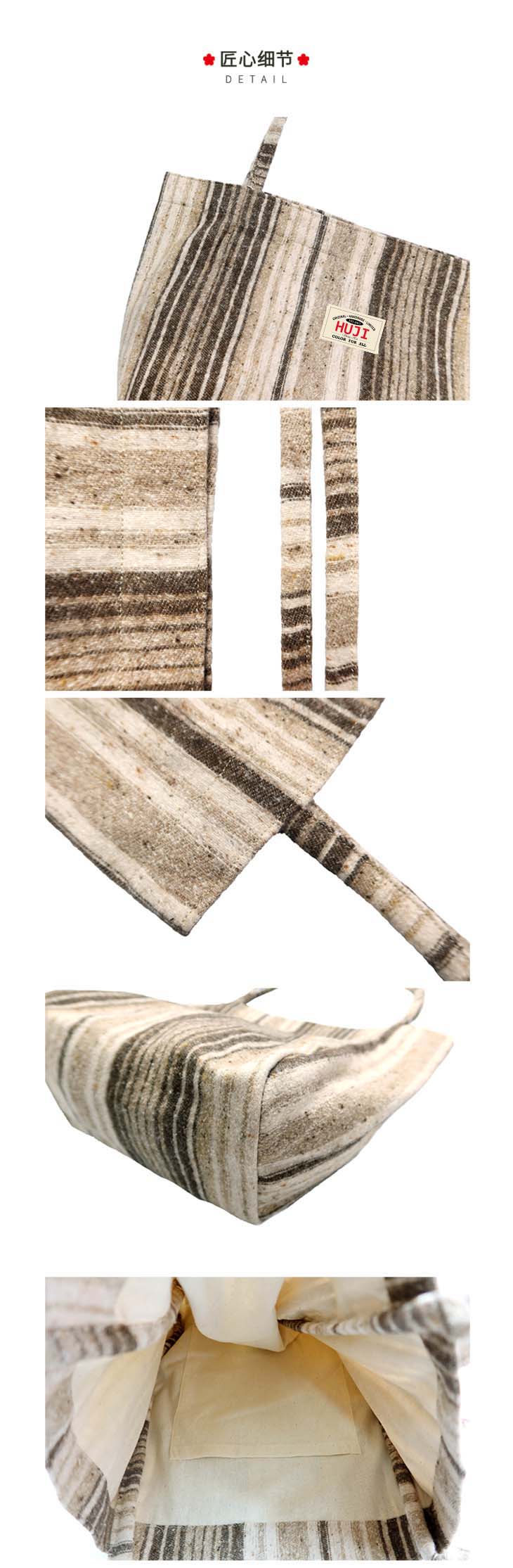 HUJI祤集于2013年成立于上海,我们用世界各地的优质印花布料制作布包、配饰等生活实用物品,以“布尽其用”为原则,保持少量制作,并尽可能保留手工部分。我们坚信,手工能增加人与物之间的情感。