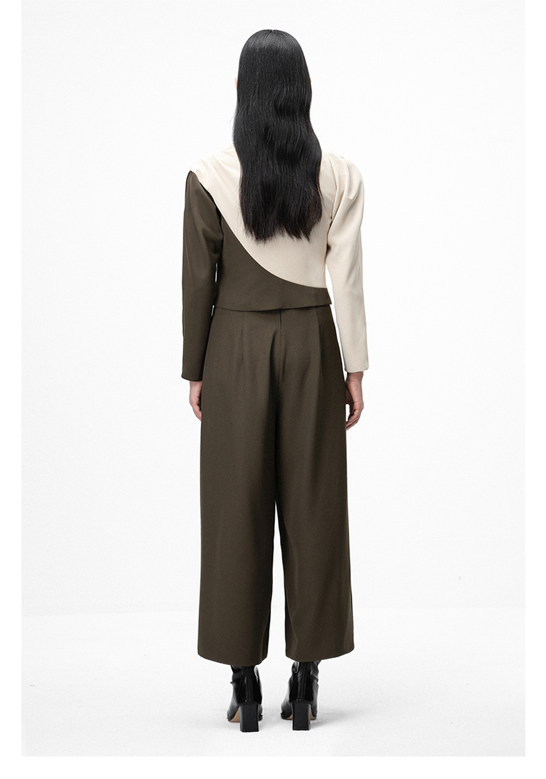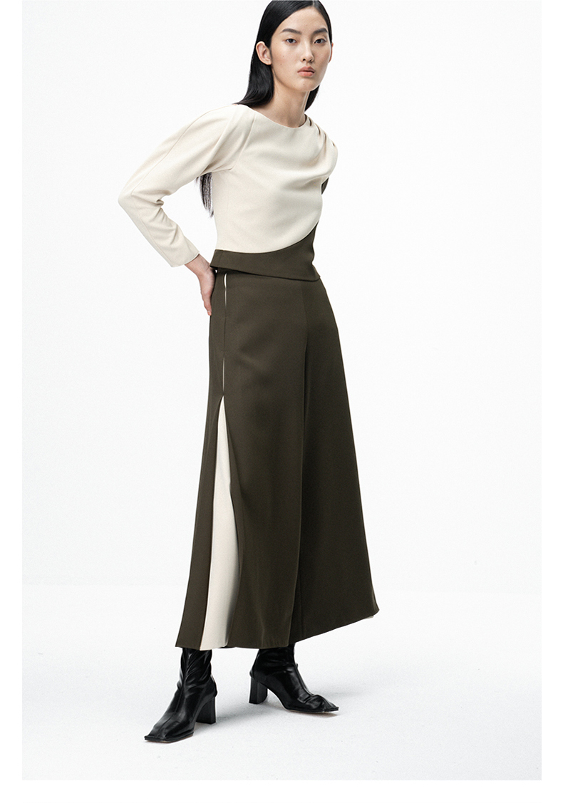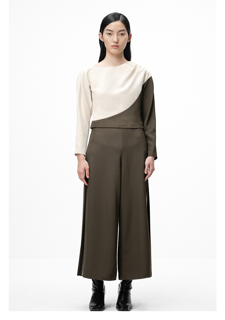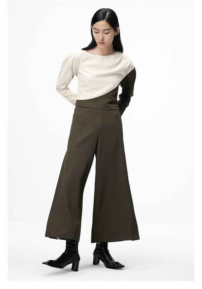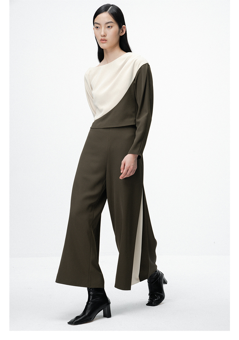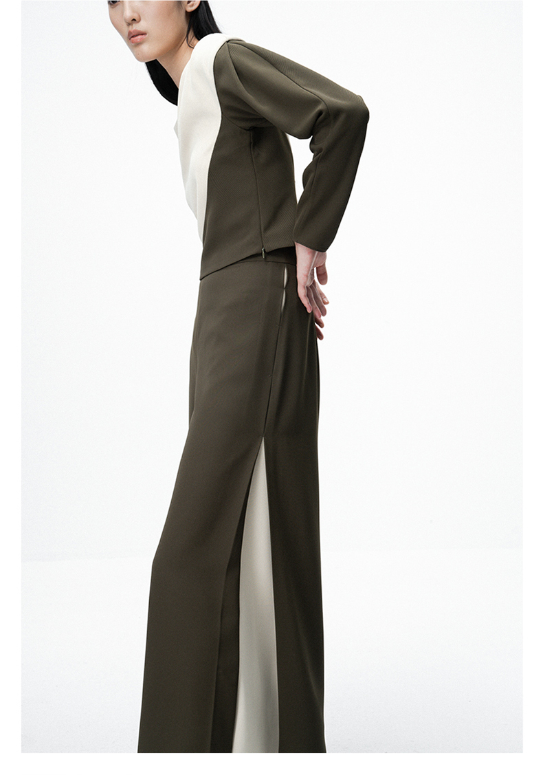 【细缝微光】苔绿拼缝撞色垂感高腰阔腿裤/000109