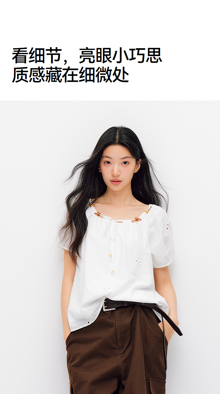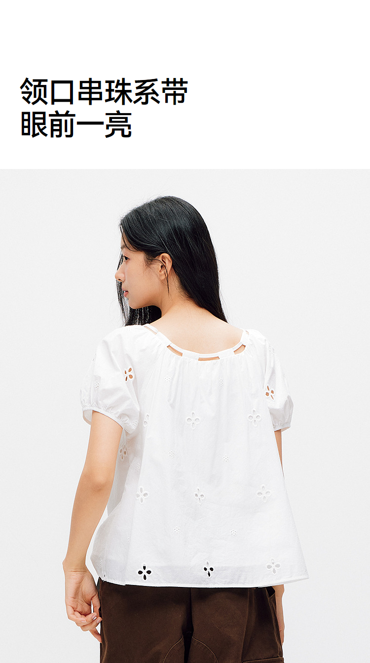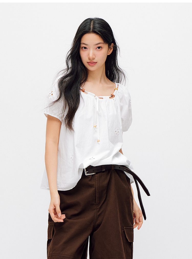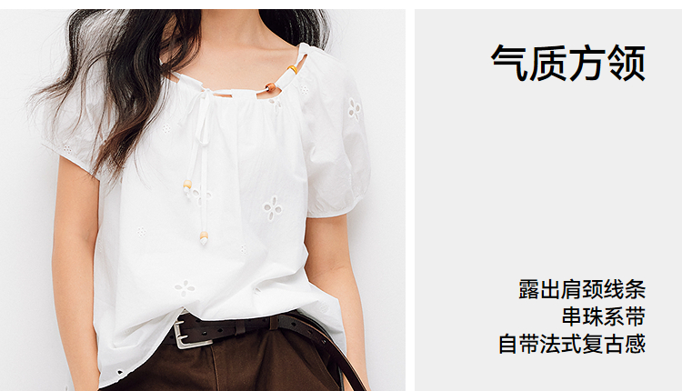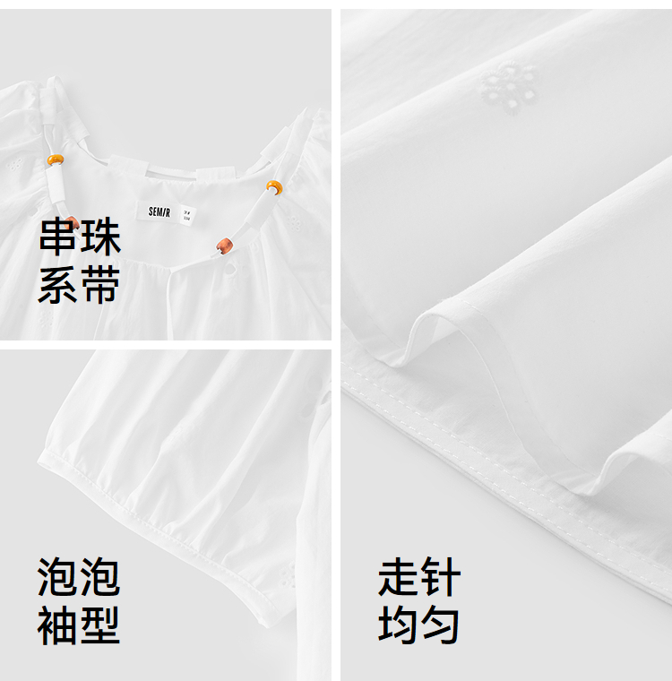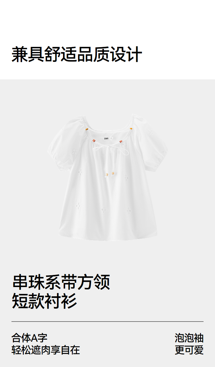森马短袖衬衫女夏季短款串珠方领泡泡袖白色2026新款法式可爱上衣