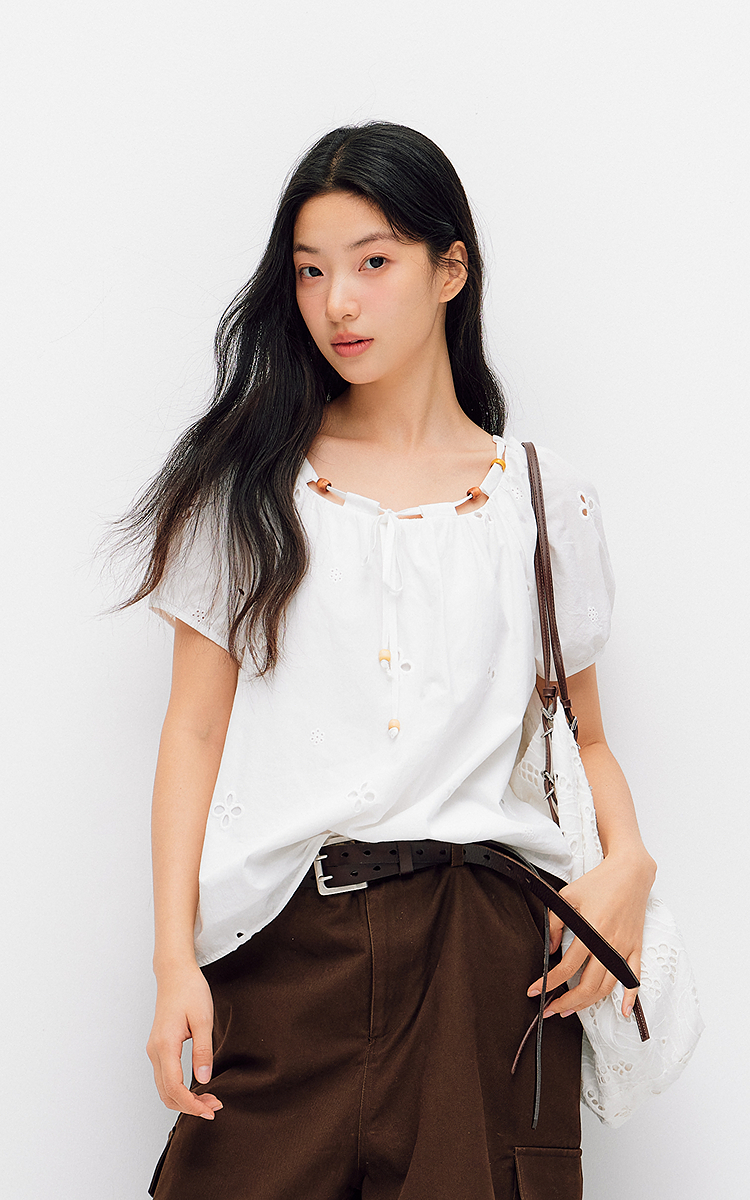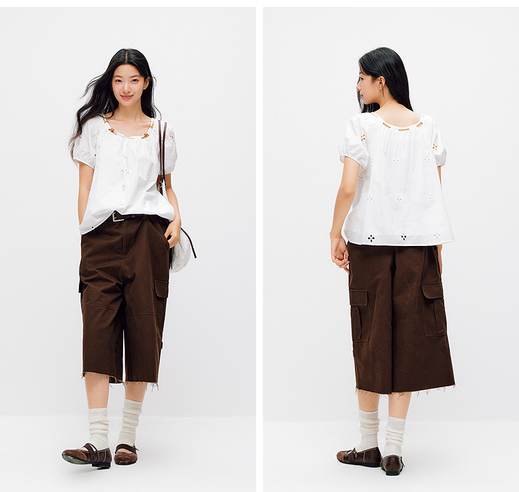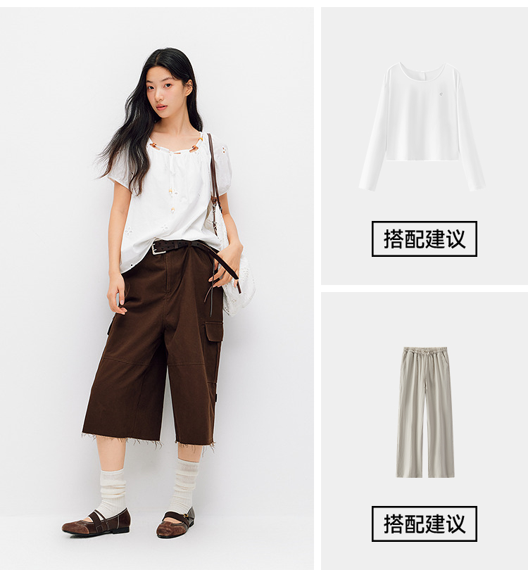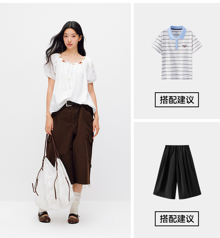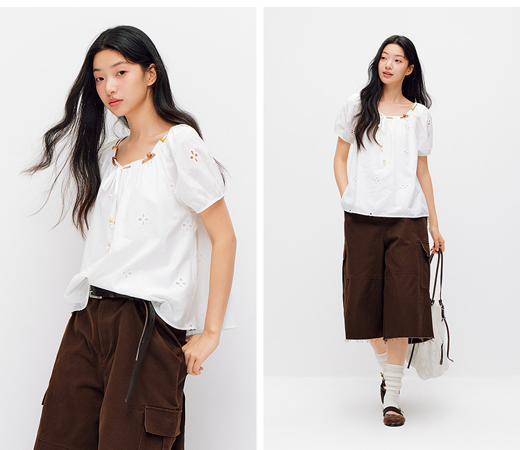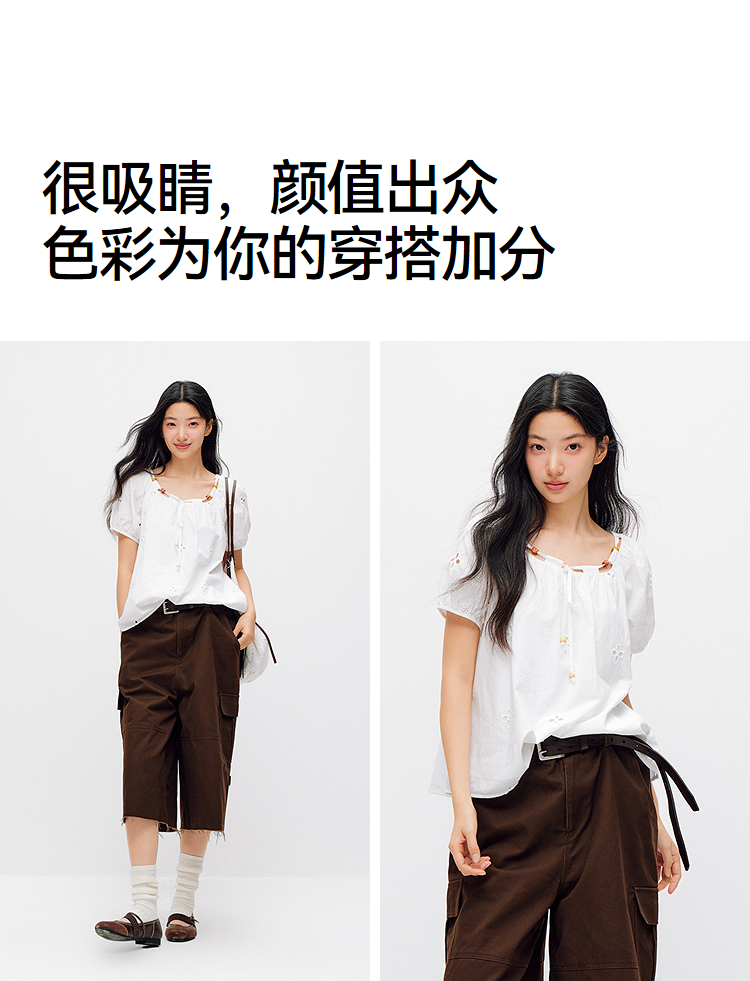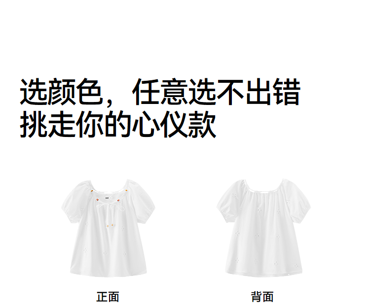 森马短袖衬衫女夏季短款串珠方领泡泡袖白色2026新款法式可爱上衣