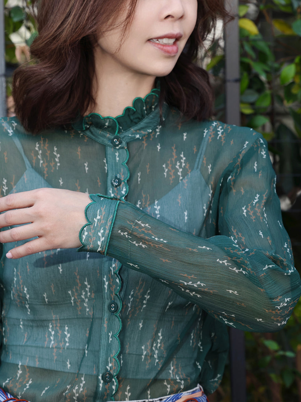 TYNVIE 花边领长袖真丝衬衫 - 绿色