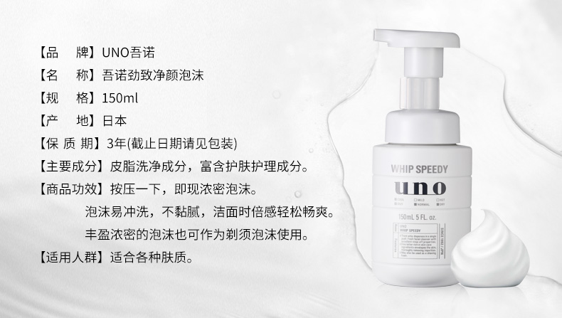 【中欧班列精】 日本资生堂UNO/吾诺泡沫劲致净颜泡沫 150ml SHJH
