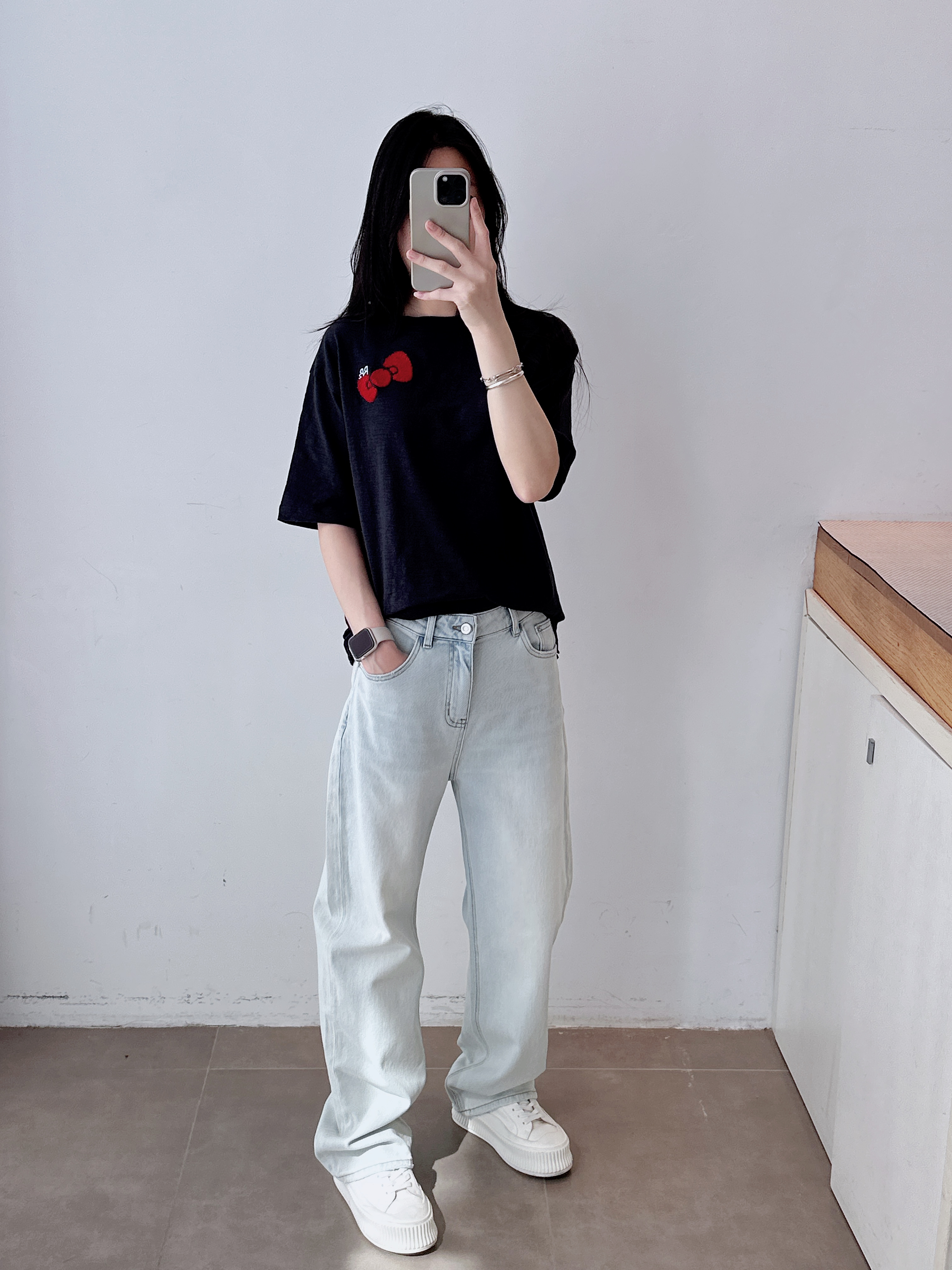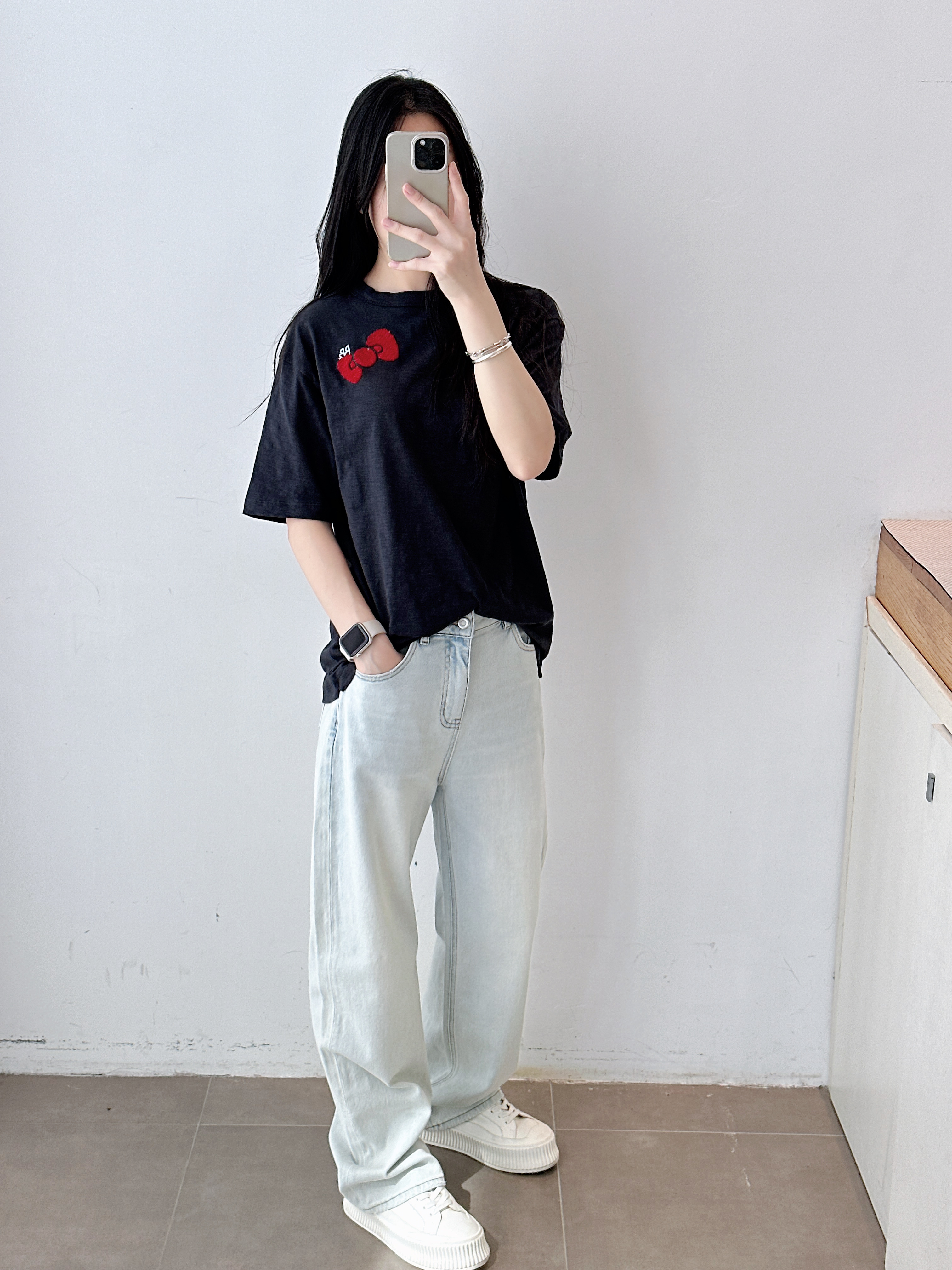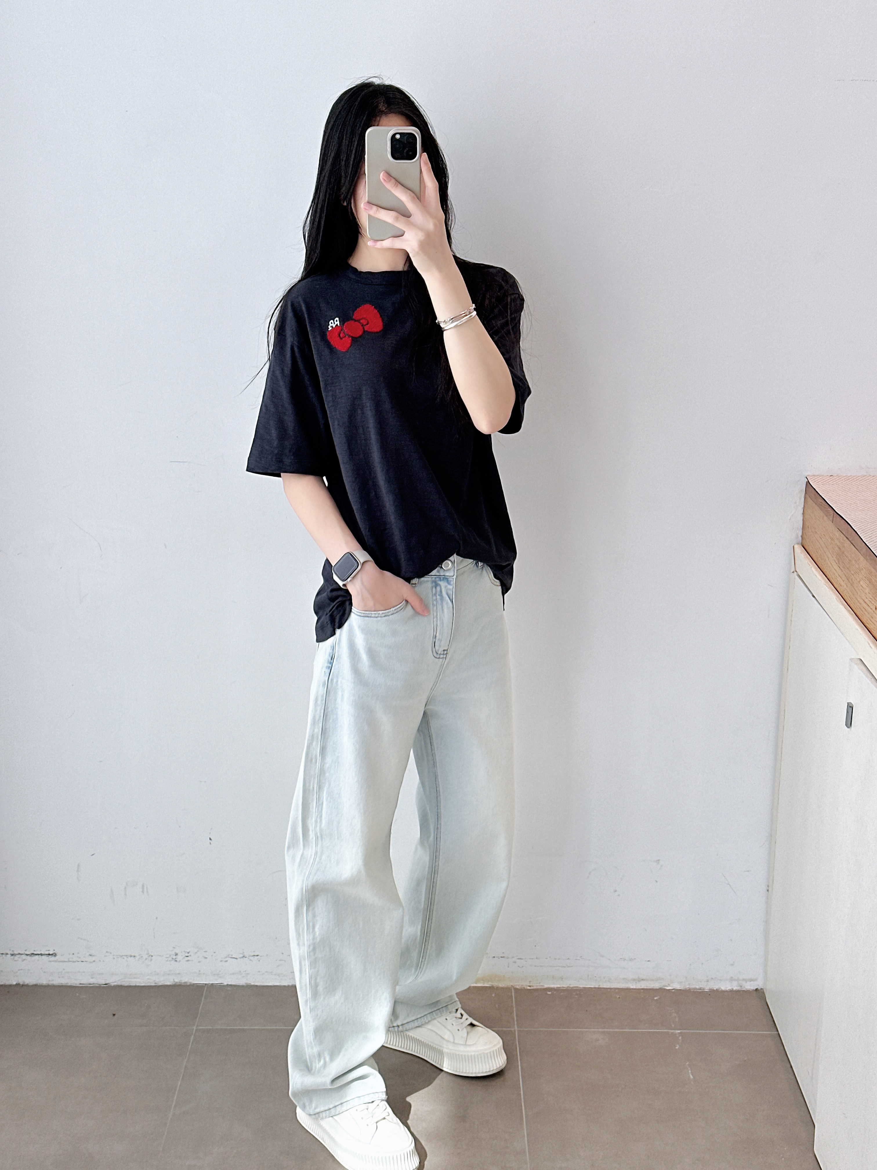 竹节棉高级灰植绒印花kitty控短袖T恤
