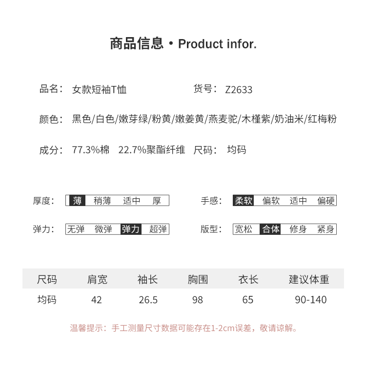 【秒杀品 不退不换】皇家丽美棉质面料柔软舒适弹力女款糖果色薄款宽松短袖T恤SZ2633
