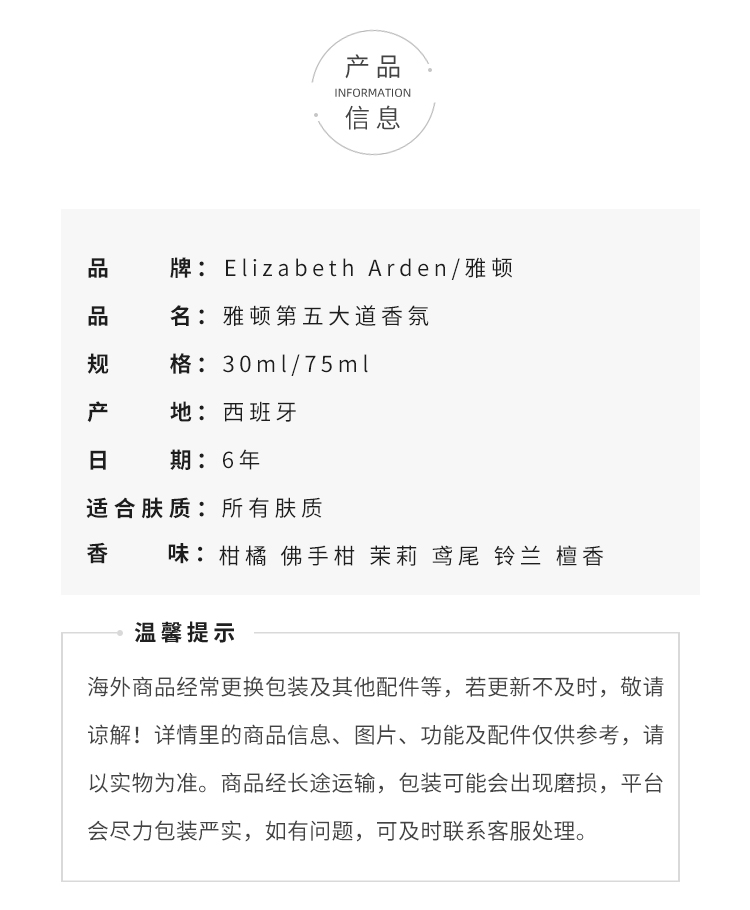 雅顿第五大道香氛女士淡香水学生少女清新东方花香调30/75ml