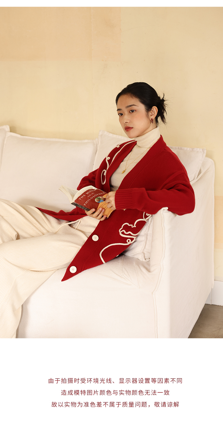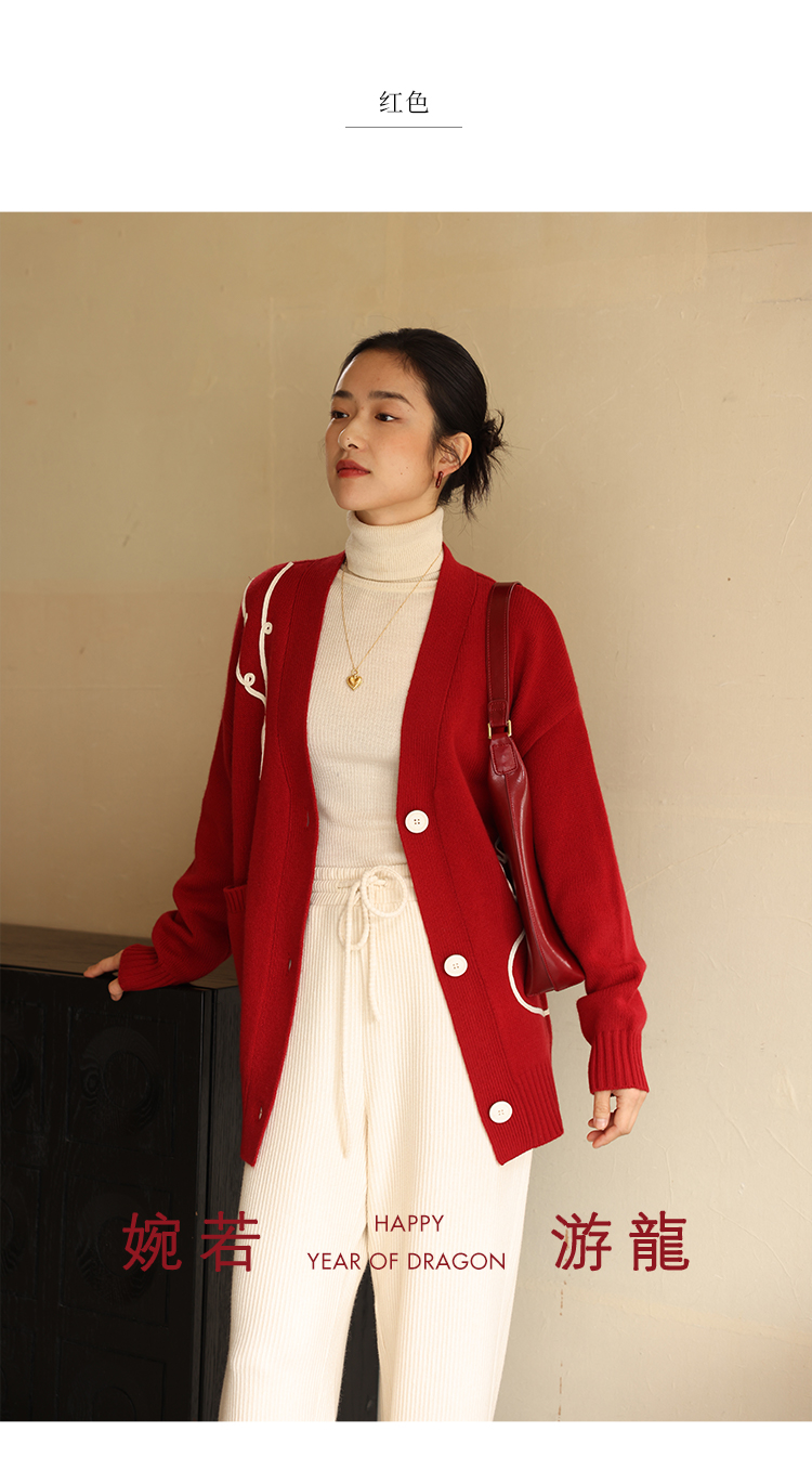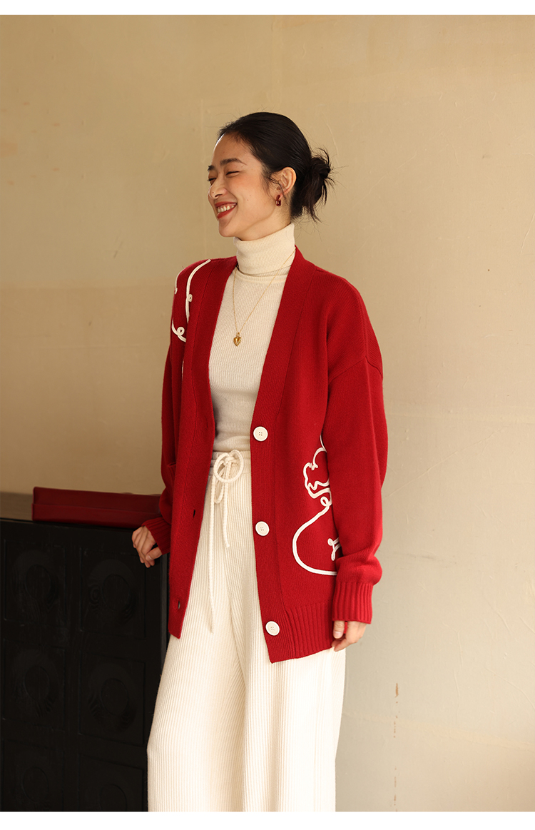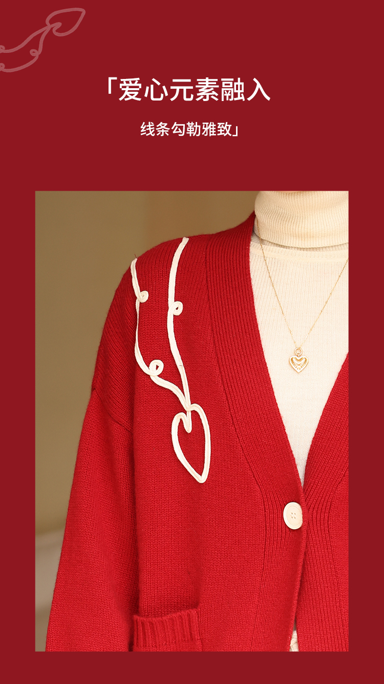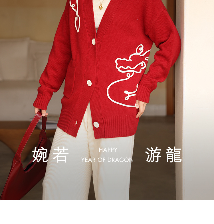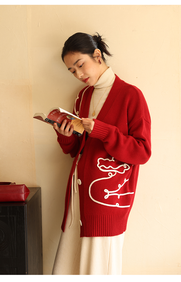 HeyDress祥龙提花针织开衫女秋冬法式V领宽松羊毛衫红色上衣外套