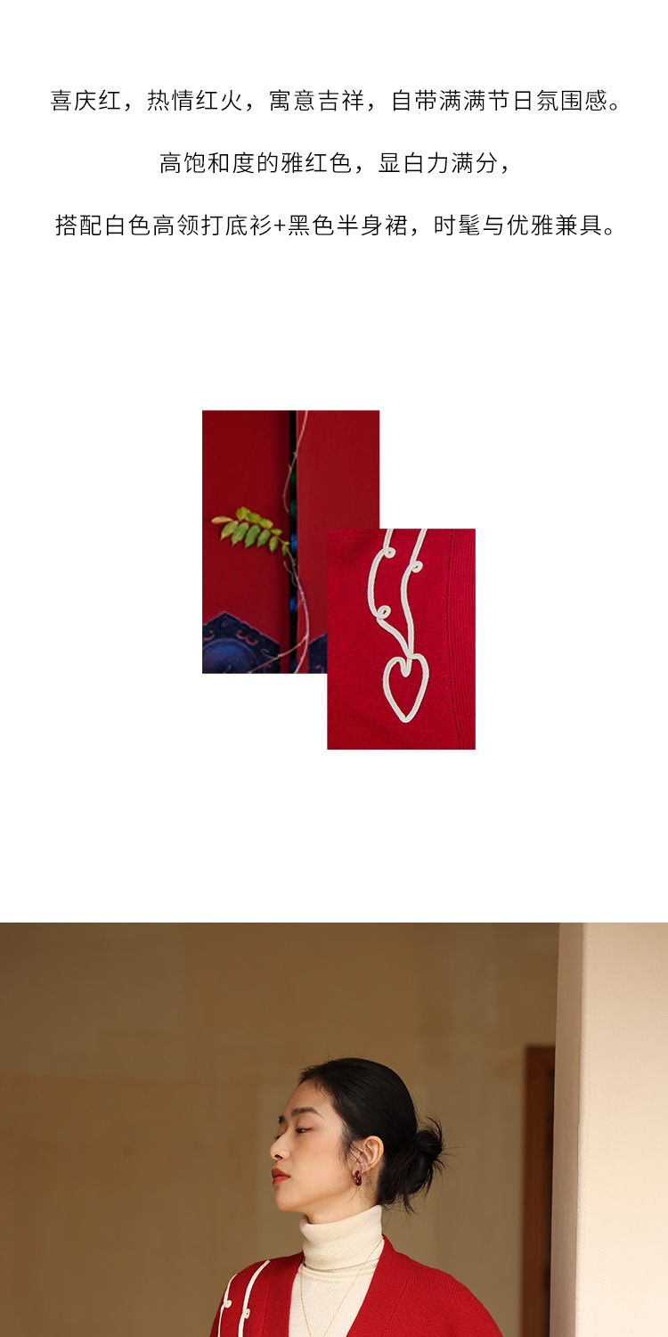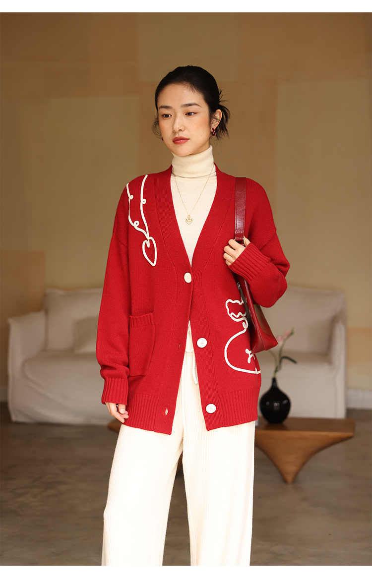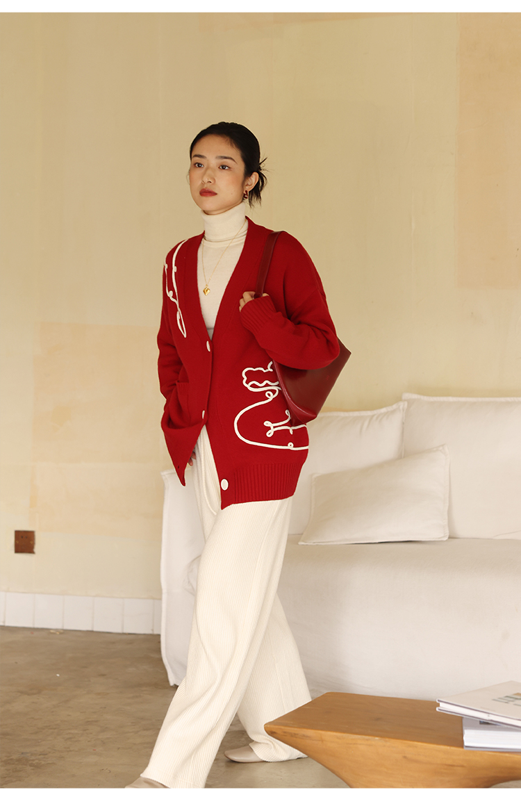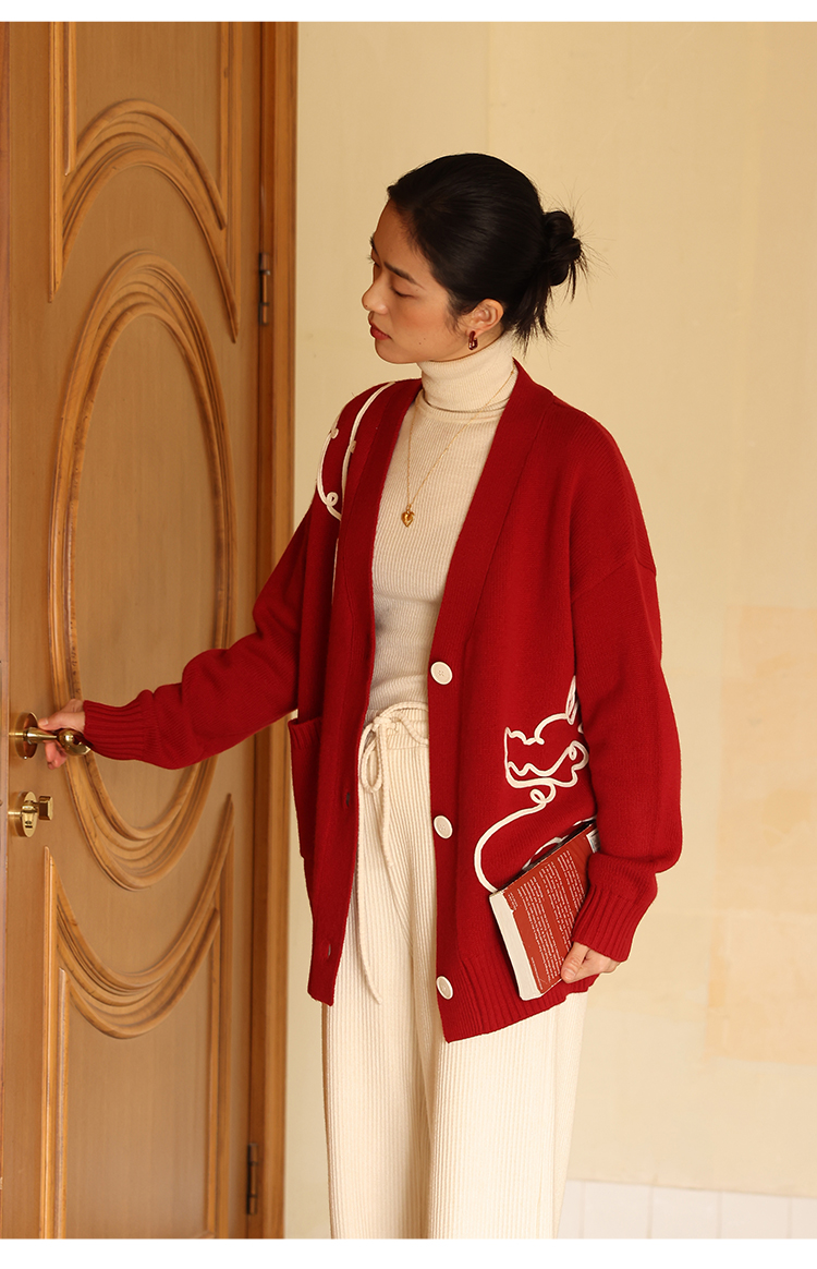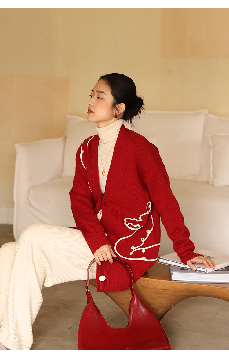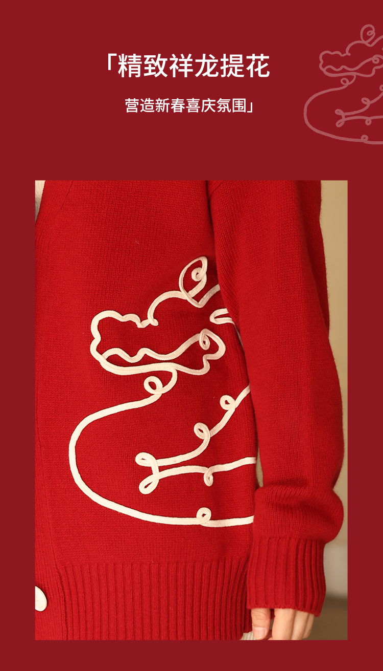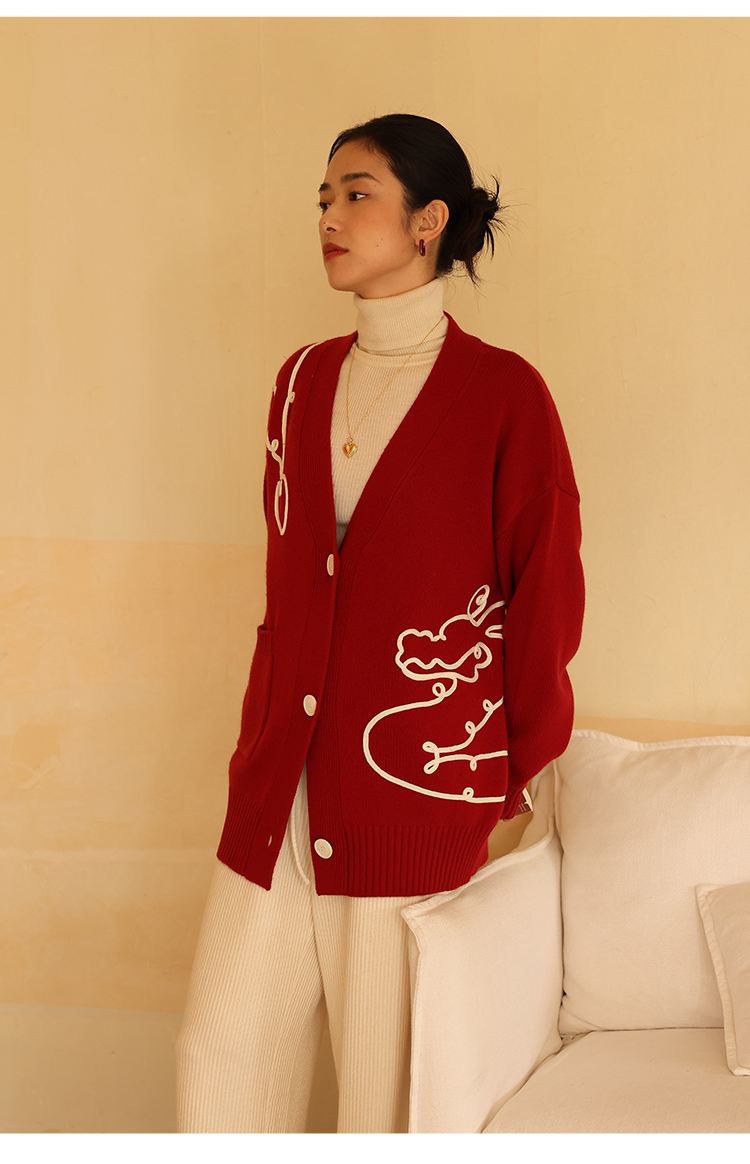 HeyDress祥龙提花针织开衫女秋冬法式V领宽松羊毛衫红色上衣外套