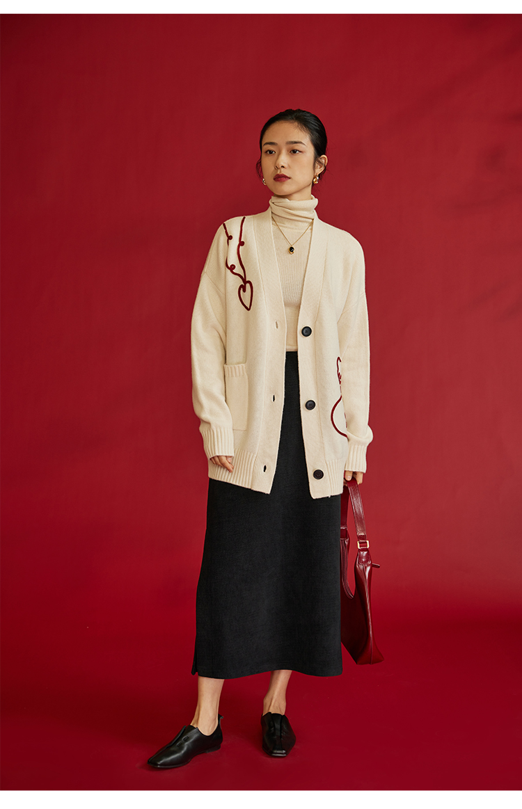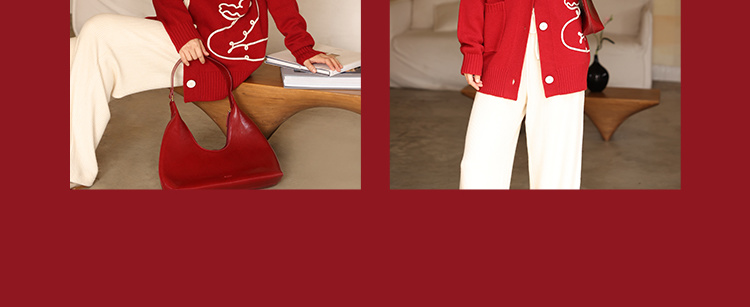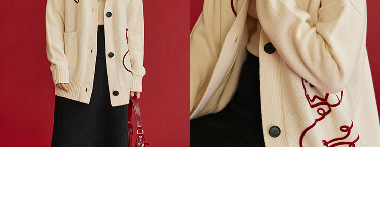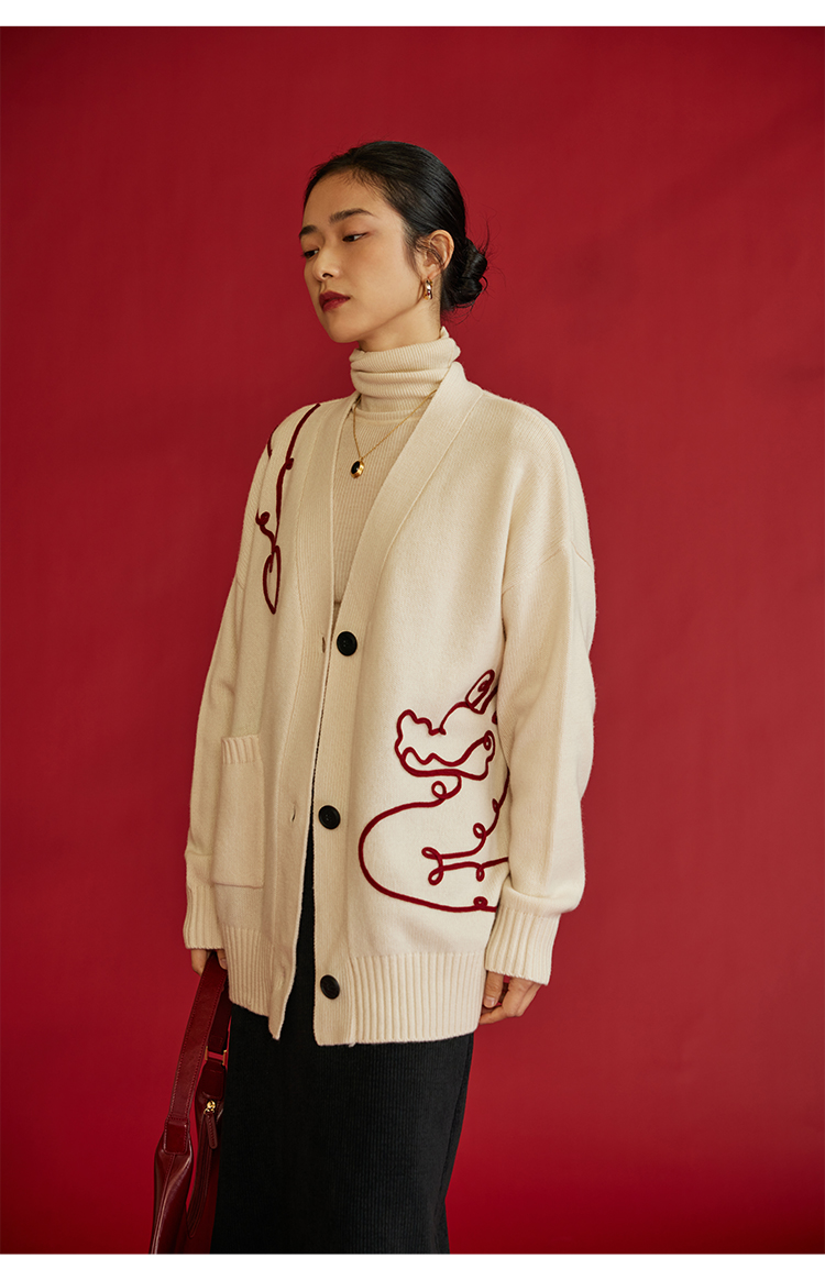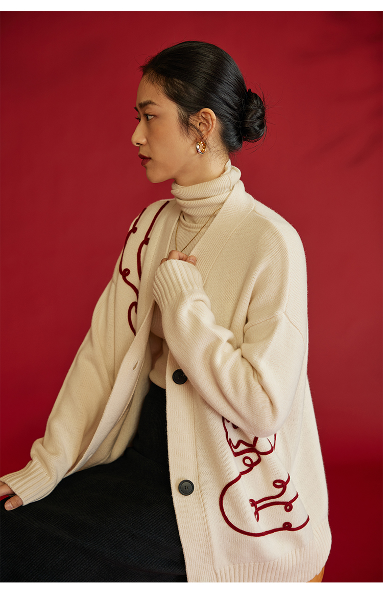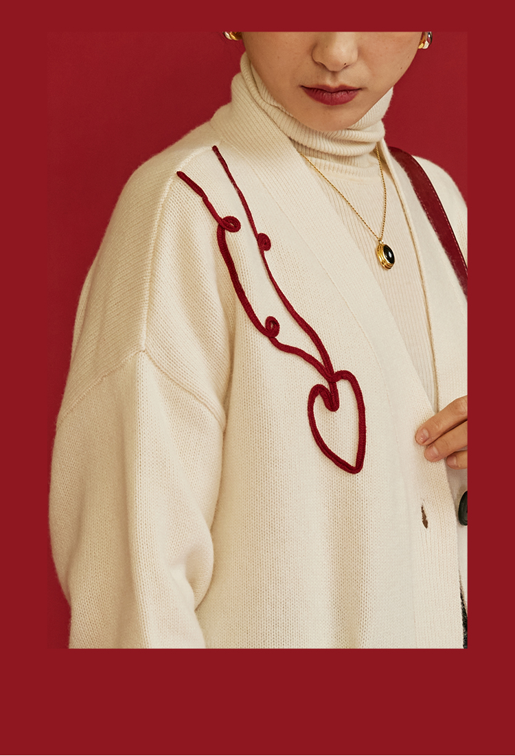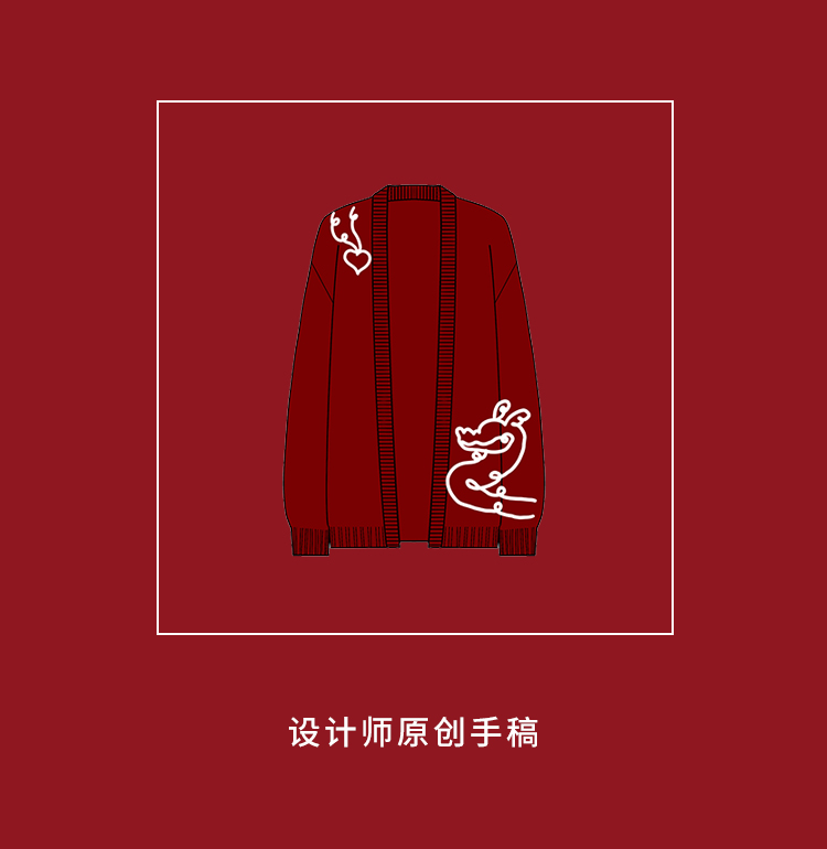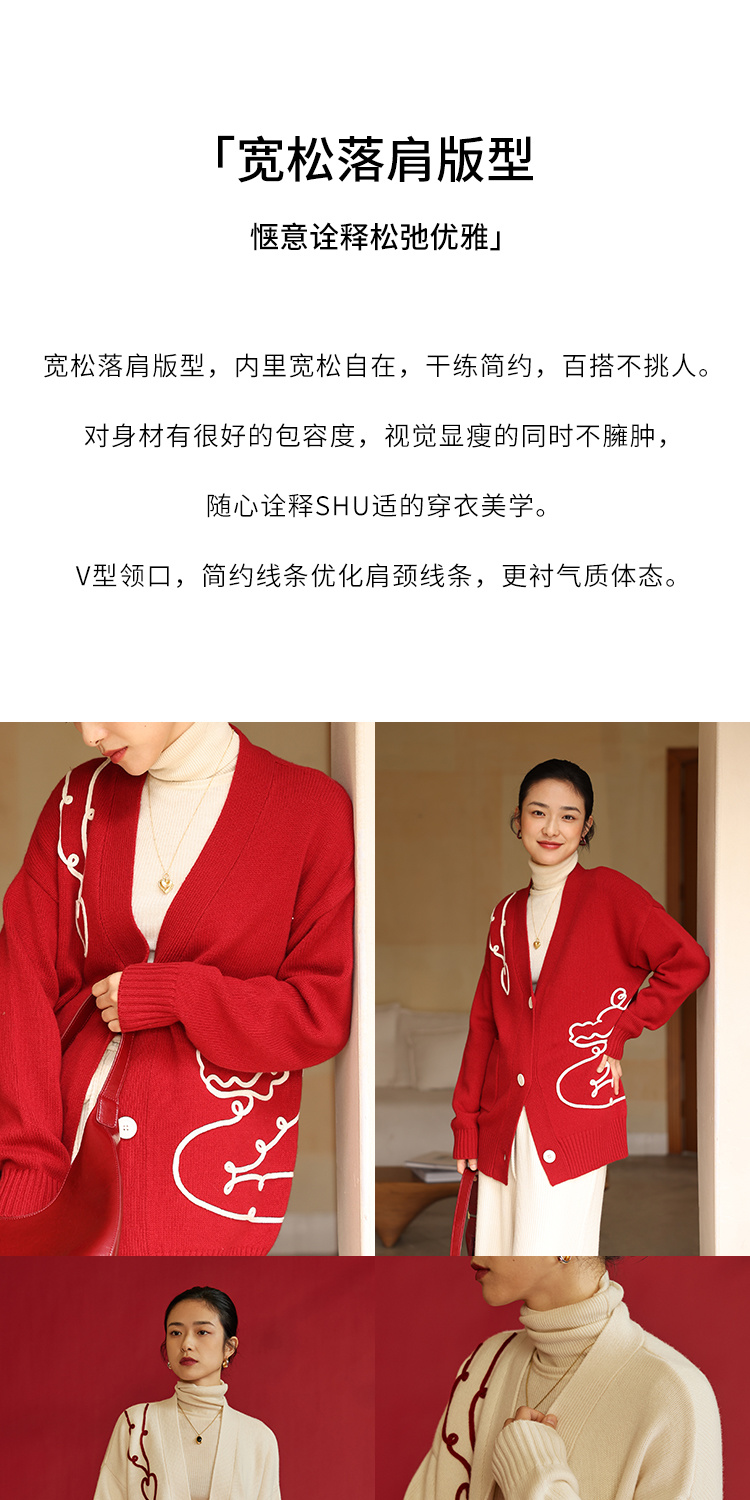 HeyDress祥龙提花针织开衫女秋冬法式V领宽松羊毛衫红色上衣外套