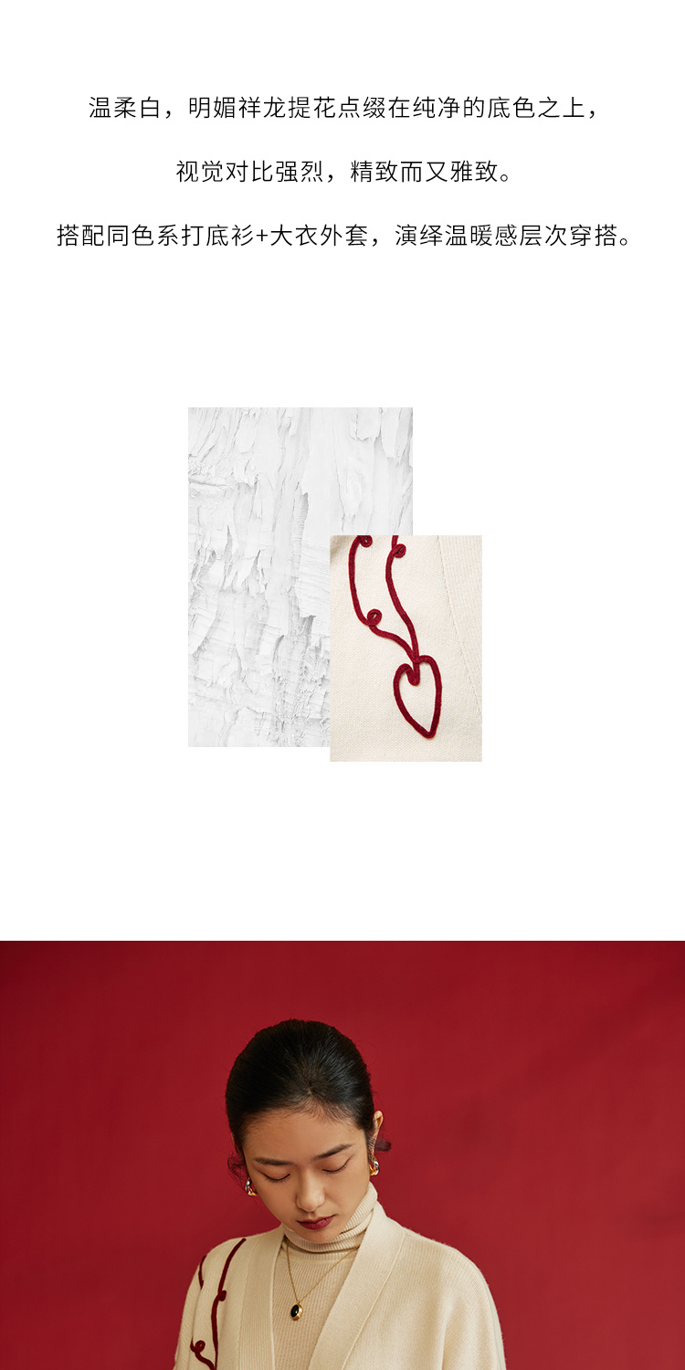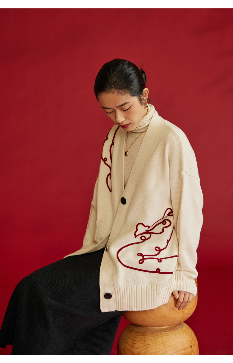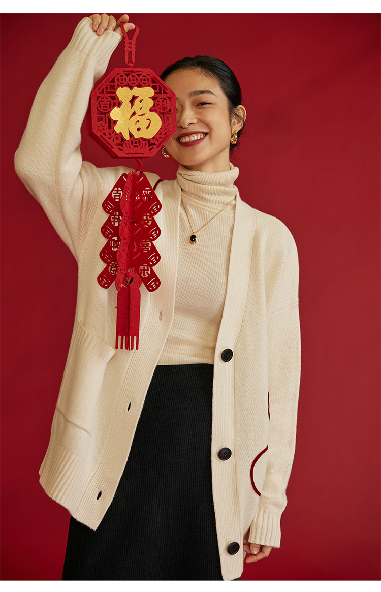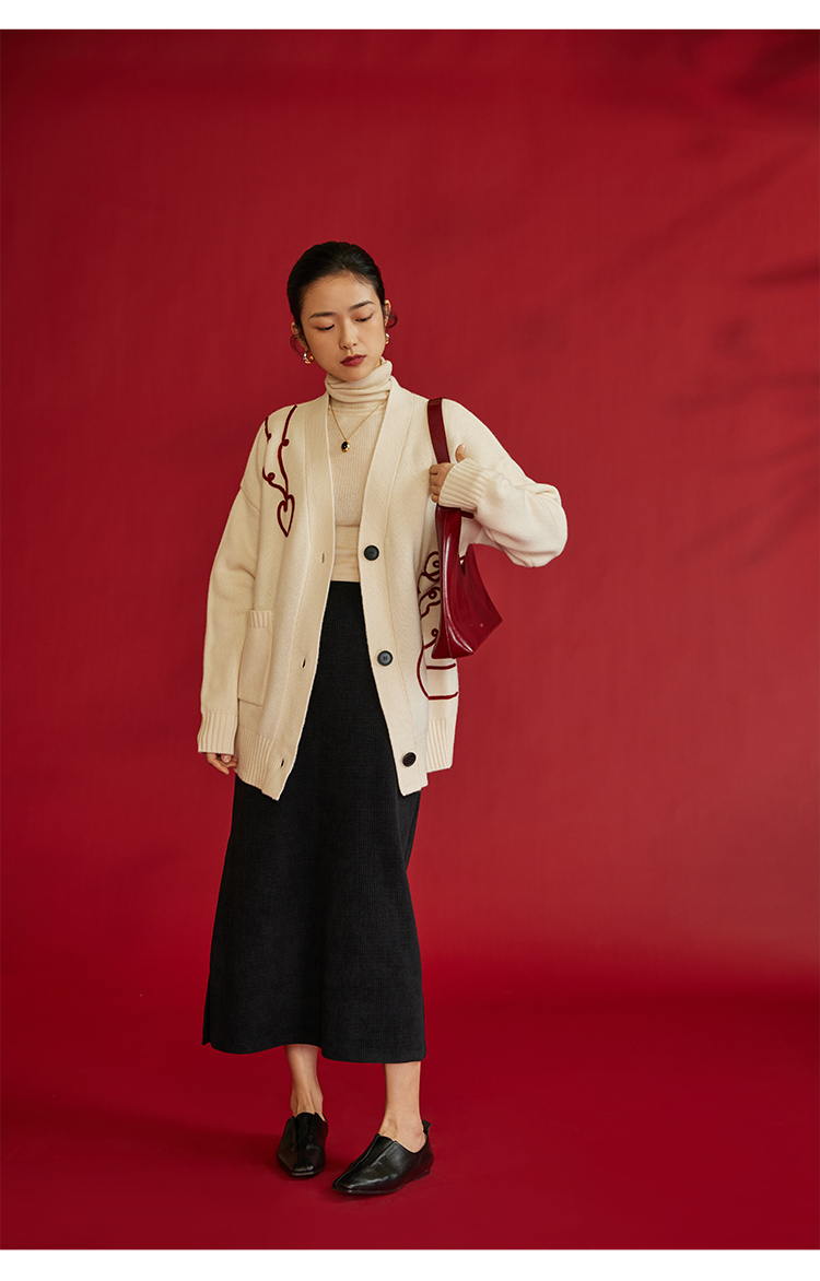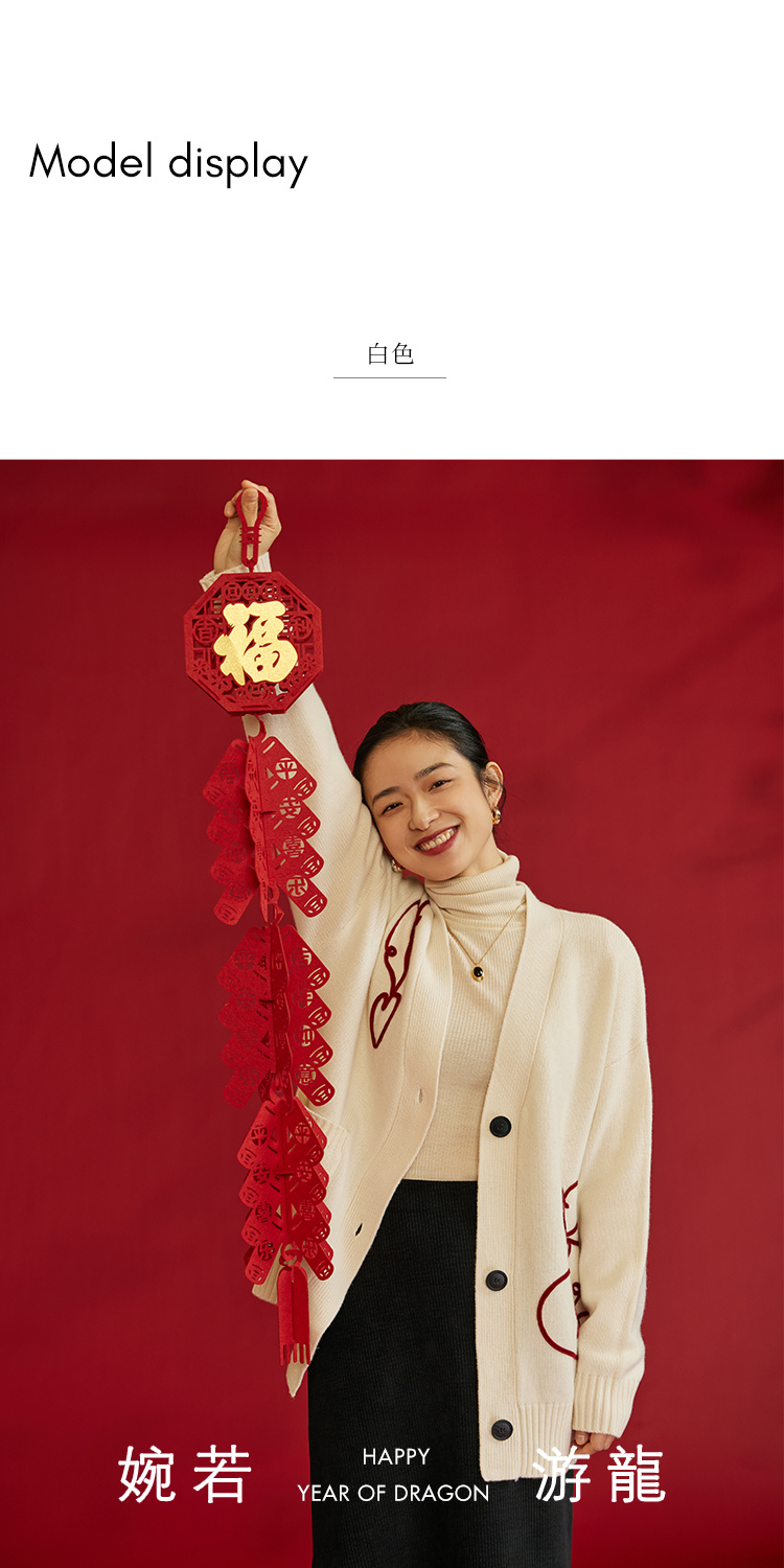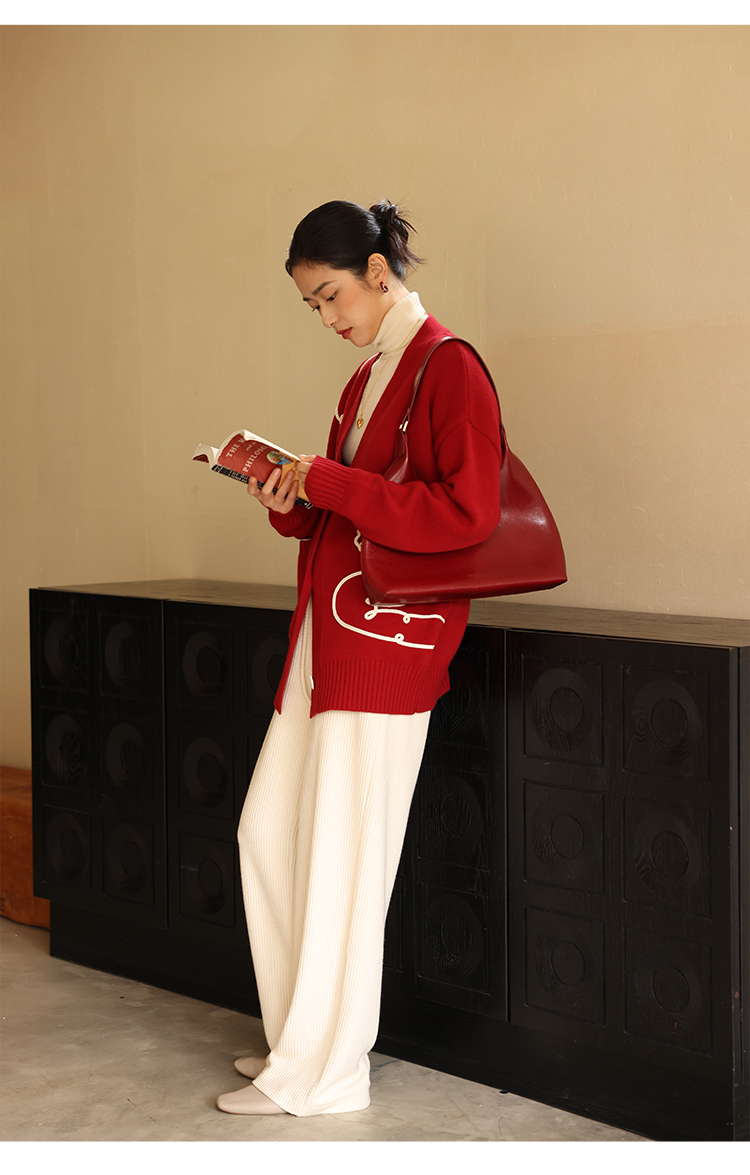 HeyDress祥龙提花针织开衫女秋冬法式V领宽松羊毛衫红色上衣外套