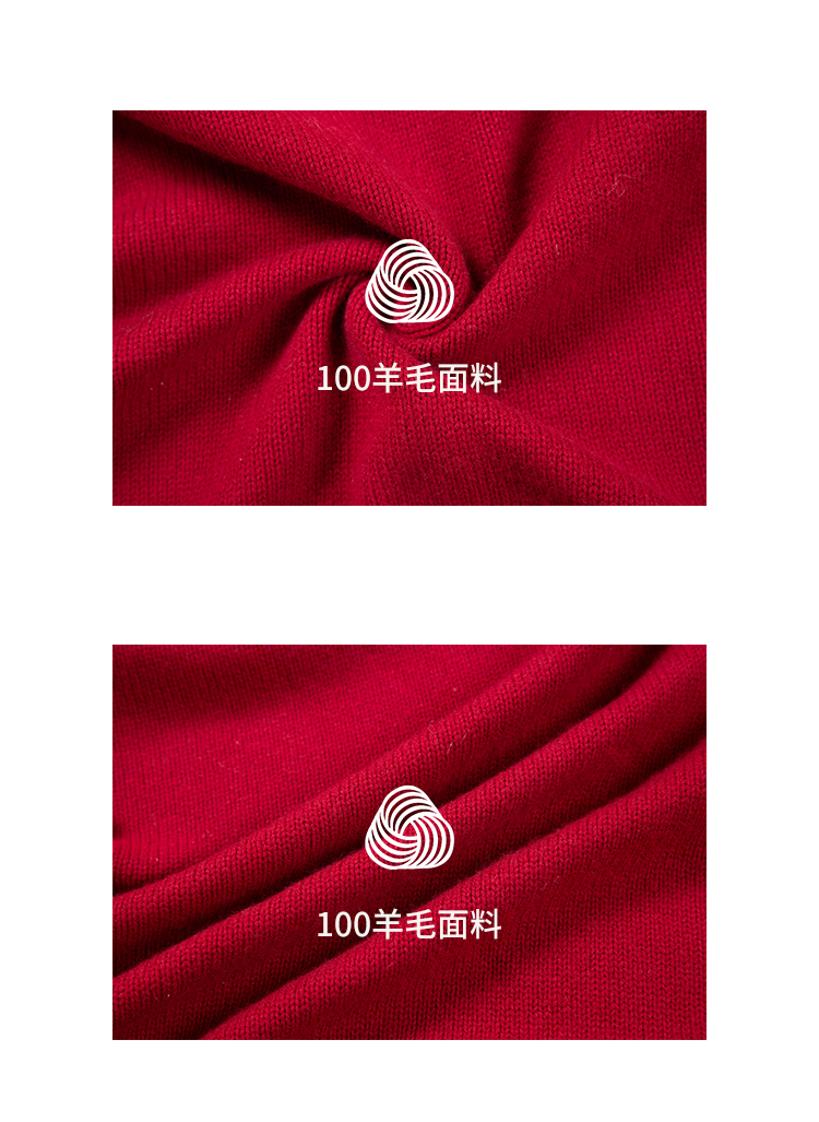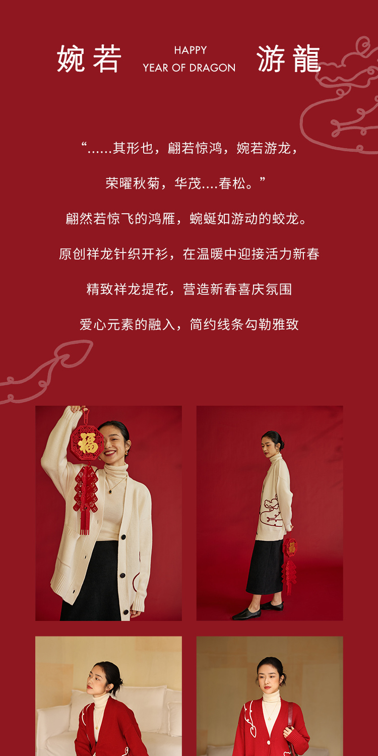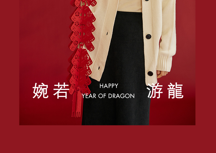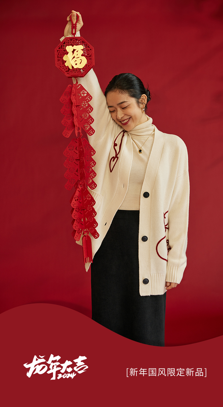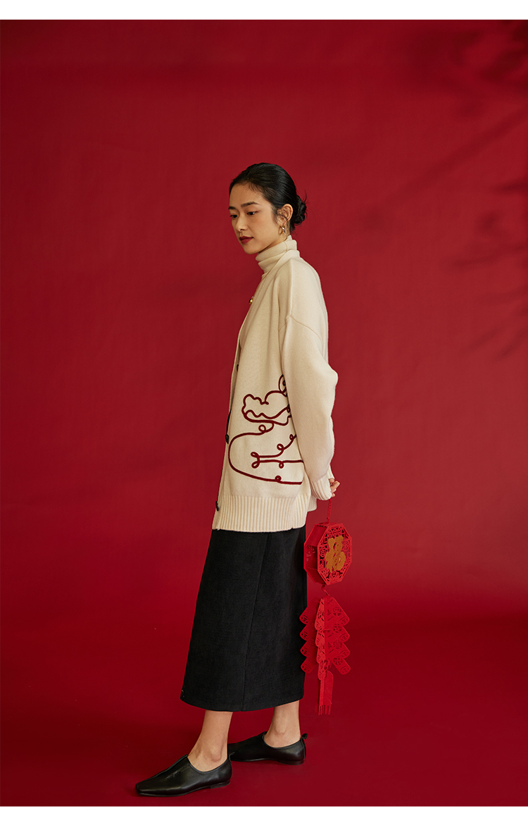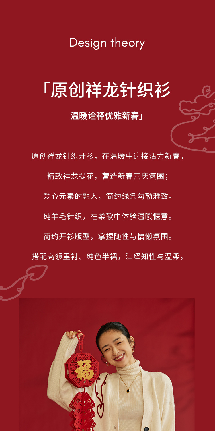HeyDress祥龙提花针织开衫女秋冬法式V领宽松羊毛衫红色上衣外套