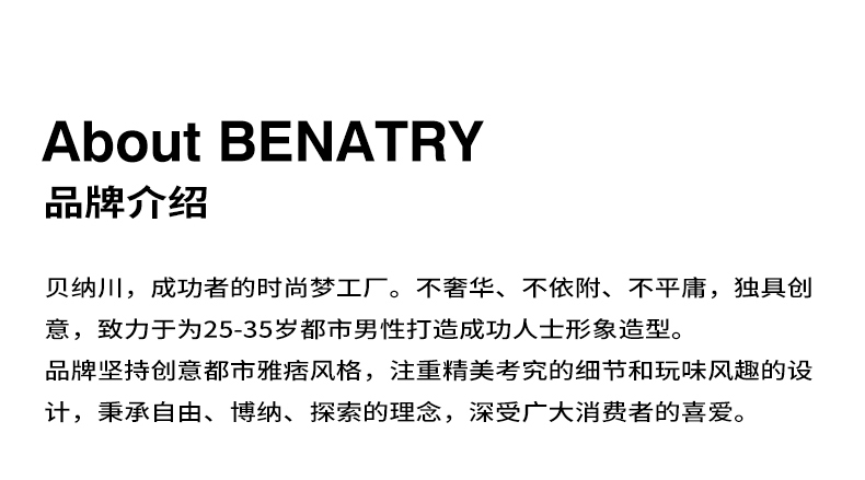 - 贝纳川男装致力于为不盲目追随潮流,坚持自己风格,注重细节与配饰搭配的而立之年轻熟男打造时髦、简约、轻松、真实的着衣风格。