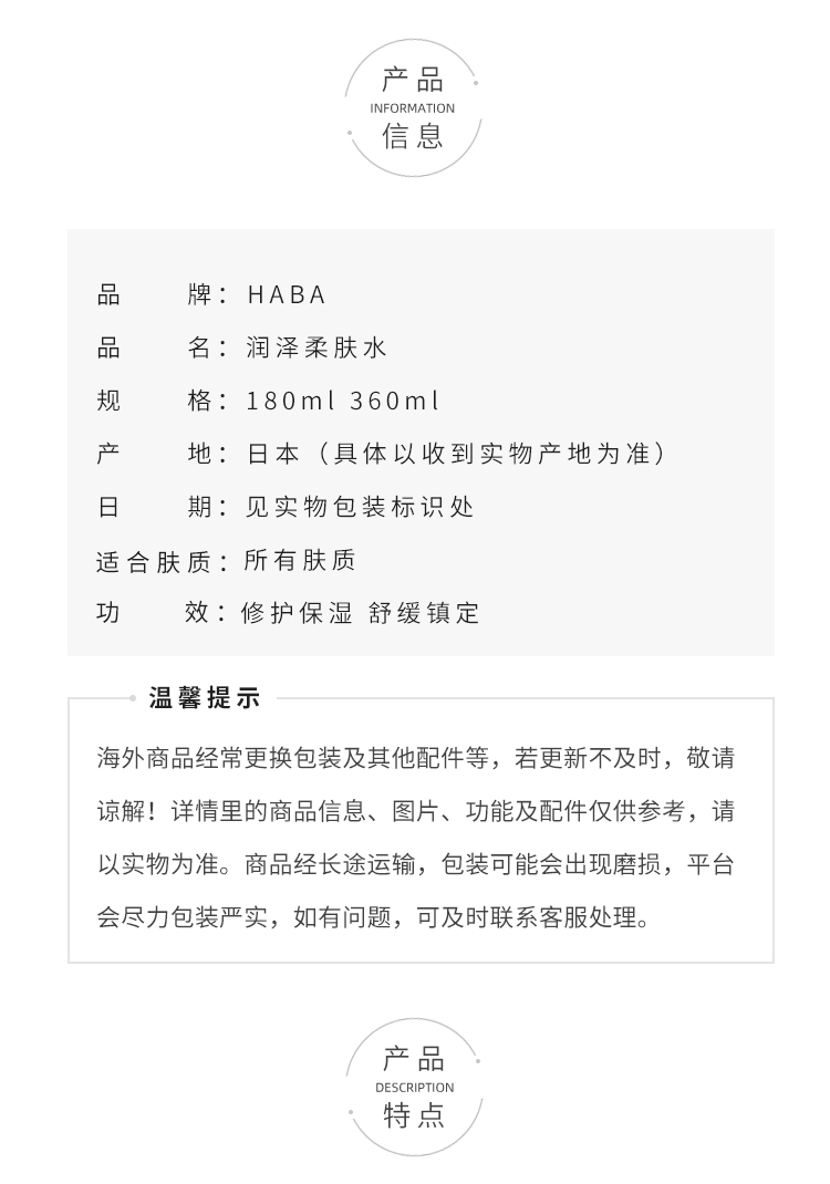 HABA润泽柔肤水 化妆水爽肤水女温和护肤不刺激敏感肌可用 柔肤水180ml【CDF】