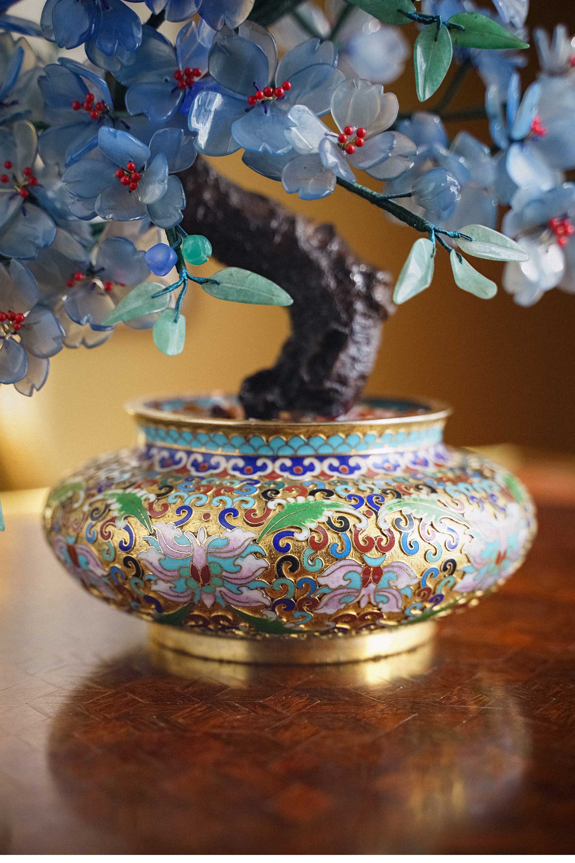 【已售】独角鹿西洋古董 20世纪中国创汇时期出品宝相花纹景泰蓝盆装饰「紫海棠」珍宝像生盆景