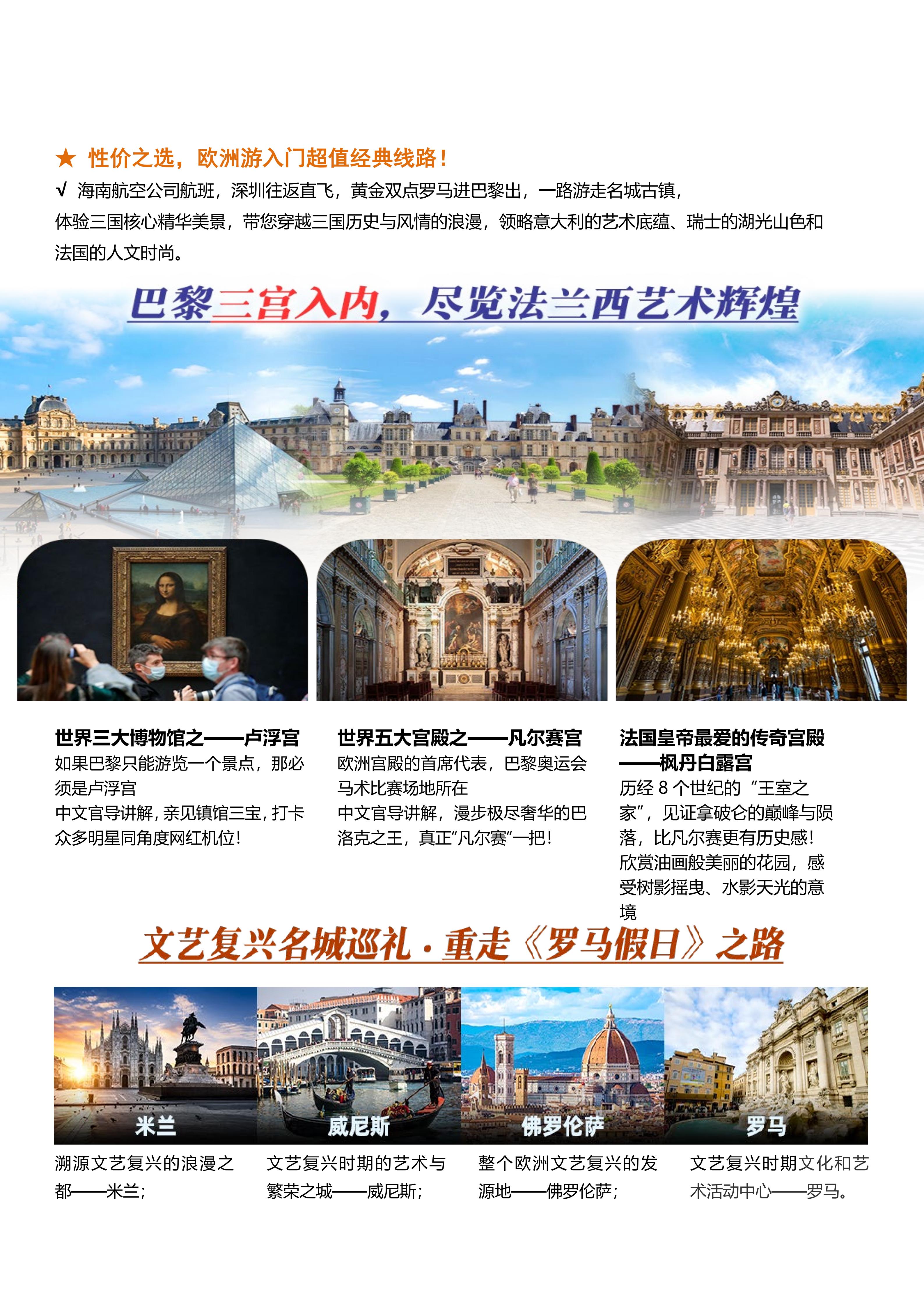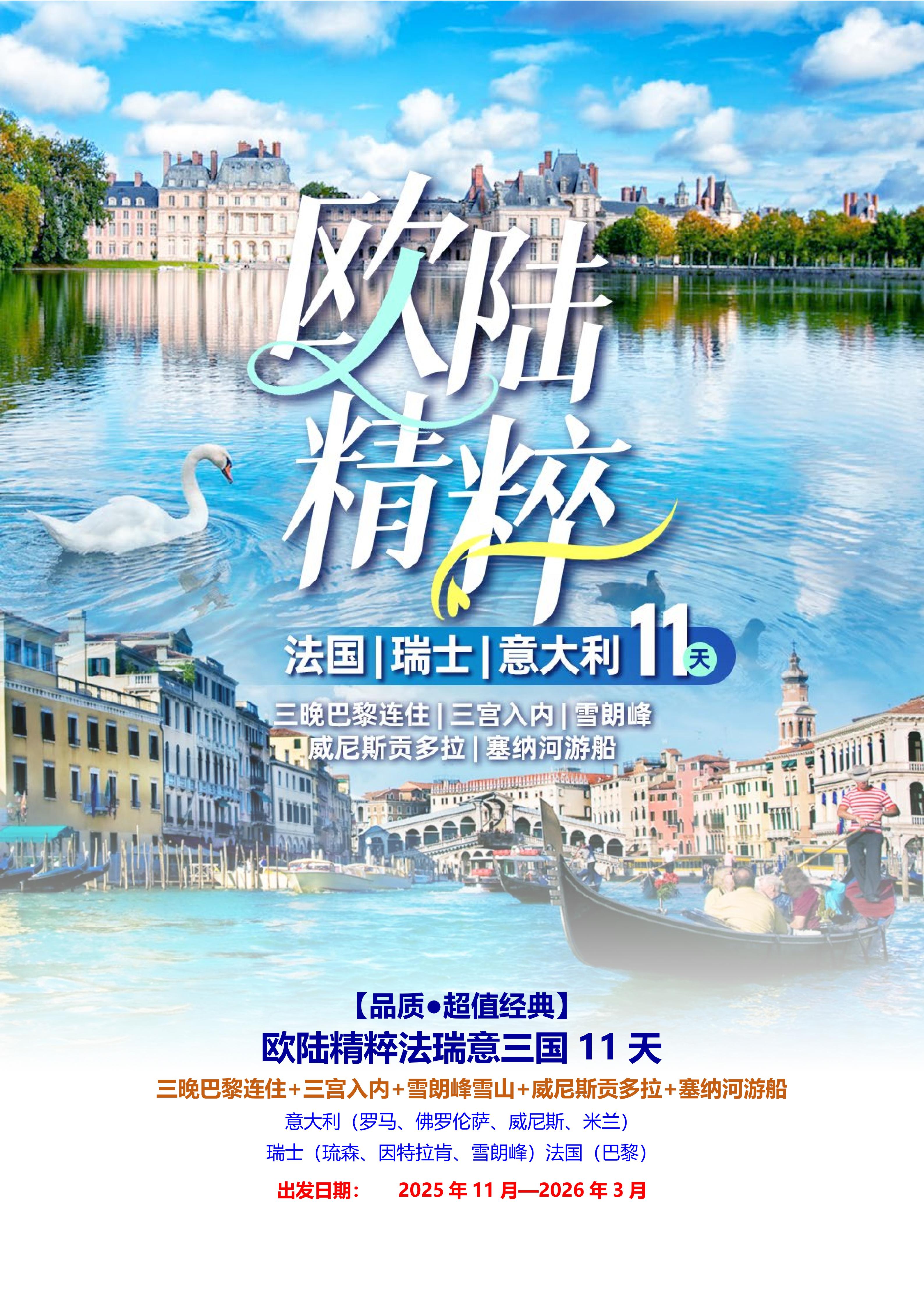 【春节、寒假】<西欧●法国+瑞士+意大利三国11天-深圳直飞往返>卢浮宫、凡尔赛宫、枫丹白露宫、圣母百花大教堂、威尼斯贡多拉游船、米兰大教堂、琉森、因特拉肯小镇、雪朗峰、塞纳河游船