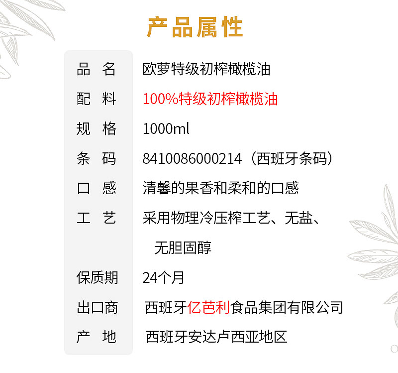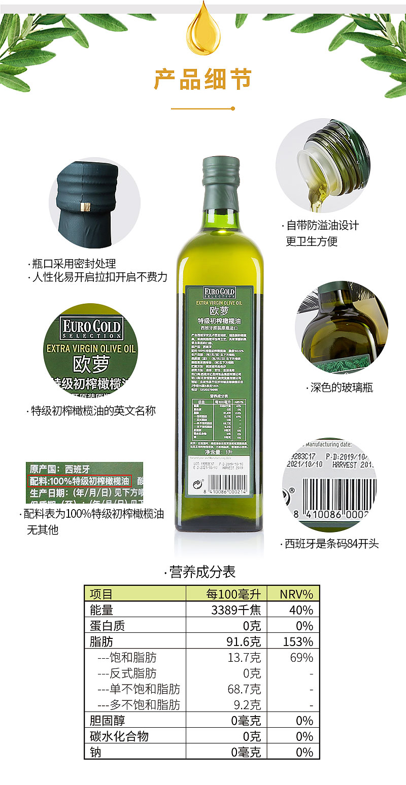 【中欧班列直供】西班牙原装进口欧莱欧特级初榨橄榄油1L/瓶